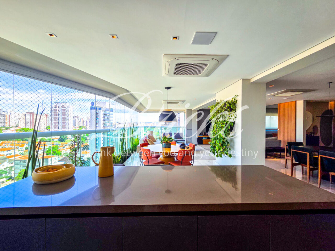 A sacada em L integra os ambientes e revela uma área gourmet ideal para receber, celebrar e criar momentos especiais com uma vista privilegiada da cidade.
