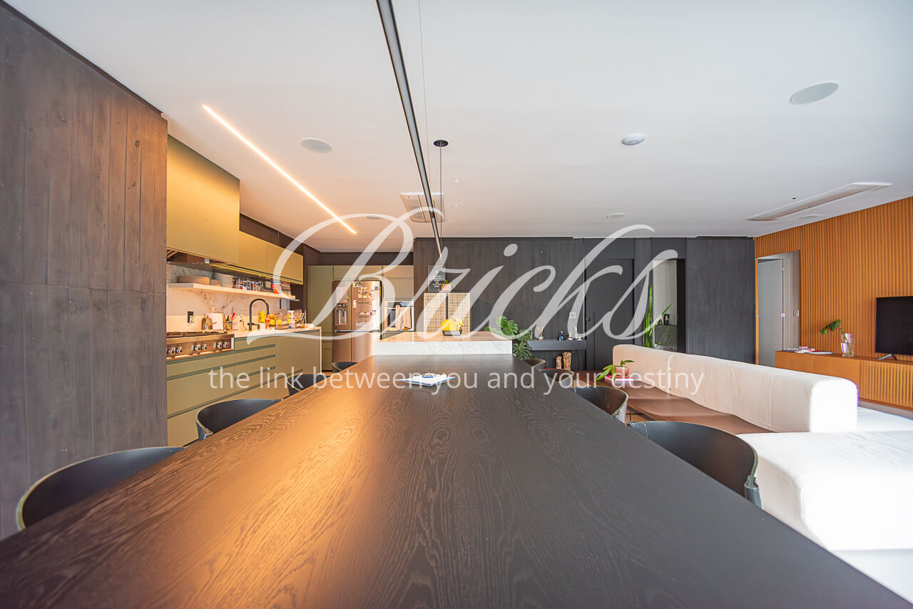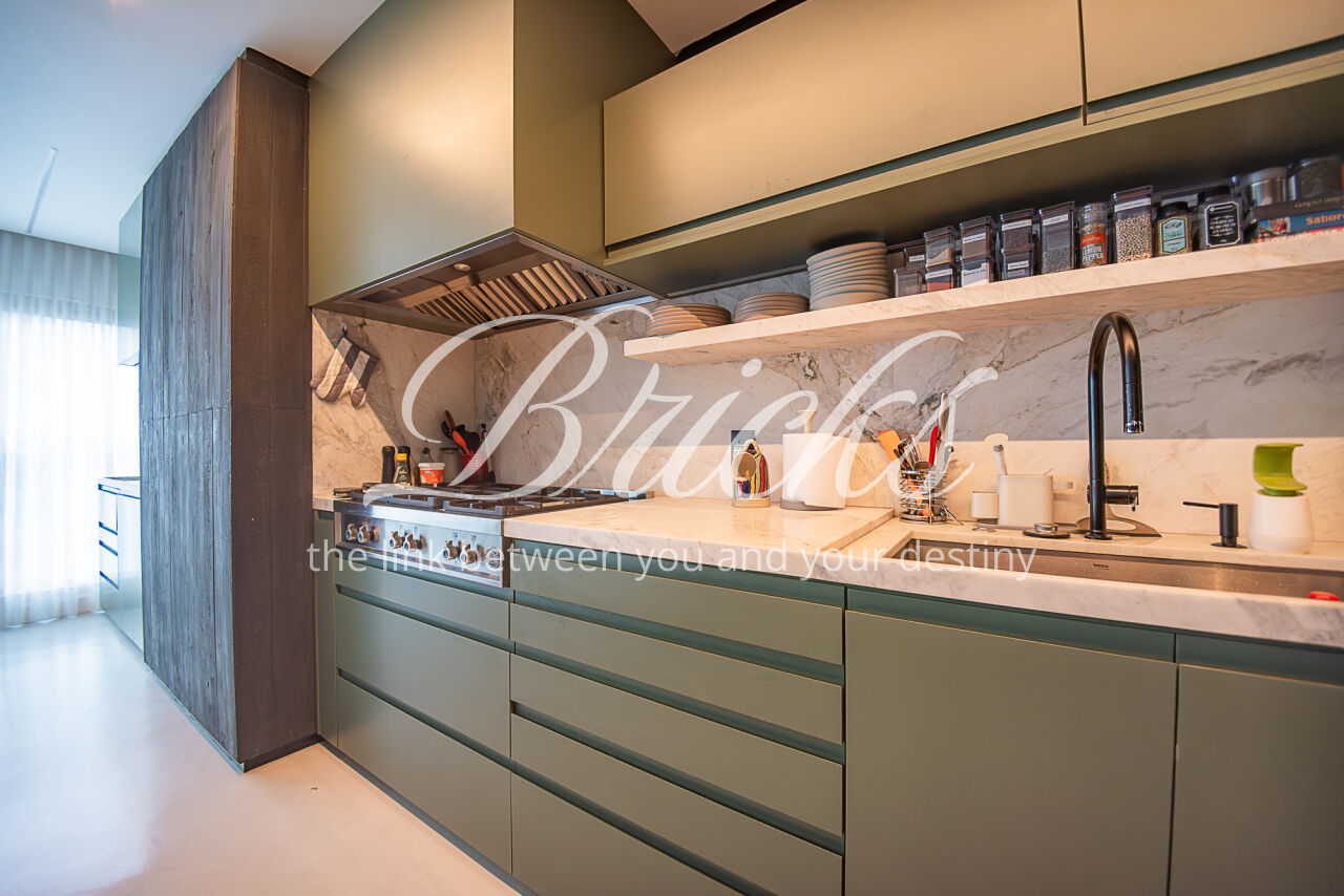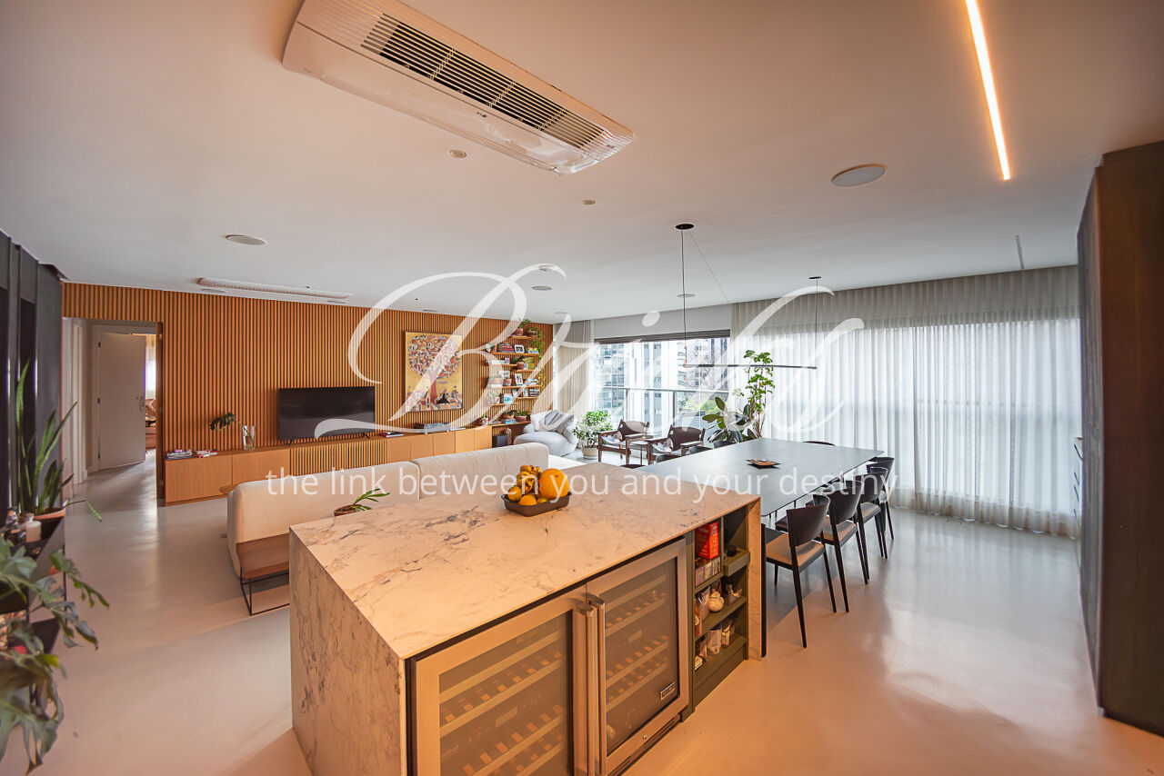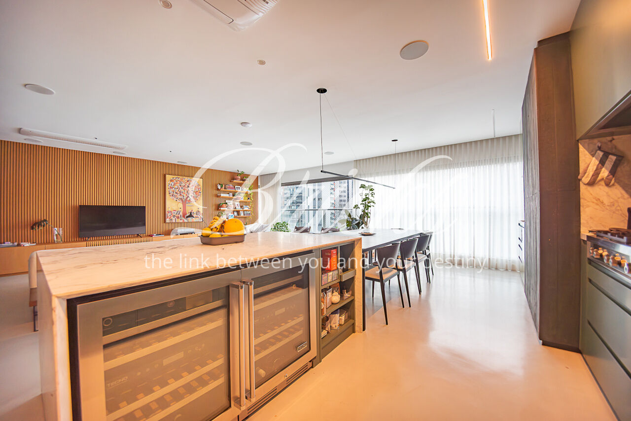 O imóvel conta com projeto arquitetônico assinado, acabamentos de alto padrão, ar-condicionado em todos os dormitórios e na sala, hall privativo com depósito embutido e marcenaria planejada em todos os ambientes. Cozinha equipada com eletrodomésticos embutidos de alto desempenho, incluindo coifa Tuboar de alta potência, máquina lava-louças Gorenje, forno elétrico Tecno, cooktop Bertazzoni e adegas duplas Tecno.