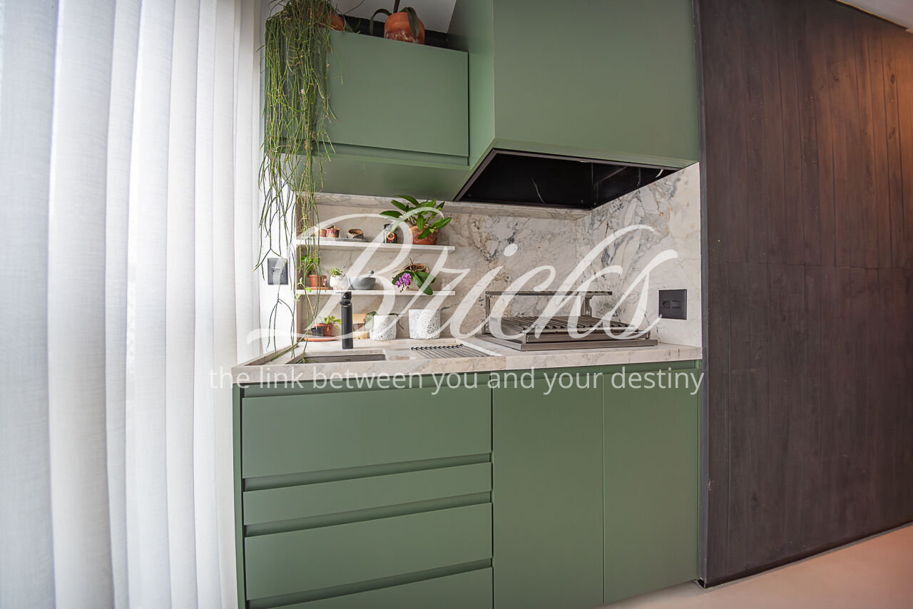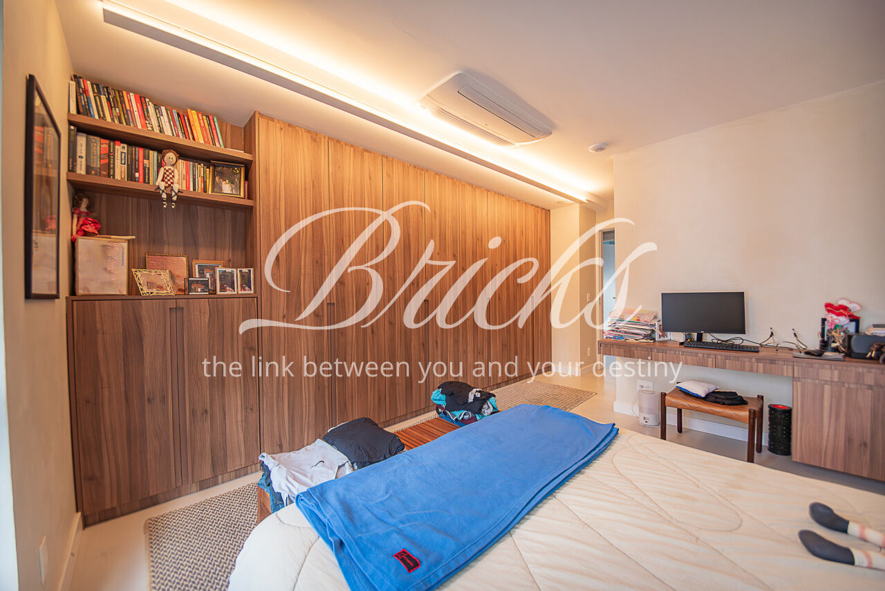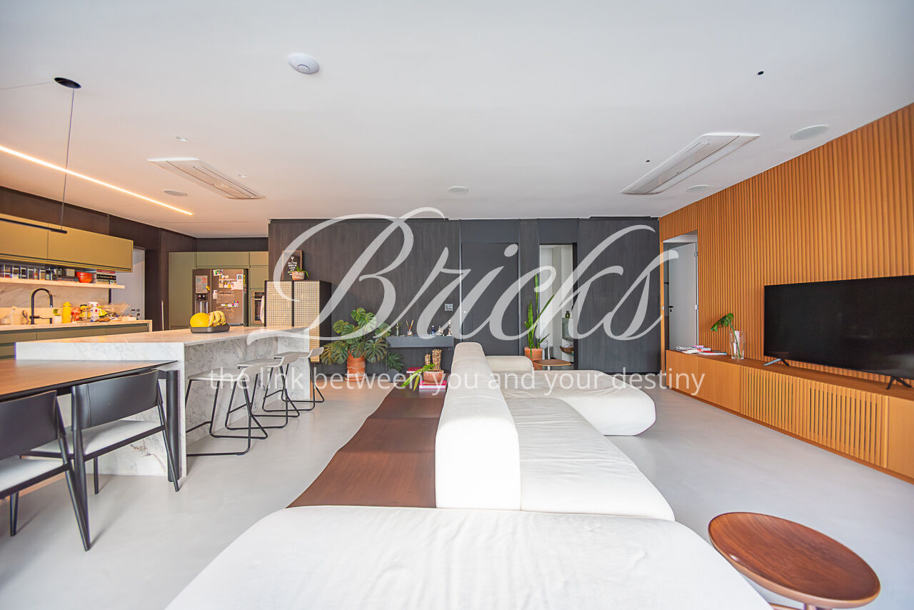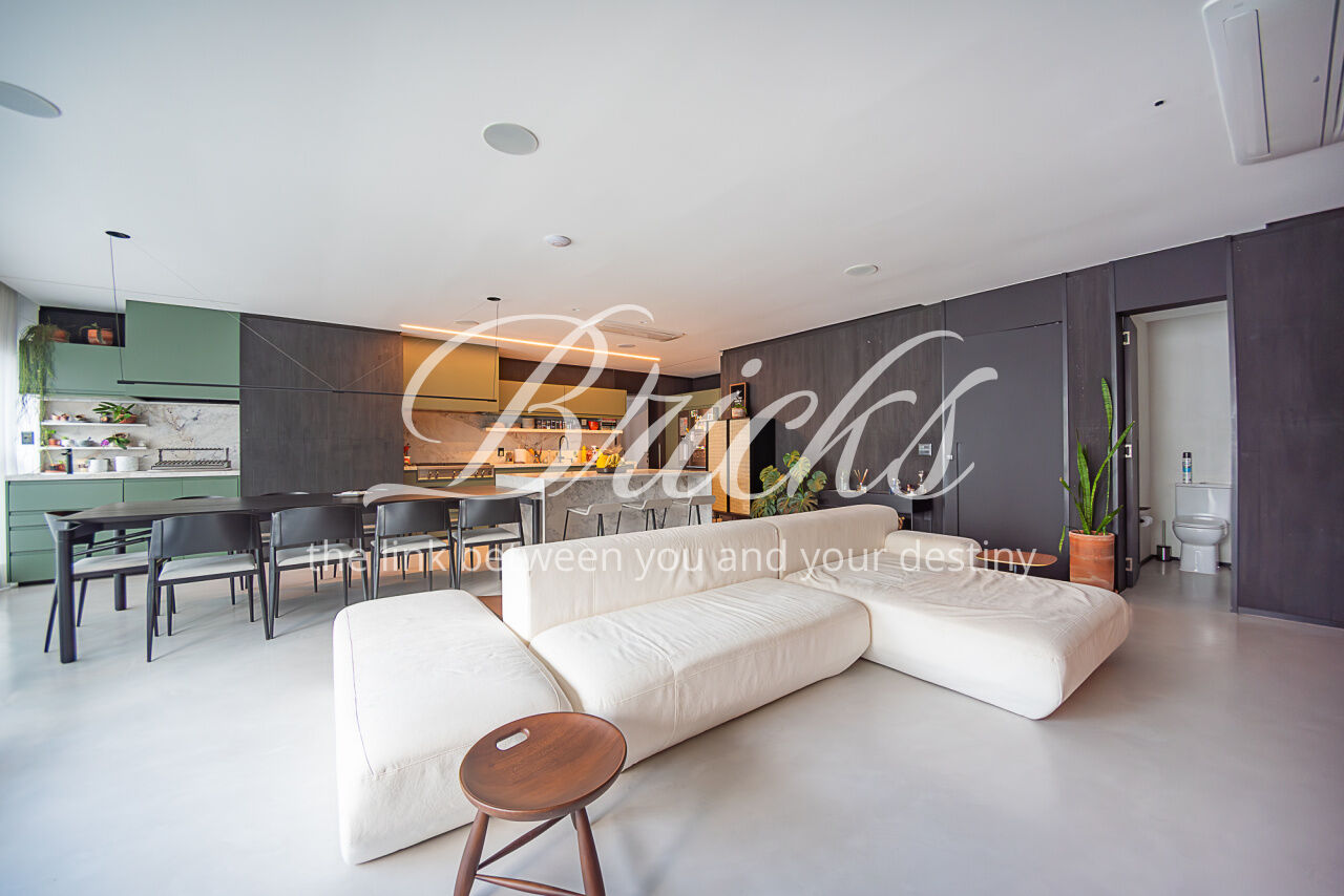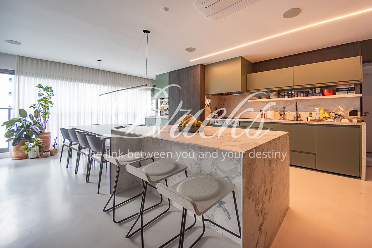 O imóvel conta com projeto arquitetônico assinado, acabamentos de alto padrão, ar-condicionado em todos os dormitórios e na sala, hall privativo com depósito embutido e marcenaria planejada em todos os ambientes. Cozinha equipada com eletrodomésticos embutidos de alto desempenho, incluindo coifa Tuboar de alta potência, máquina lava-louças Gorenje, forno elétrico Tecno, cooktop Bertazzoni e adegas duplas Tecno.
