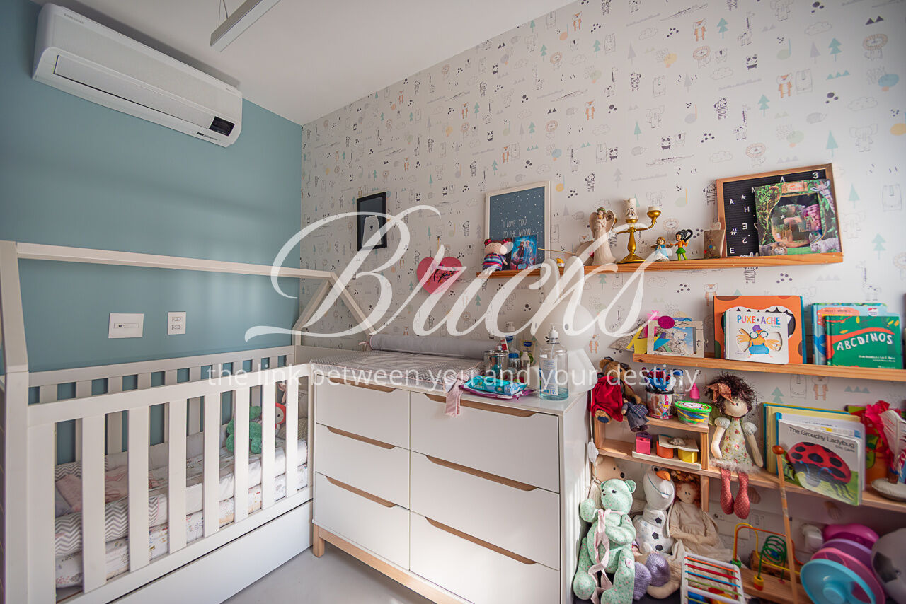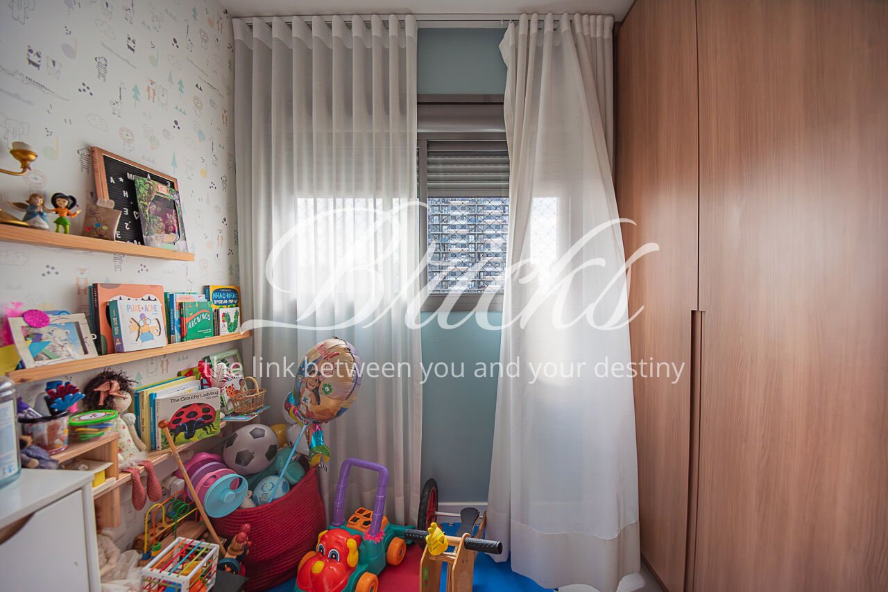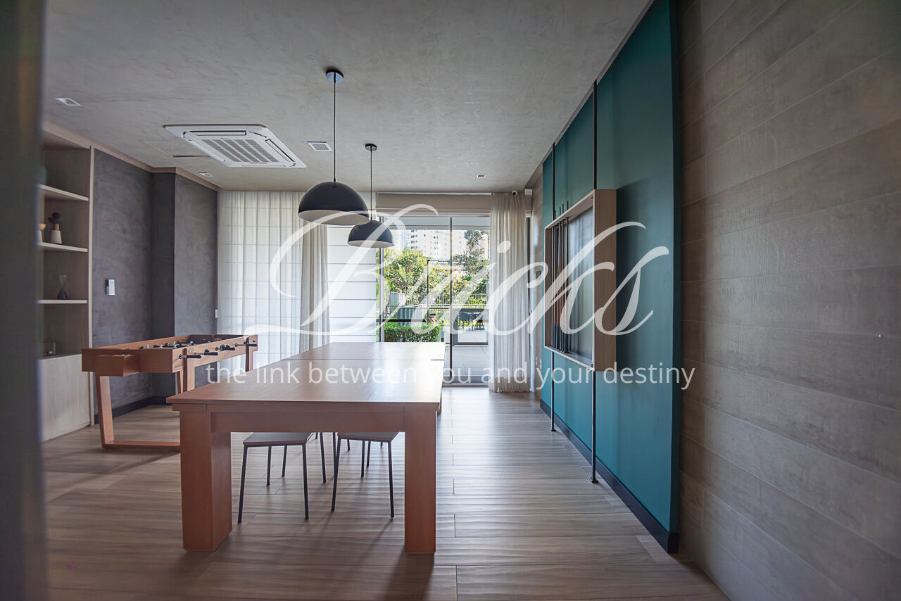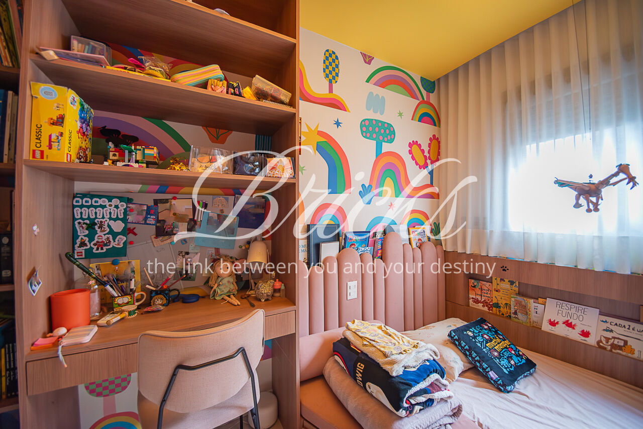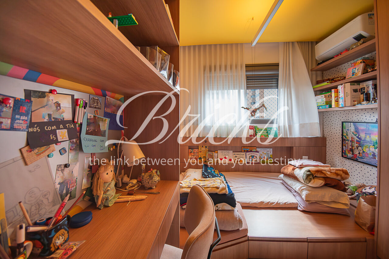 Apartamento localizado no Campo Belo, com área privativa de 143 m². Possui varanda integrada à sala e cozinha, com fechamento em vidro, proporcionando ampla integração entre os ambientes e maior sensação de espaço. São 3 dormitórios, sendo 1 suíte master com cuba dupla, além de lavabo e 2 vagas de garagem fixas. Área de serviço independente. Quarto infantil equipado com cama de visita retrátil.
