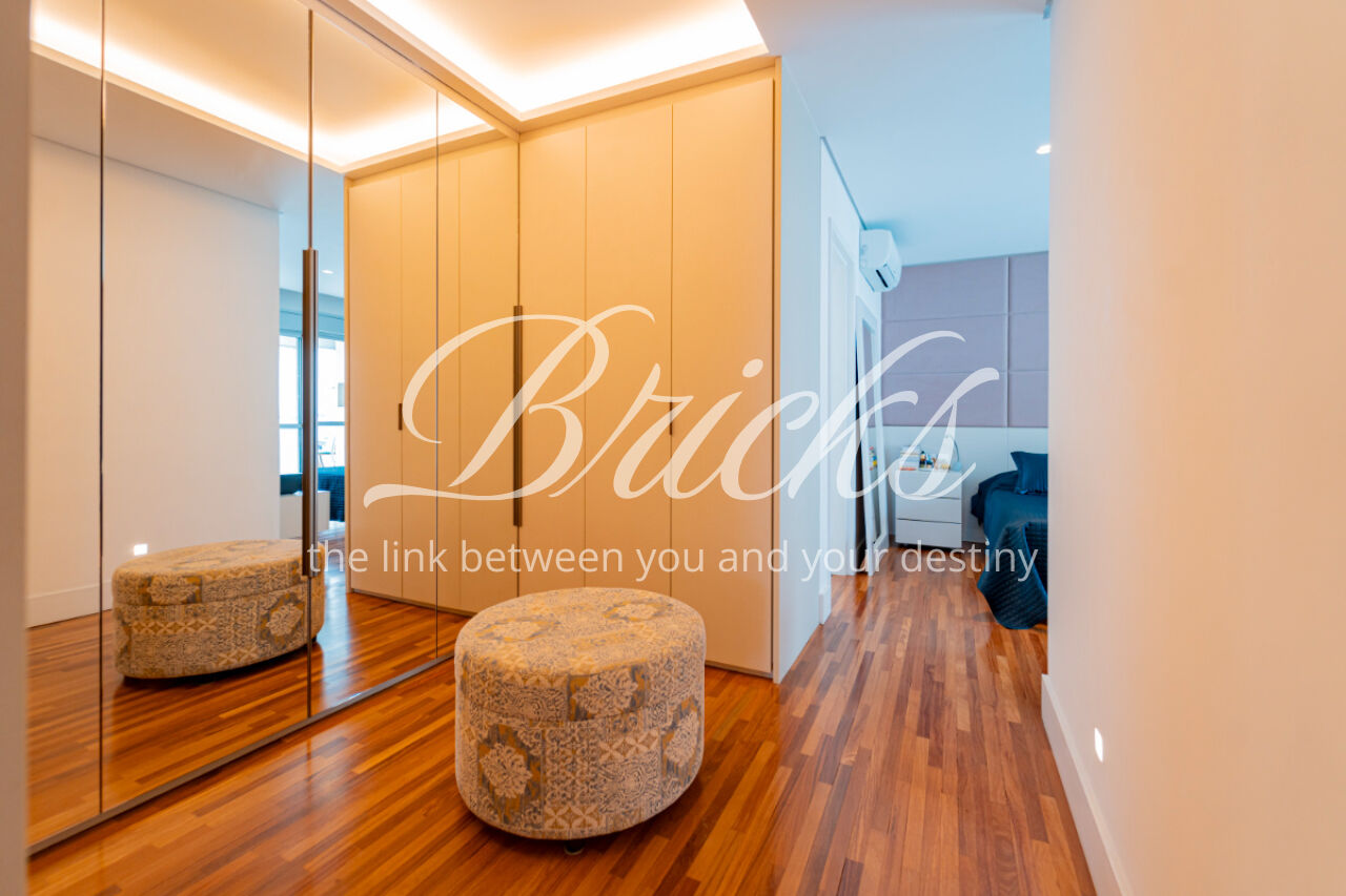 São 3 suítes espaçosas, hall privativo, 4 vagas de garagem fixas (prontas para instalação de carregador para carros elétricos) e depósito privativo. A área social conta com uma varanda gourmet ampla, ideal para receber com conforto, além de cozinha planejada (exceto geladeira), sistema de som ambiente e ar-condicionado central tipo cassete.