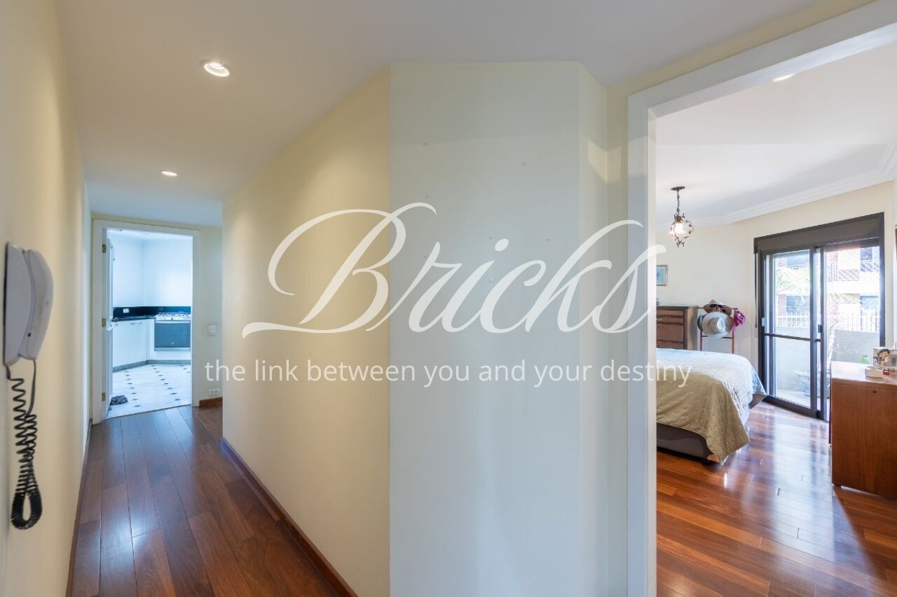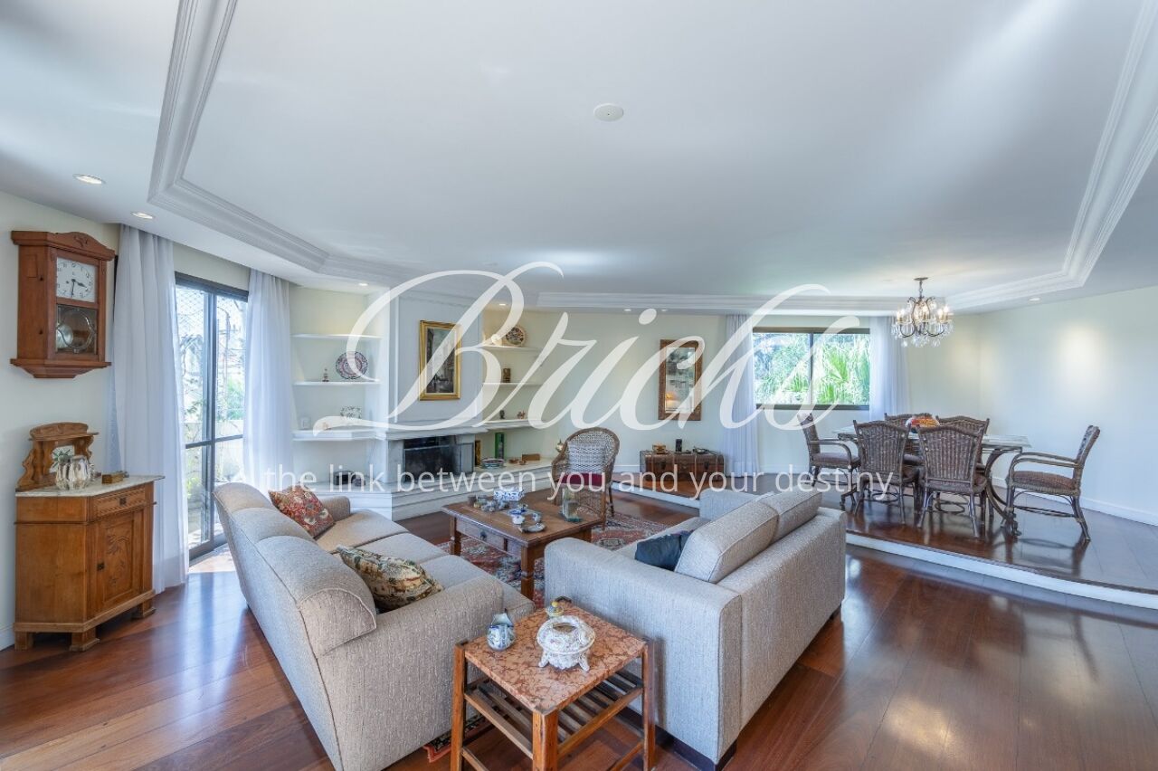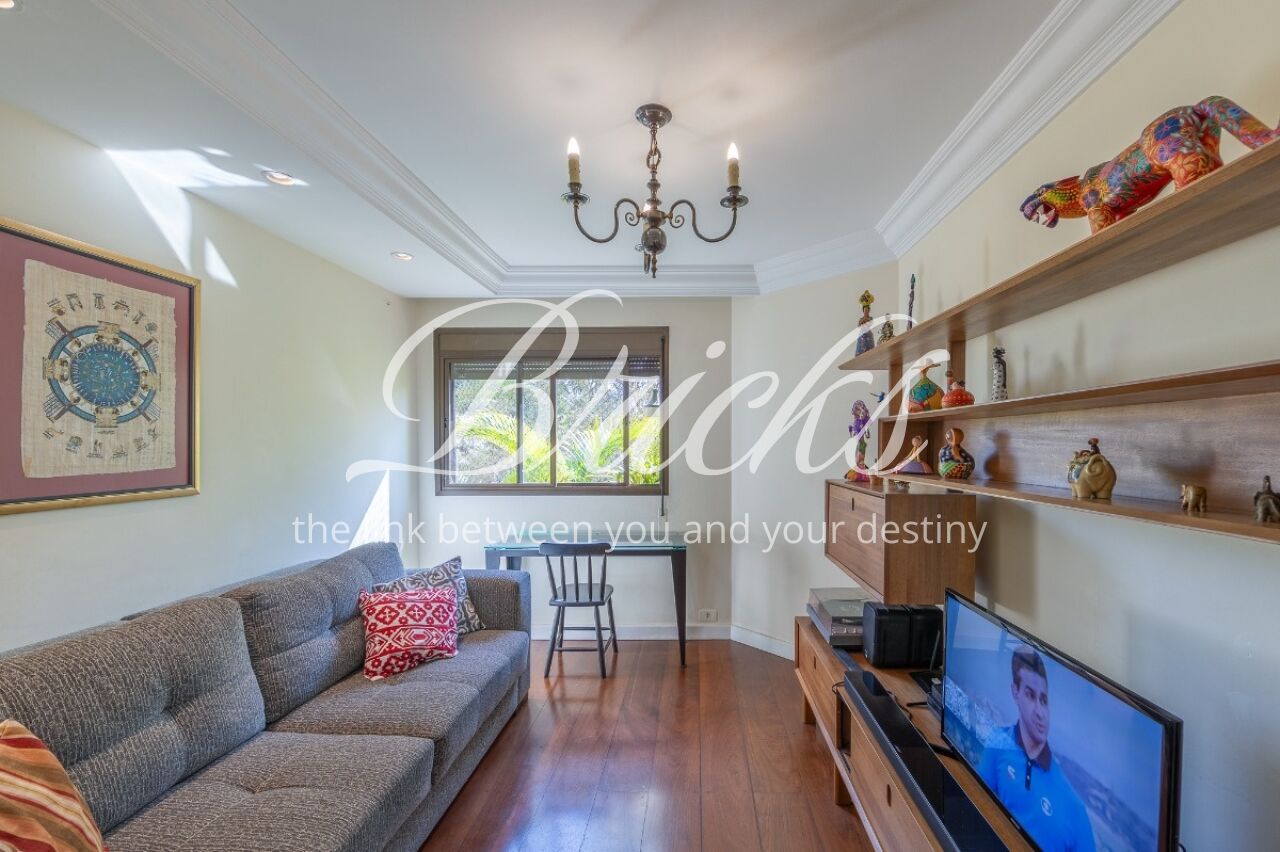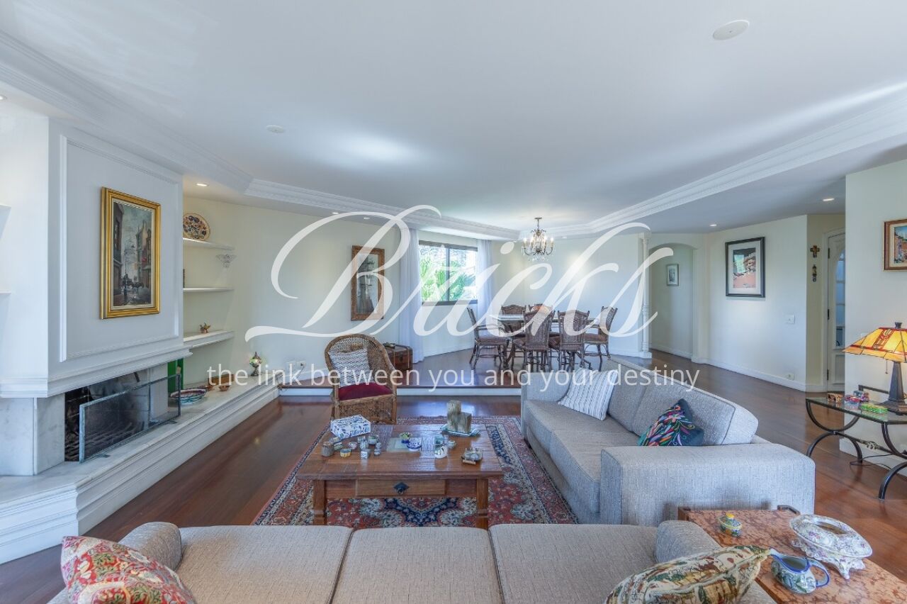 Apartamento com vista privilegiada para a copa das árvores, oferecendo sala ampla para três ambientes, lavabo e terraço generoso. A sala de estar conta com lareira, trazendo aconchego e elegância. A antessala distribui o acesso à área íntima, composta por três suítes com sacada e ar-condicionado, sendo a suíte master equipada com closet. Há ainda uma sala de TV que funciona como quarto adicional, com fácil reversão.