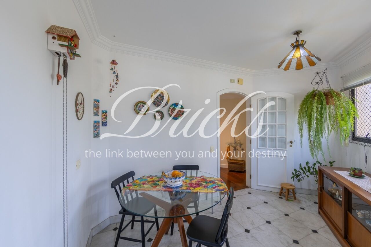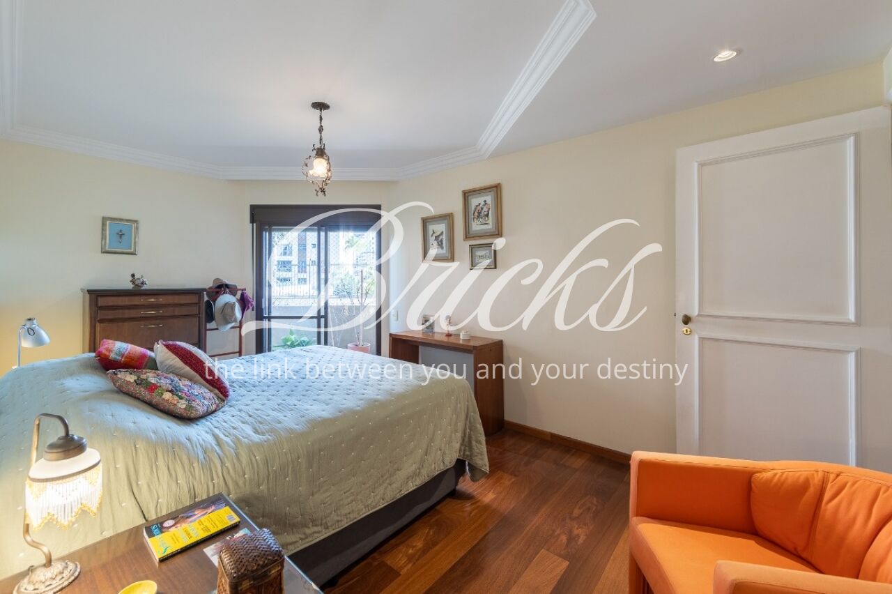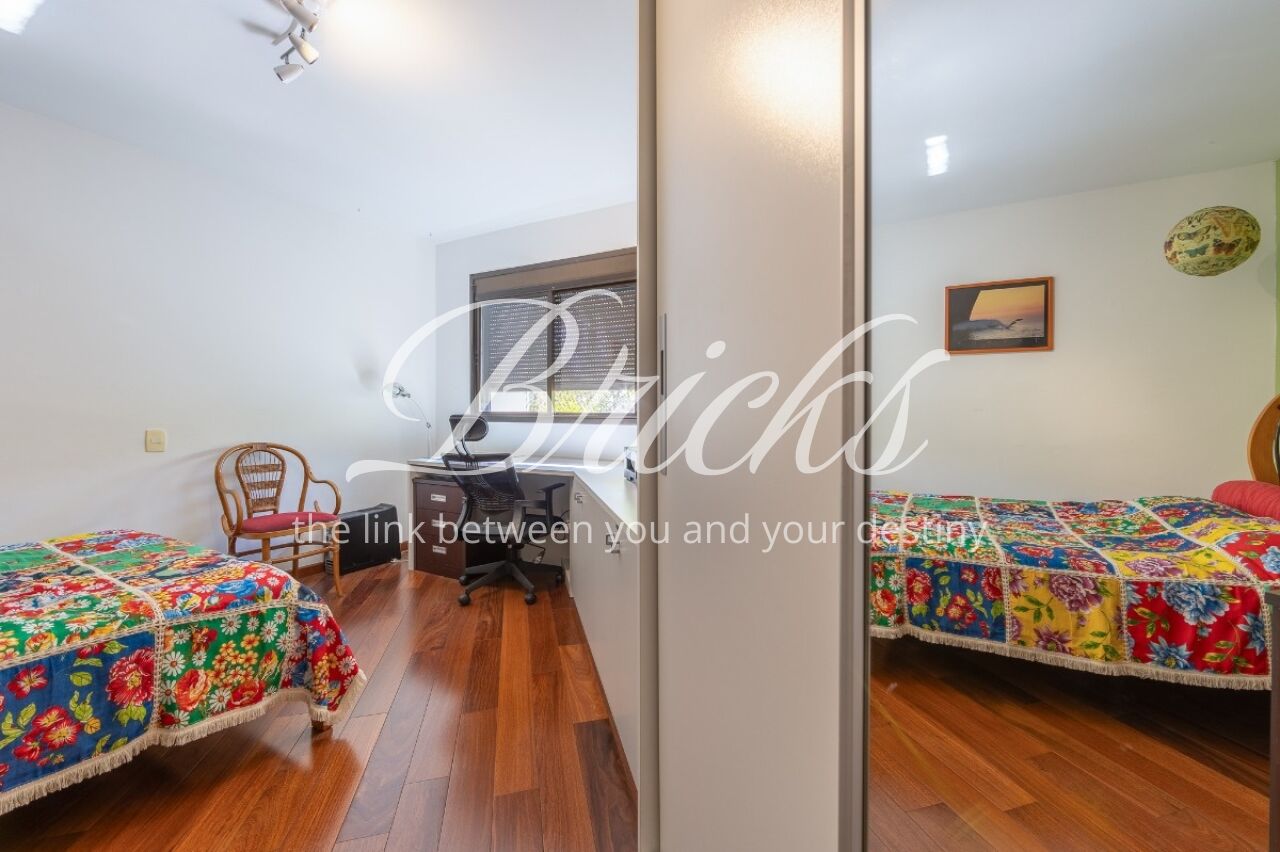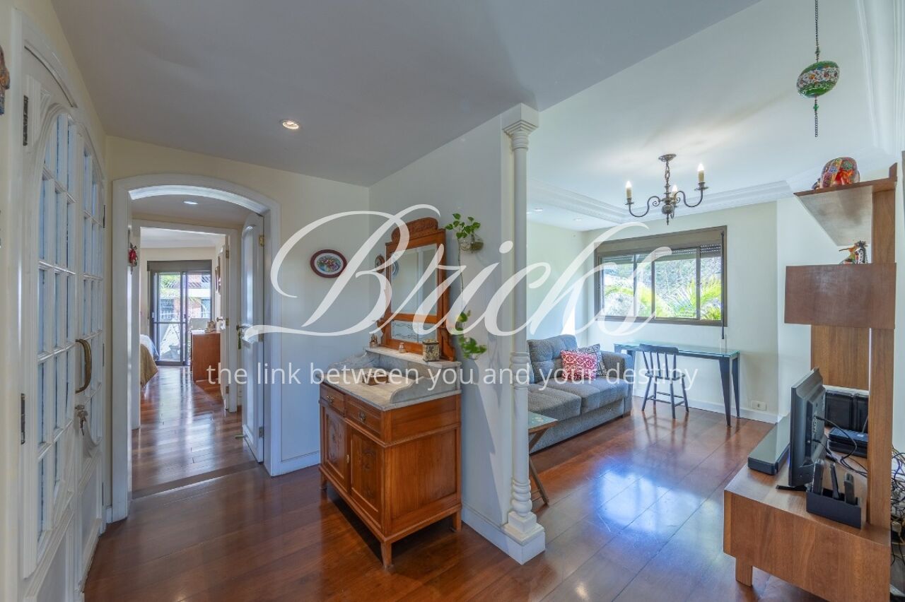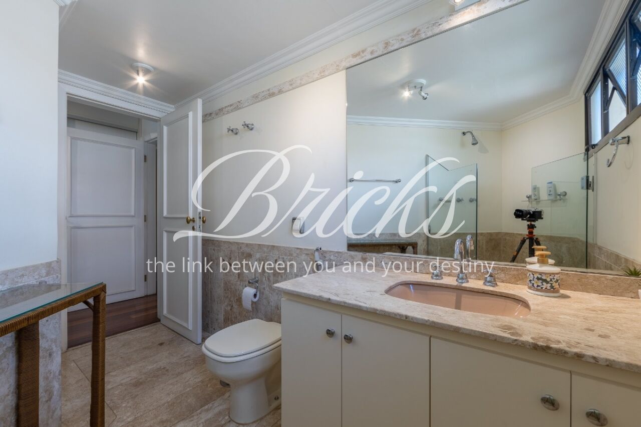 Apartamento com vista privilegiada para a copa das árvores, oferecendo sala ampla para três ambientes, lavabo e terraço generoso. A sala de estar conta com lareira, trazendo aconchego e elegância. A antessala distribui o acesso à área íntima, composta por três suítes com sacada e ar-condicionado, sendo a suíte master equipada com closet. Há ainda uma sala de TV que funciona como quarto adicional, com fácil reversão.