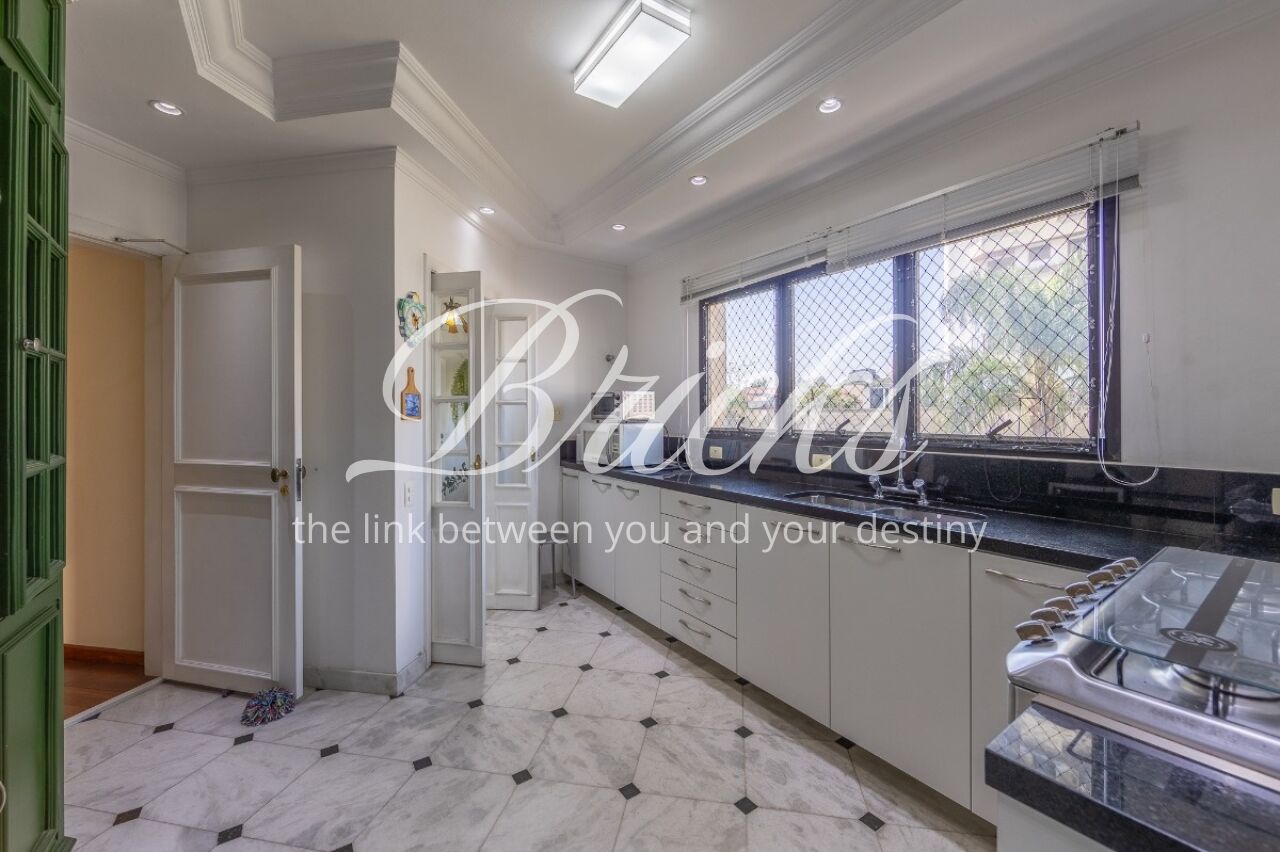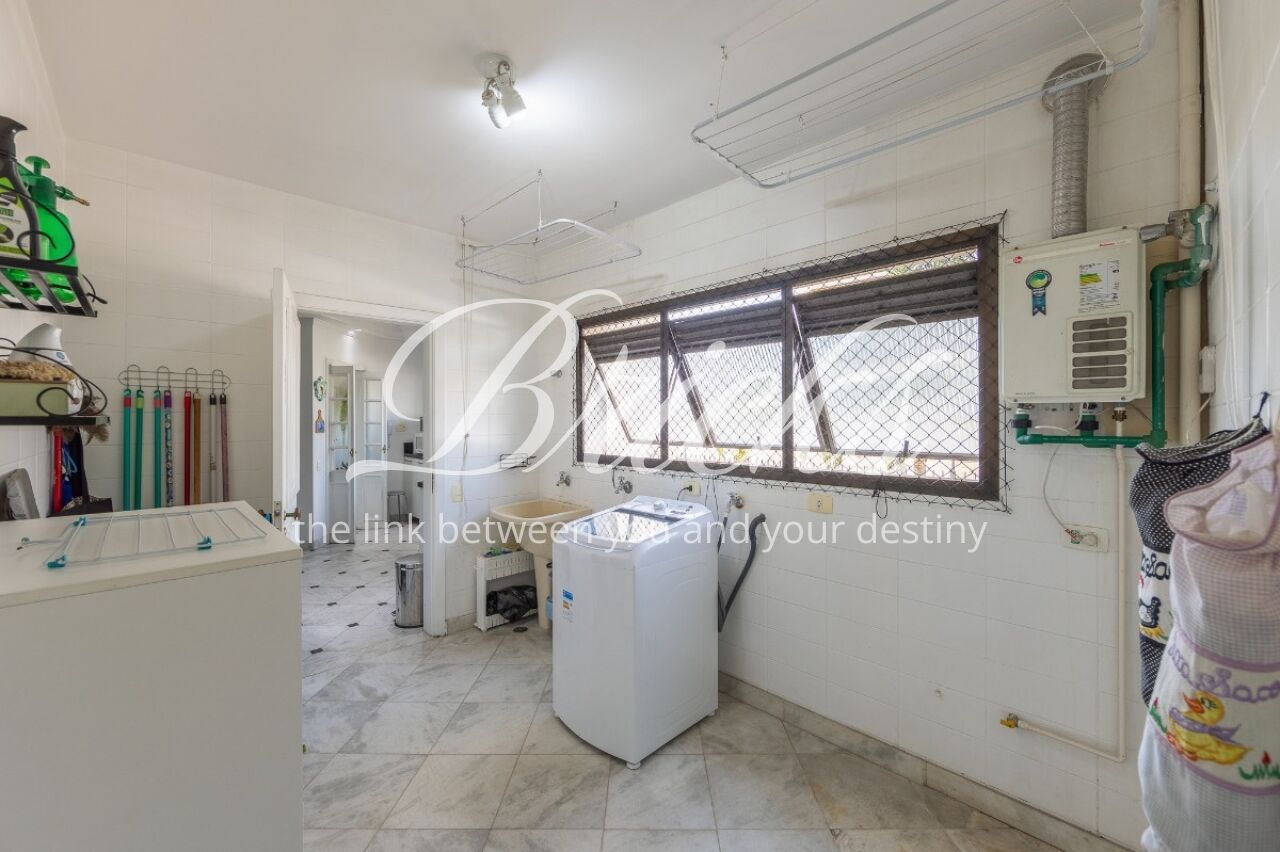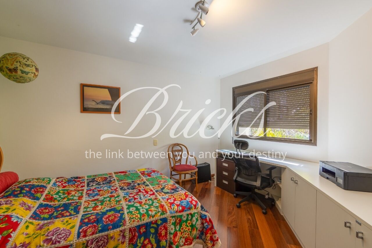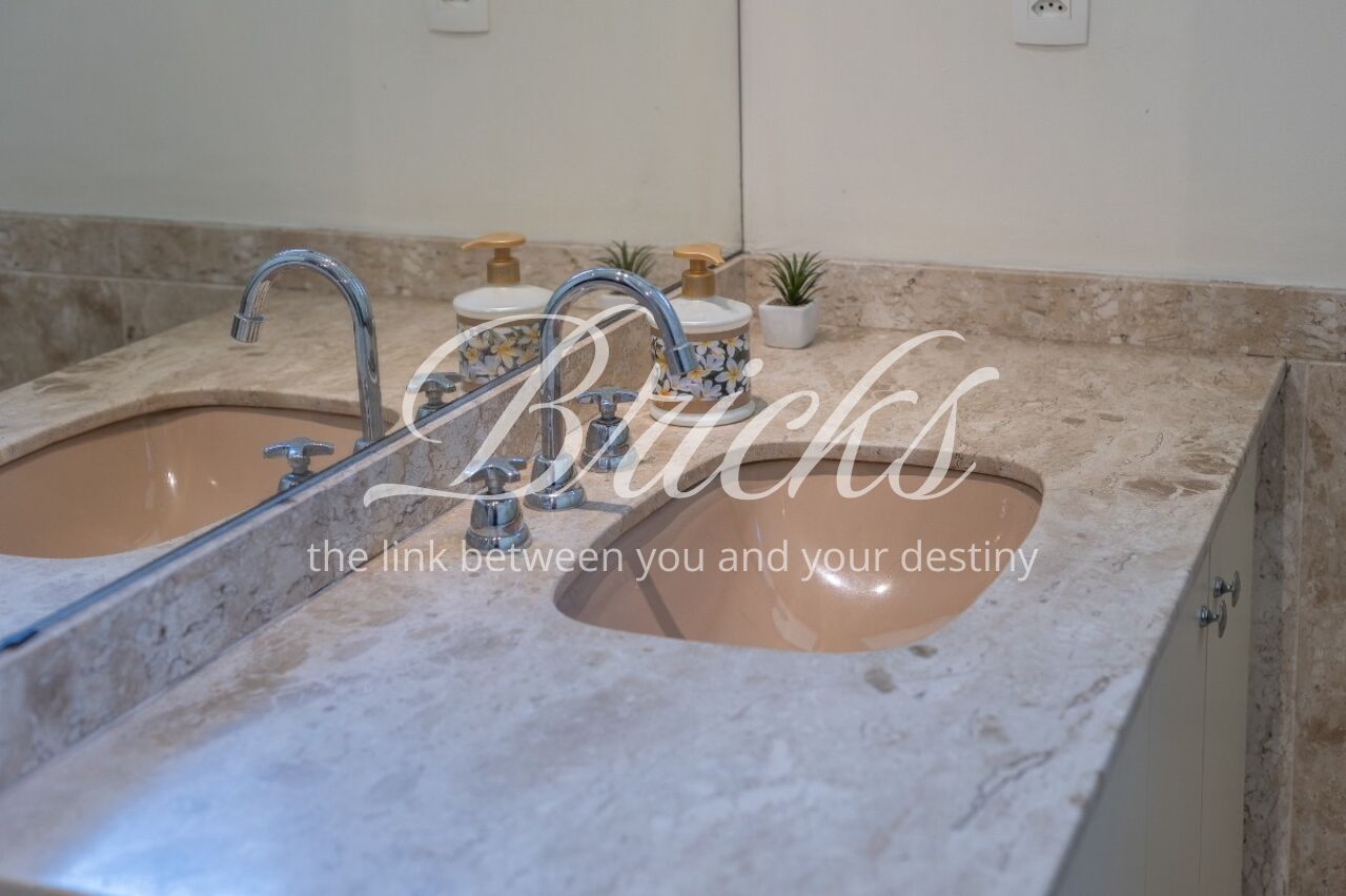 Os ambientes sociais possuem piso em tábuas de madeira, enquanto os banheiros contam com acabamento em granito. A cozinha é ampla, acompanhada de copa, além de duas dependências de empregada com banheiro. Um diferencial do imóvel é a presença de gerador que, além das áreas comuns, alimenta três tomadas internas selecionadas, garantindo maior segurança em eventuais quedas de energia.