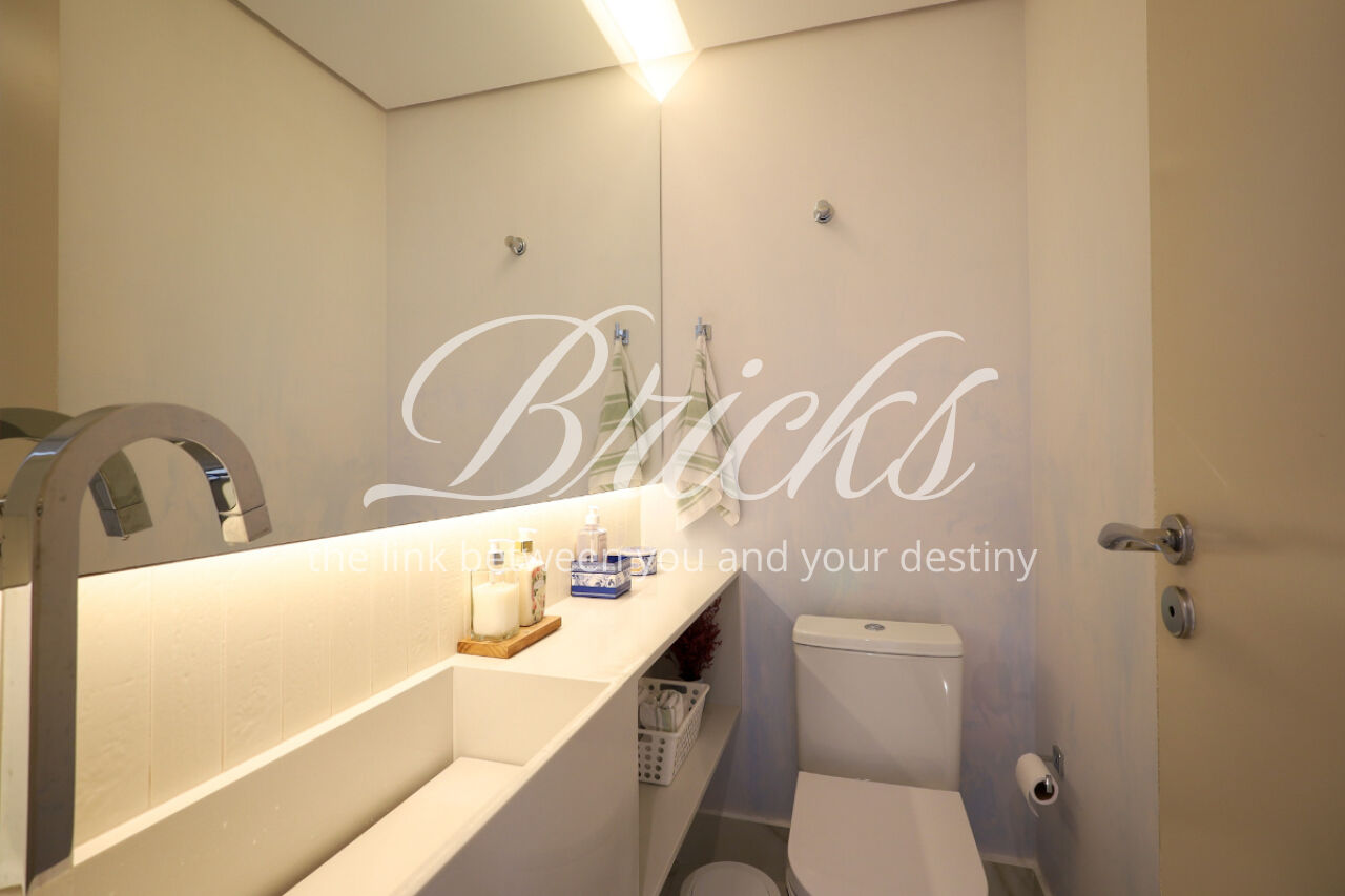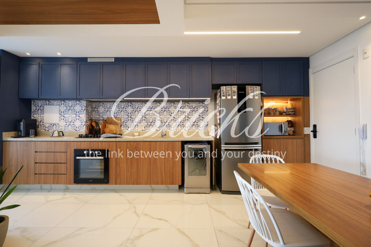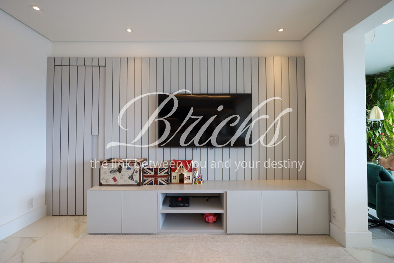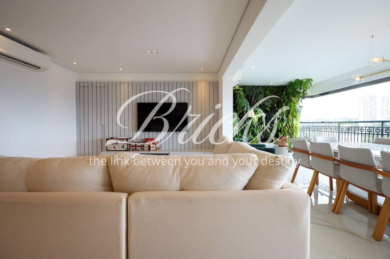 A ampla sala , integrada à varanda, dá uma sensação de maior amplitude, deixando o ambiente agradável e bastante iluminado. O lavabo com a porta disfarçada, integrando a parede, trouxe um toque especial. A cozinha com armários planejados e eletrodomésticos ainda na caixa e a área de serviço com dependência de empregada atendem todas as suas necessidades do dia a dia. Além disto o apartamento tem 3 vagas e um depósito.