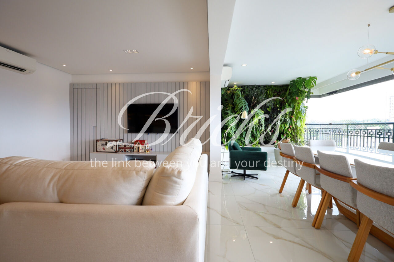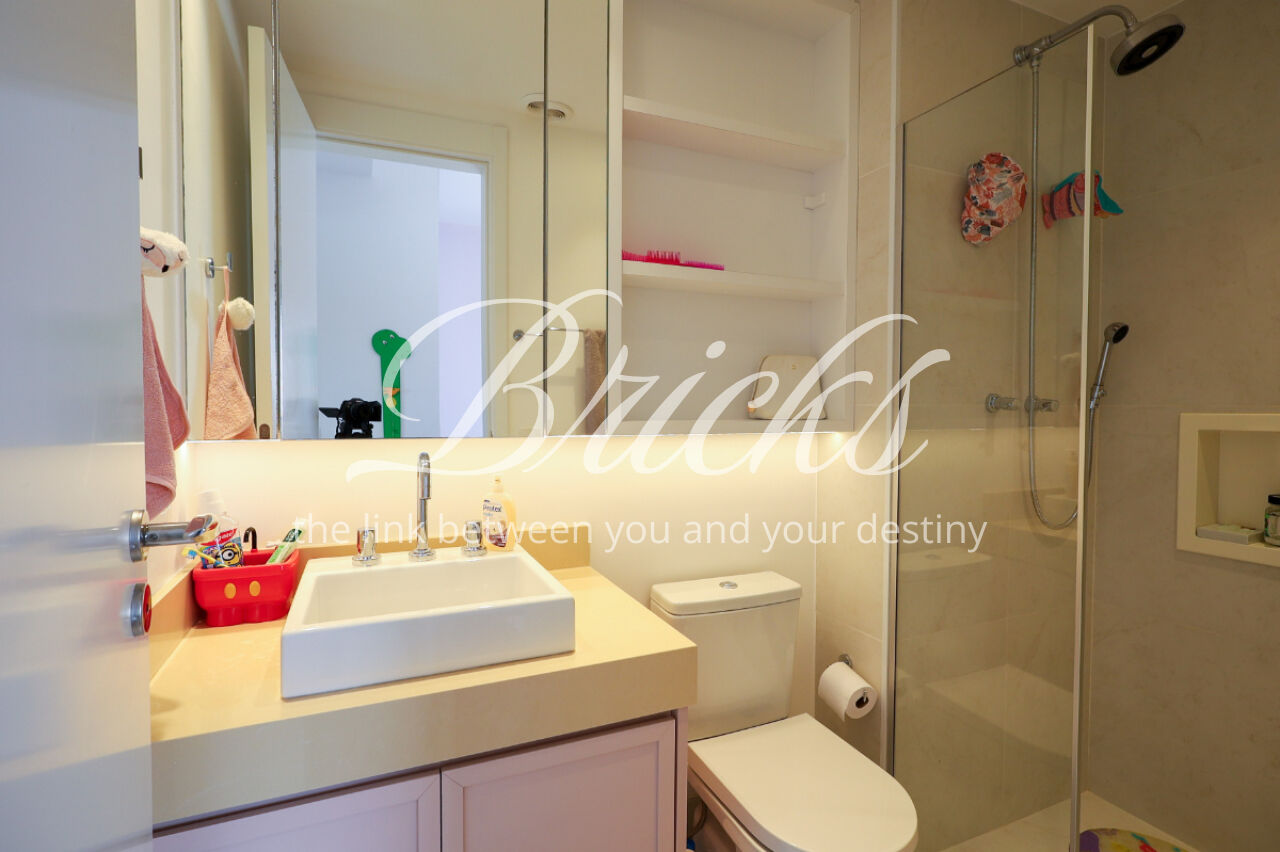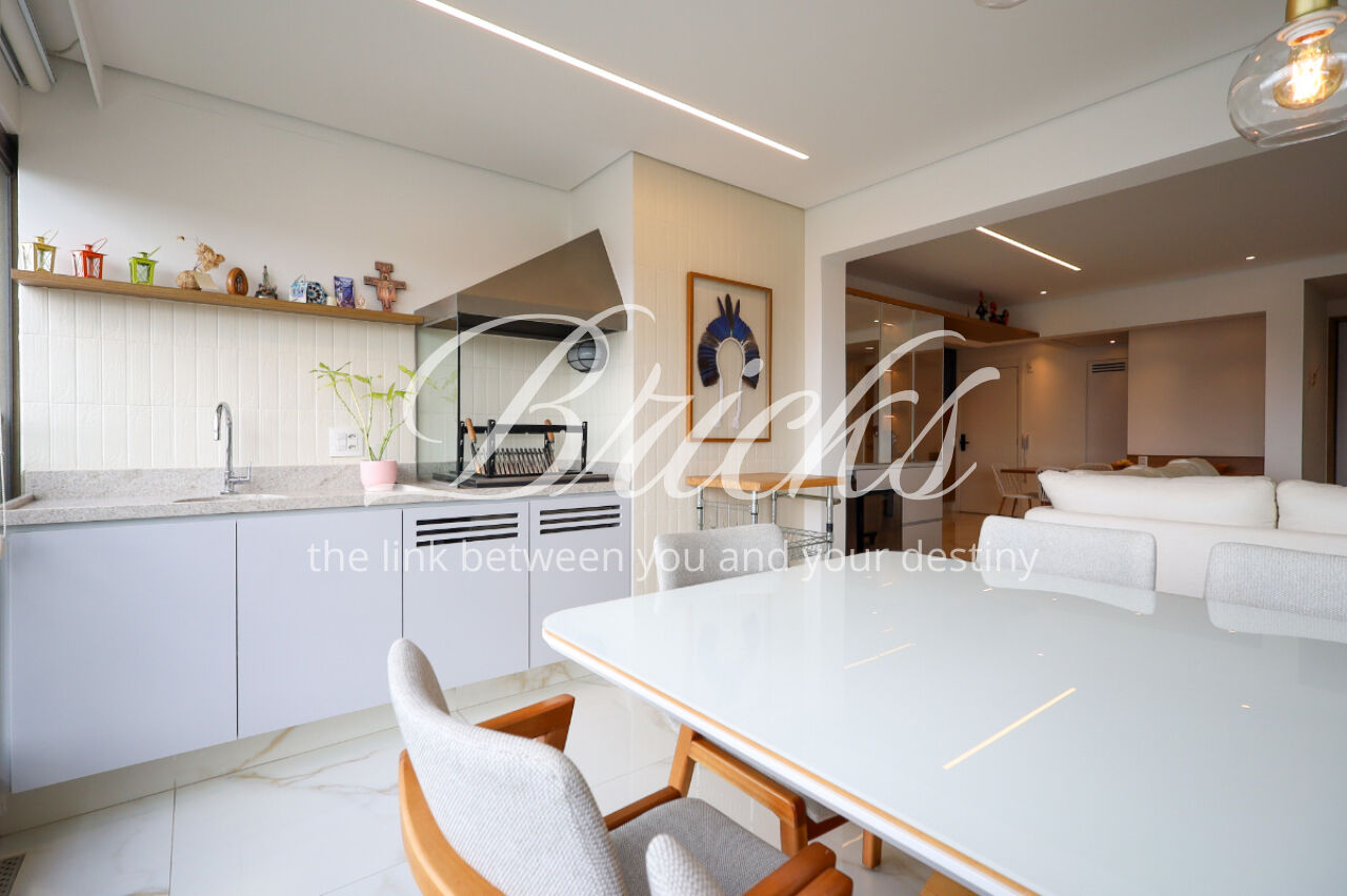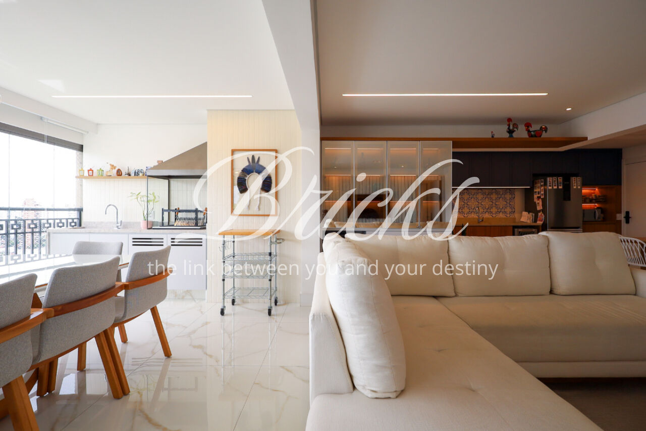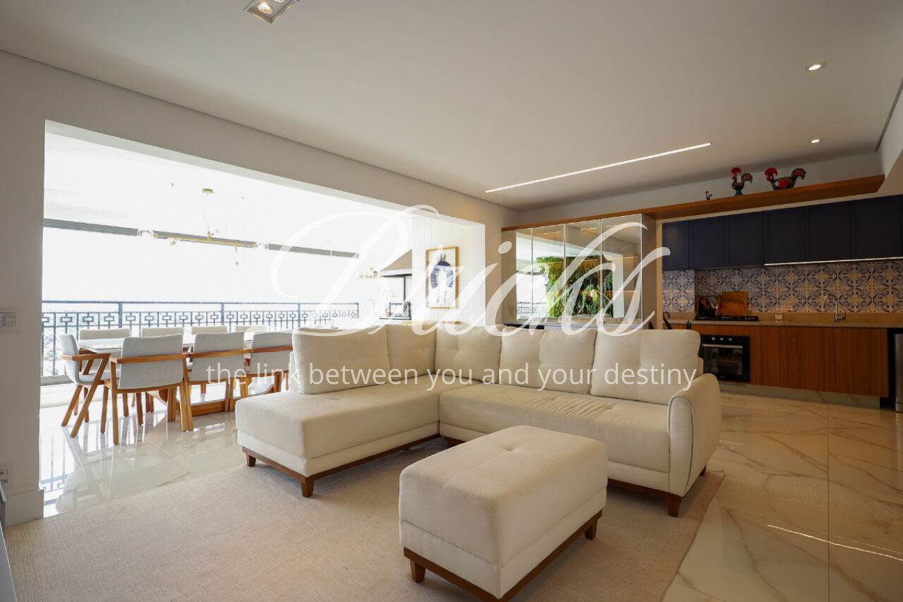 A ampla sala , integrada à varanda, dá uma sensação de maior amplitude, deixando o ambiente agradável e bastante iluminado. O lavabo com a porta disfarçada, integrando a parede, trouxe um toque especial. A cozinha com armários planejados e eletrodomésticos ainda na caixa e a área de serviço com dependência de empregada atendem todas as suas necessidades do dia a dia. Além disto o apartamento tem 3 vagas e um depósito.