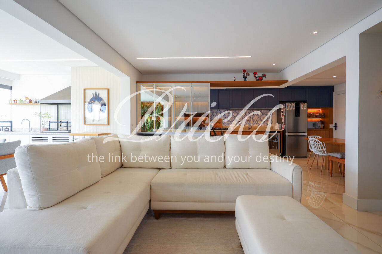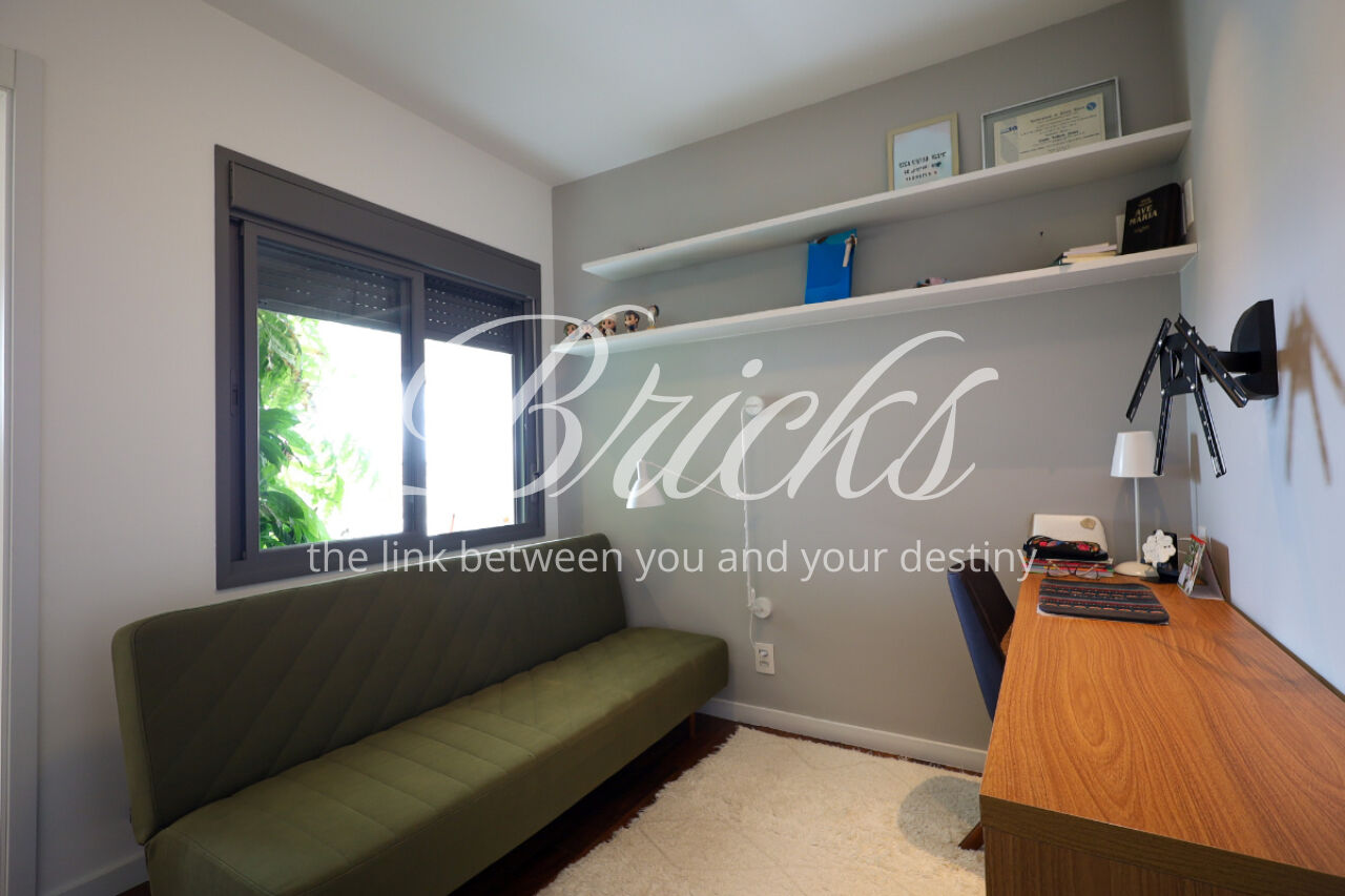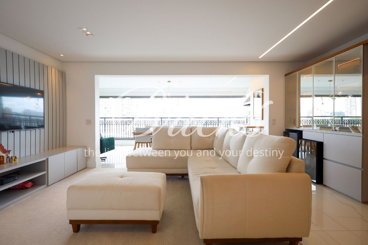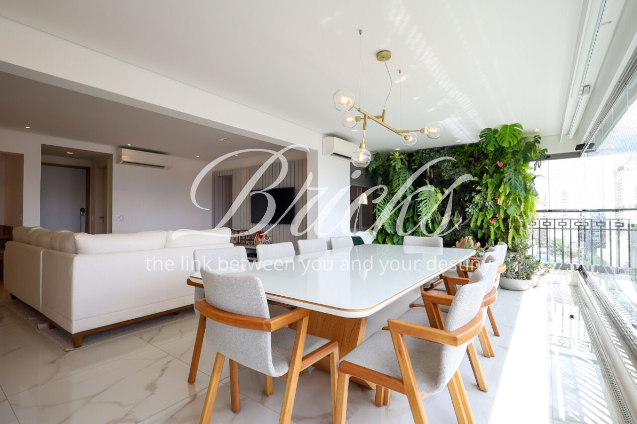 A ampla sala , integrada à varanda, dá uma sensação de maior amplitude, deixando o ambiente agradável e bastante iluminado. O lavabo com a porta disfarçada, integrando a parede, trouxe um toque especial. A cozinha com armários planejados e eletrodomésticos ainda na caixa e a área de serviço com dependência de empregada atendem todas as suas necessidades do dia a dia. Além disto o apartamento tem 3 vagas e um depósito.
