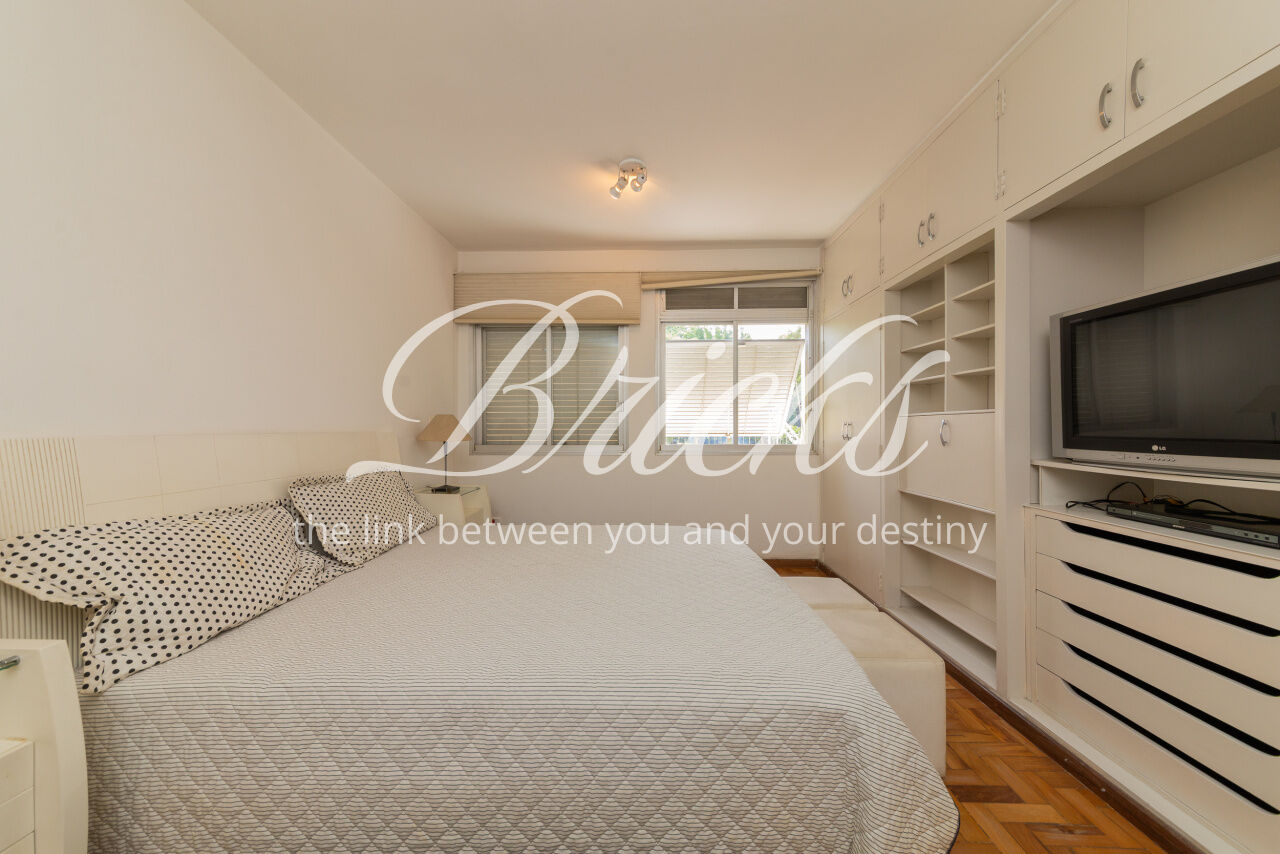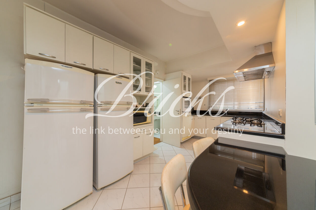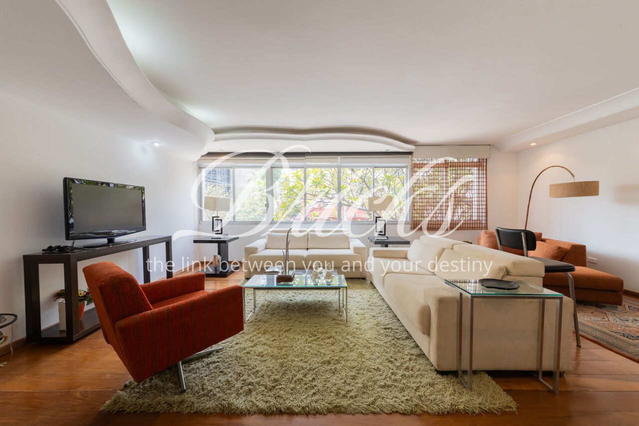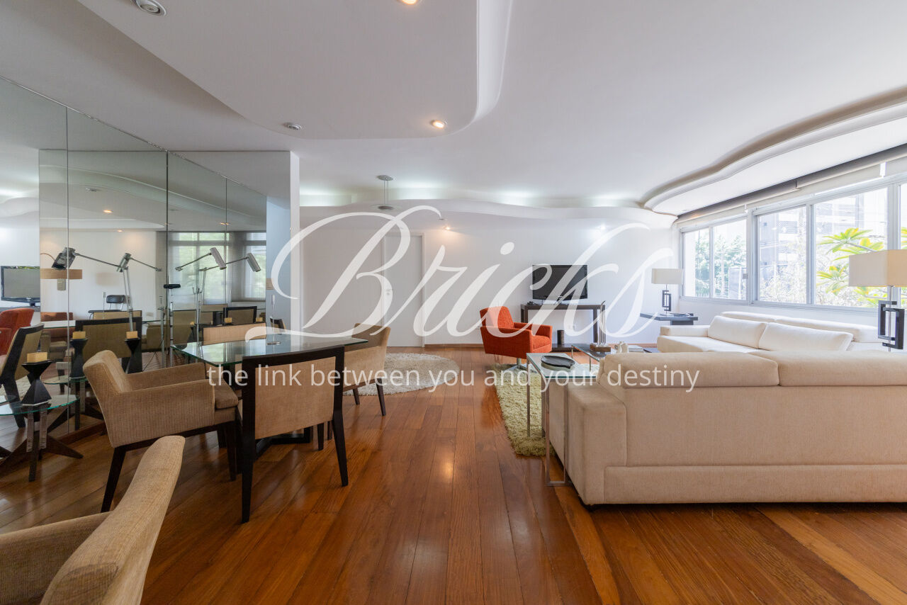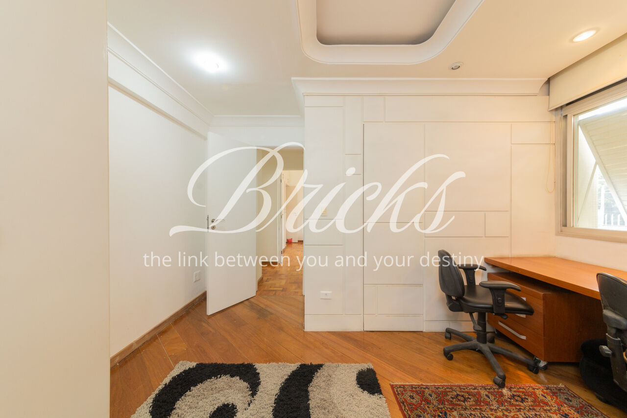 Ótimo apartamento de 180m2, 3 dormitórios (sendo 1 suíte e 2 americanas) com 3 vagas, muito bem localizado no Itaim - a 300m do Colégio Pueri Domus e 4 minutos a pé até a Escola Concept. De planta retangular com excelente aproveitamento da metragem, oferece generoso living para ao menos 3 ambientes confortavelmente integrados servidos por elegante piso em tábua larga de madeira nobre, janelão de parede à parede para a copa das árvores e lavabo. Os 3 dormitórios são notavelmente espaçosos, sobretudo a suíte principal. Dois deles estão com piso em taco nobre de peroba na clássica disposição espinha de peixe e o outro em tábua larga. A copa-cozinha é enorme, rica em marcenaria, com bancadas em granito negro São Gabriel e bastante luminosidade natural. A área de serviço também é ampla e com ótima ventilação. Há dependência para funcionária, pode ser usada como despensa.
