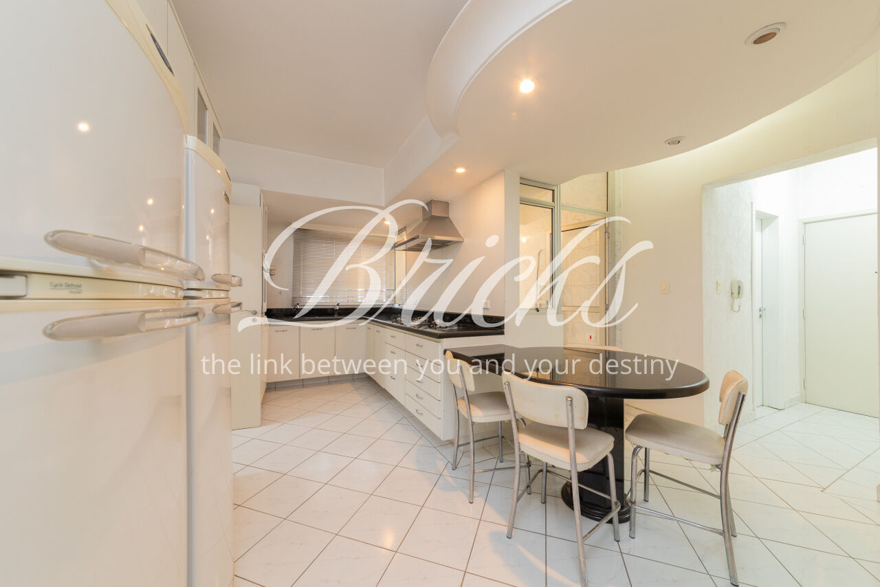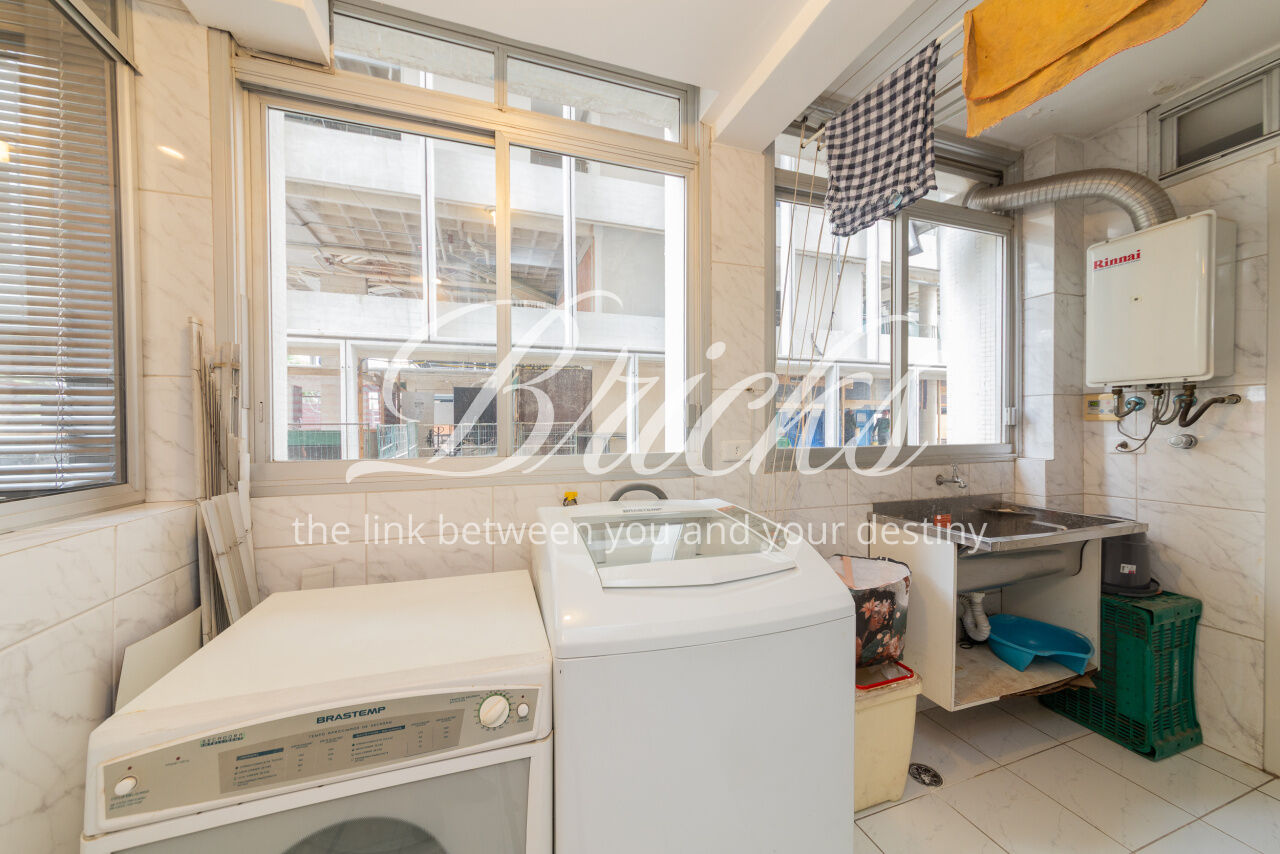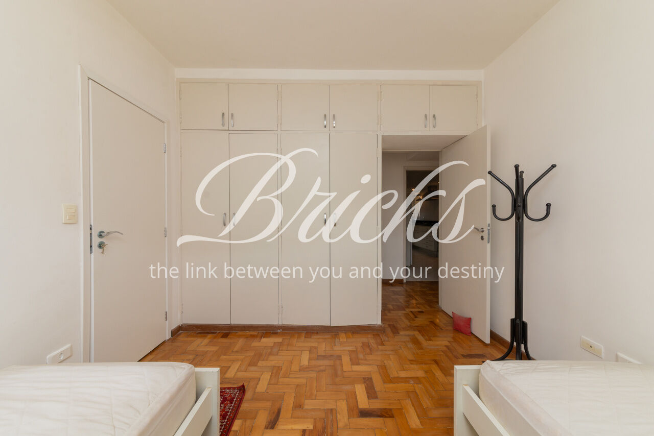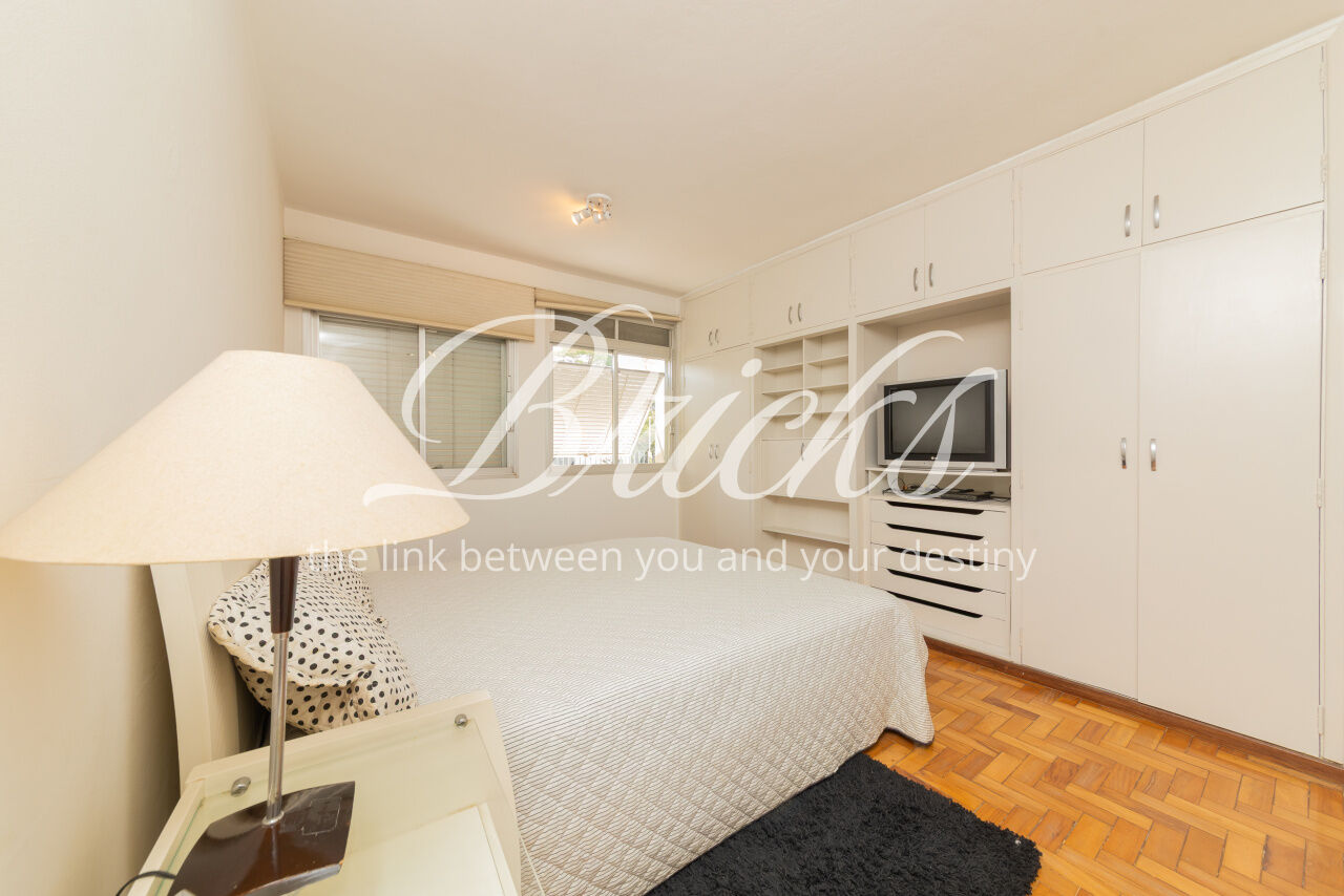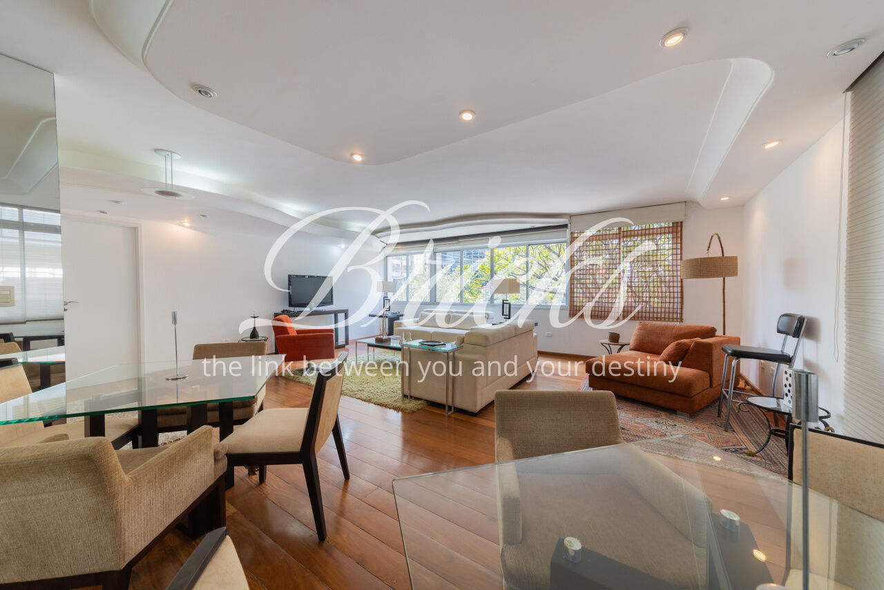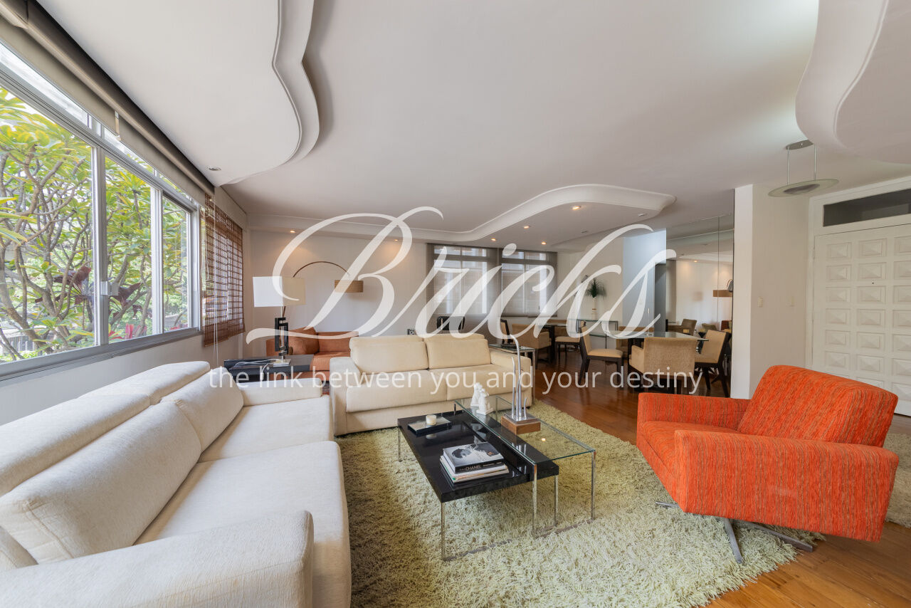 Ótimo apartamento de 180m2, 3 dormitórios (sendo 1 suíte e 2 americanas) com 3 vagas, muito bem localizado no Itaim - a 300m do Colégio Pueri Domus e 4 minutos a pé até a Escola Concept. De planta retangular com excelente aproveitamento da metragem, oferece generoso living para ao menos 3 ambientes confortavelmente integrados servidos por elegante piso em tábua larga de madeira nobre, janelão de parede à parede para a copa das árvores e lavabo. Os 3 dormitórios são notavelmente espaçosos, sobretudo a suíte principal. Dois deles estão com piso em taco nobre de peroba na clássica disposição espinha de peixe e o outro em tábua larga. A copa-cozinha é enorme, rica em marcenaria, com bancadas em granito negro São Gabriel e bastante luminosidade natural. A área de serviço também é ampla e com ótima ventilação. Há dependência para funcionária, pode ser usada como despensa.