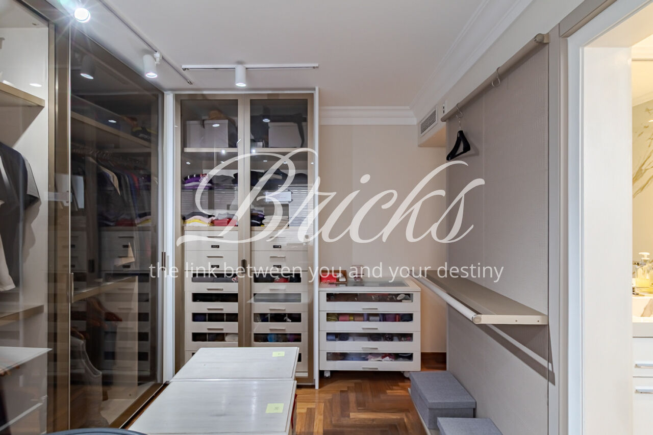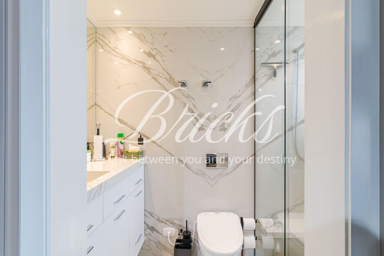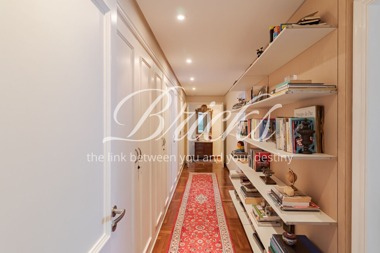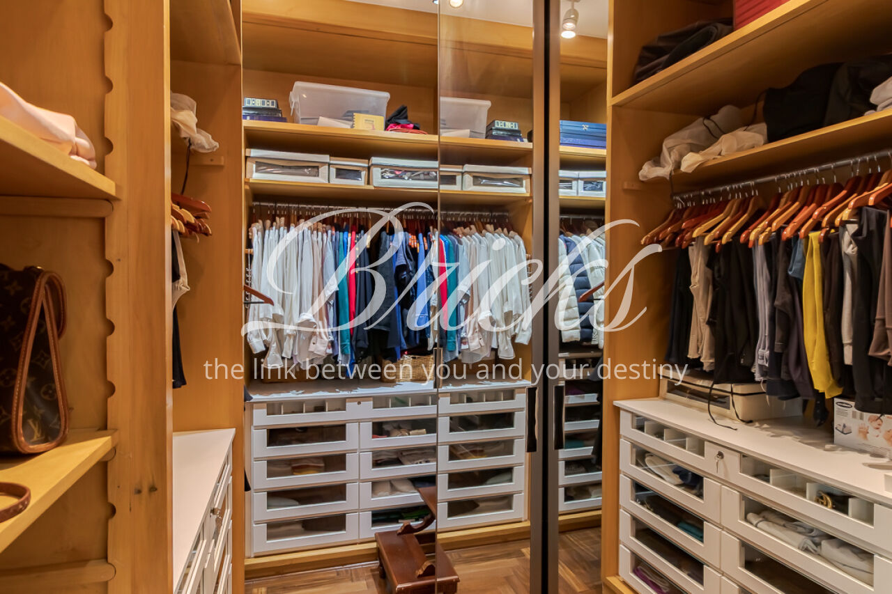 A suíte master é um refúgio: janelas amplas com venezianas automatizadas filtram a luz, criando uma atmosfera silenciosa e acolhedora para uma cama king size. O walk-in closet, com sua ilha central iluminada, é um primor de organização e beleza. O banho spa é uma ode ao bem-estar: mármore Branco Paraná, duchas duplas de teto, toalheiro térmico e uma jacuzzi particular, onde o tempo desacelera. Um universo pessoal para iniciar e encerrar o dia em perfeita harmonia.