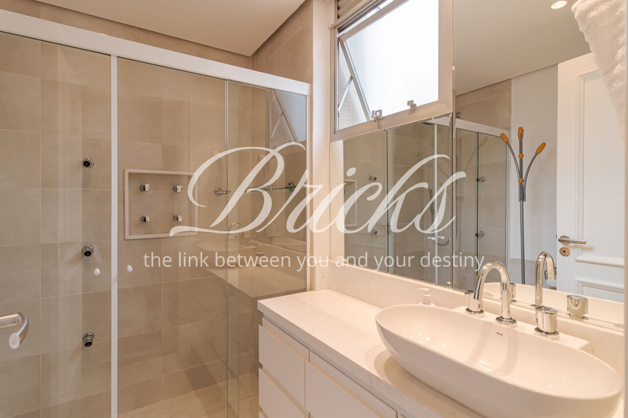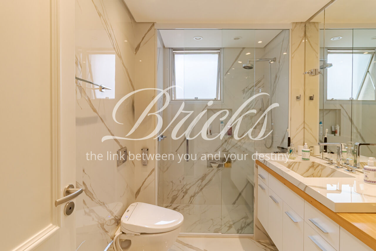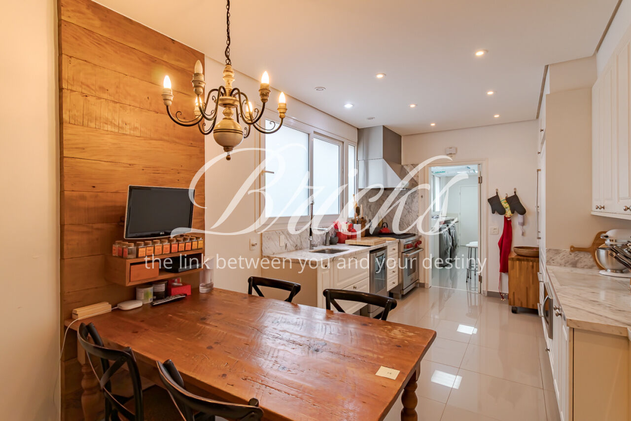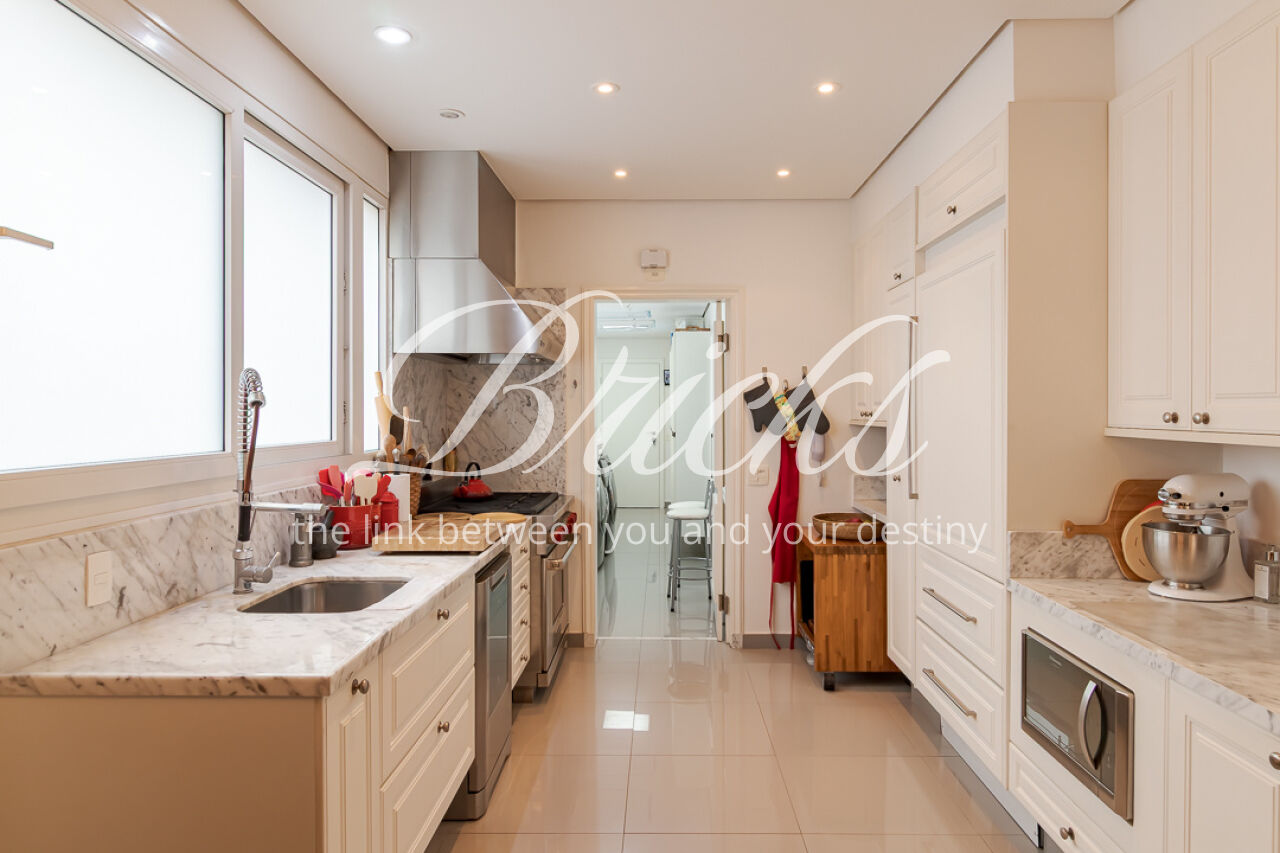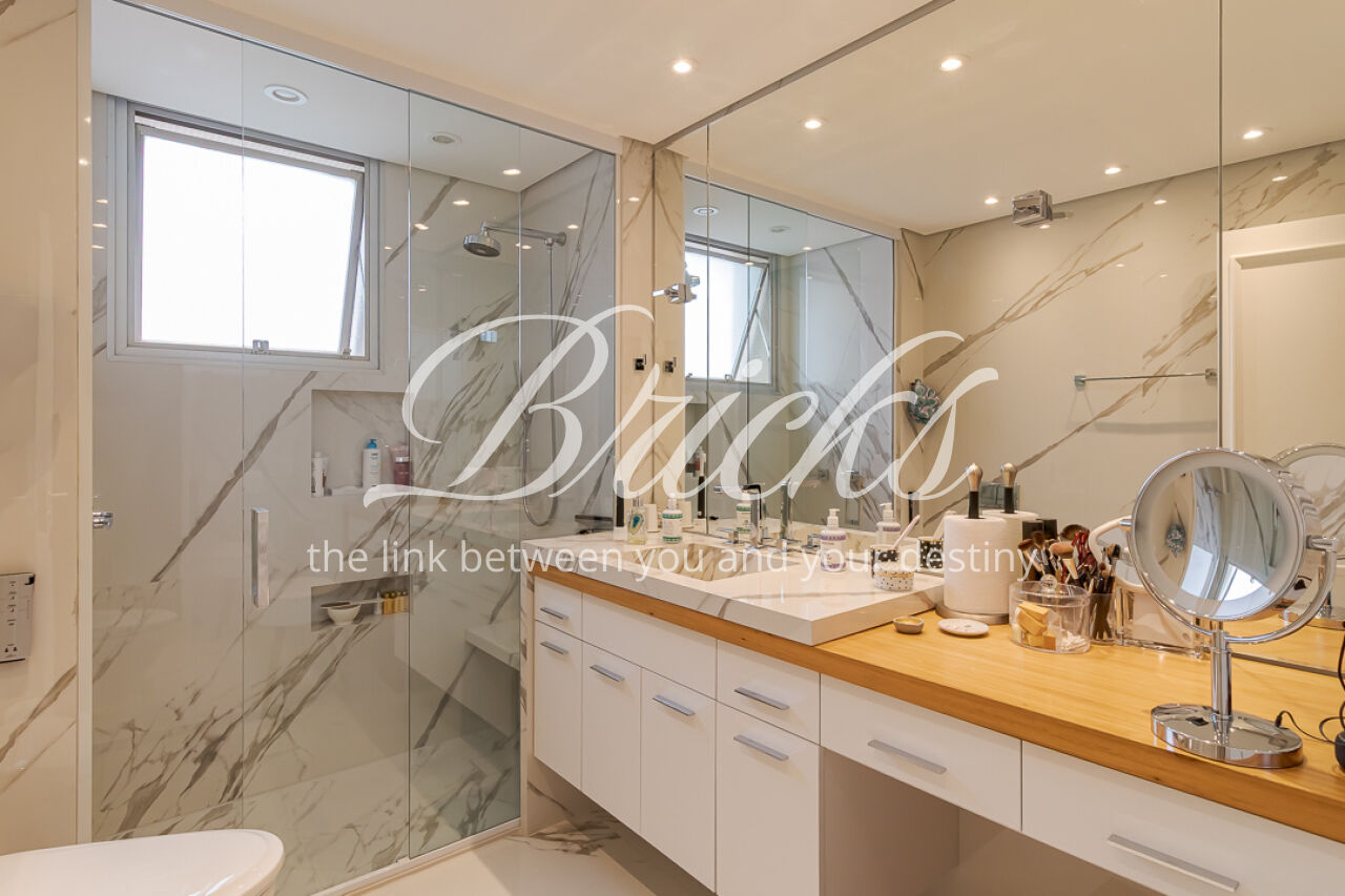 A copa, que é integrada por porta de correr, pode ser apoio à sala de jantar ou cenário para refeições intimistas em família. A cozinha, projetada para o dinamismo do dia-a-dia, é equipada com eletrodomésticos Electrolux e bancadas em mármore Branco Paraná, emoldurada pela marcenaria Bontempo. Área de serviço completa com quarto e banho de serviço. Já o lavabo, com sua cuba esculpida em quartzito Vivid Green, é uma jóia de sofisticação natural.