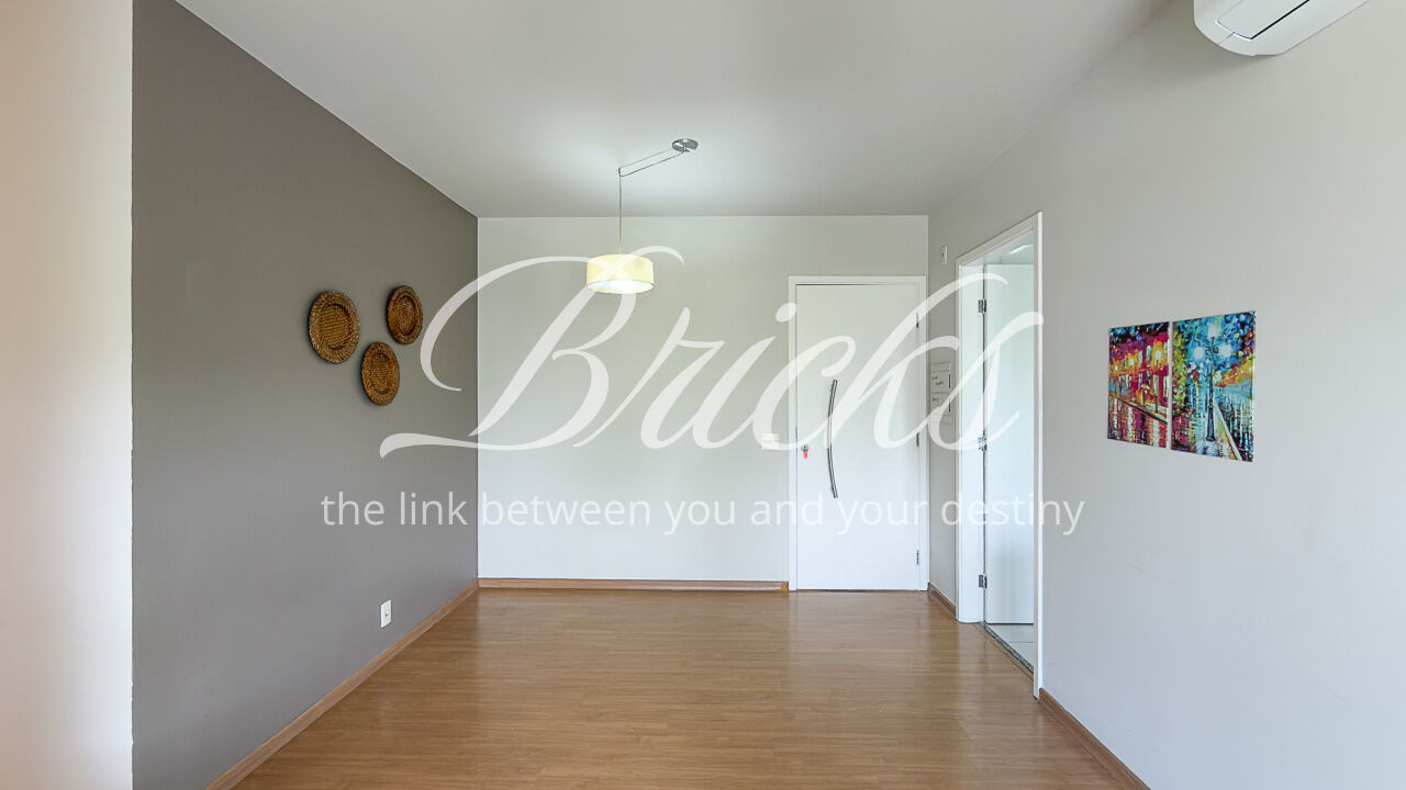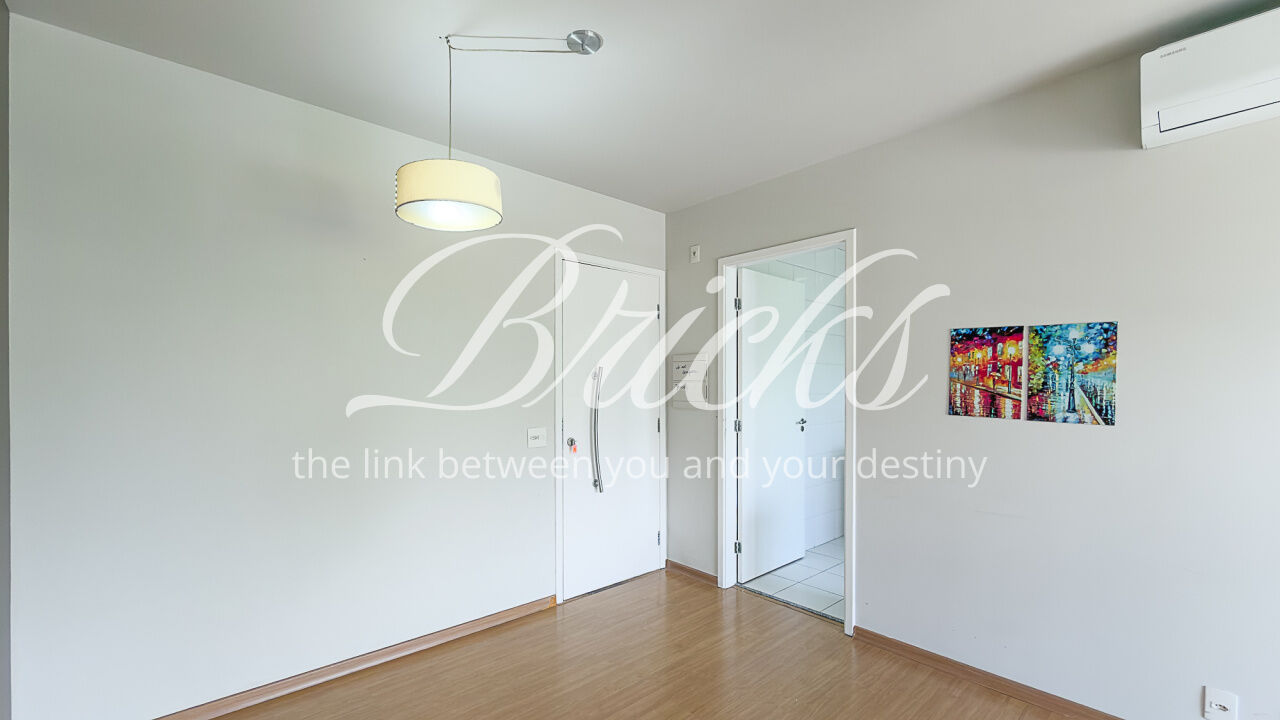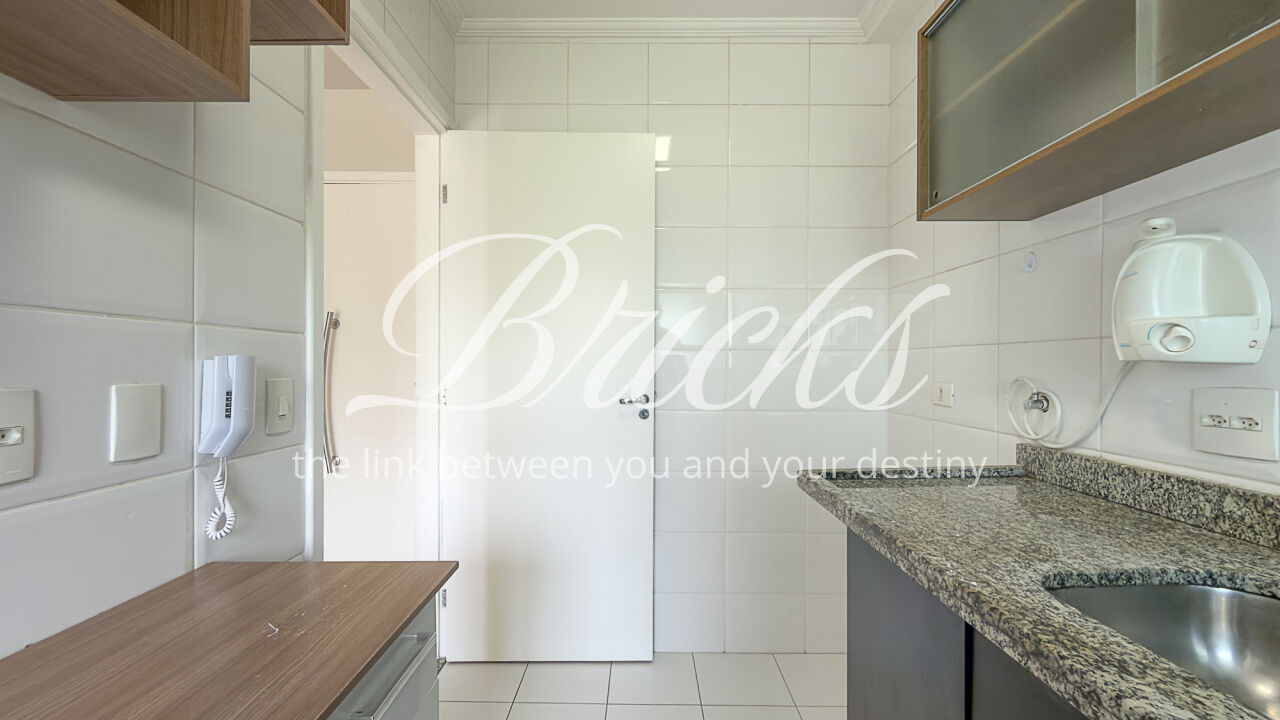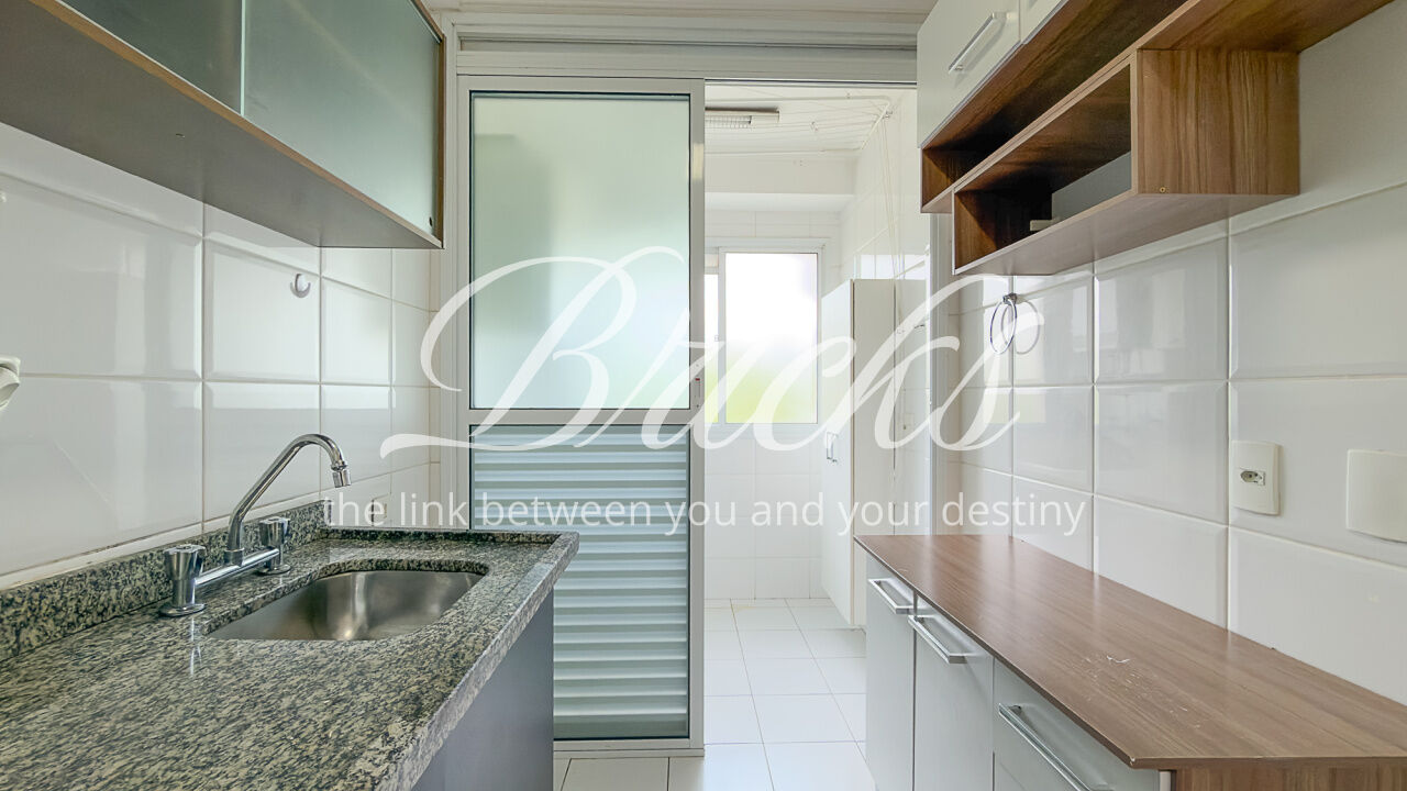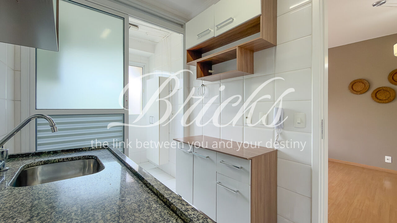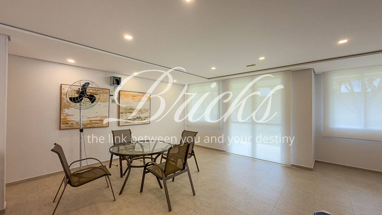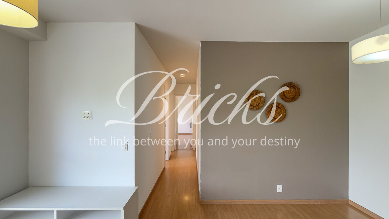 O apartamento é composto por dois dormitórios, sendo uma suíte, sala de estar integrada à sacada com churrasqueira, favorecendo iluminação e ventilação natural, banheiro social, cozinha e área de serviço independente. Possui ar-condicionado instalado na sala e na suíte, sistema de aquecimento de água a gás e uma vaga de garagem fixa e livre, definida em assembleia, sem sistema de rodízio. A área útil total é de 62 m².