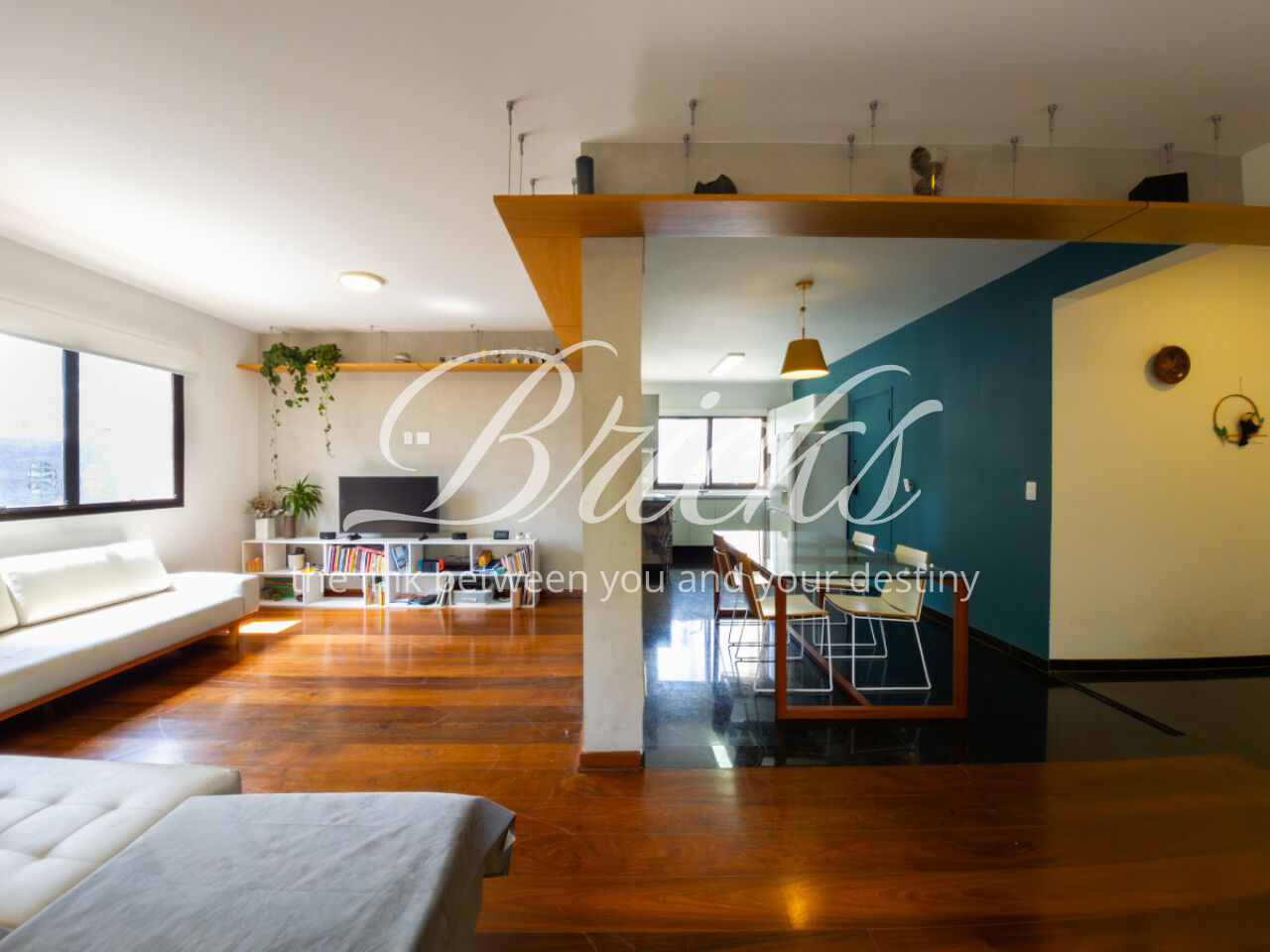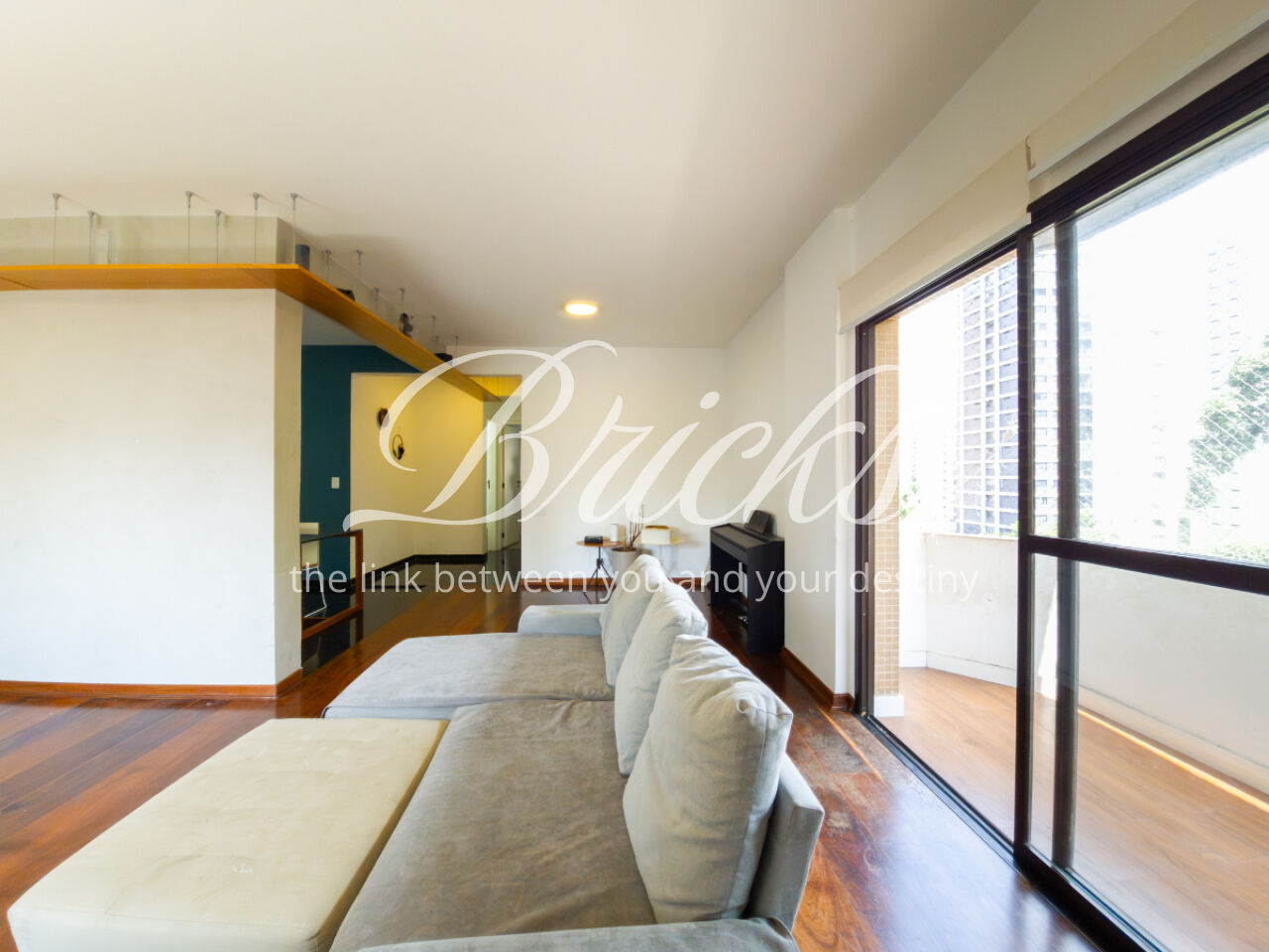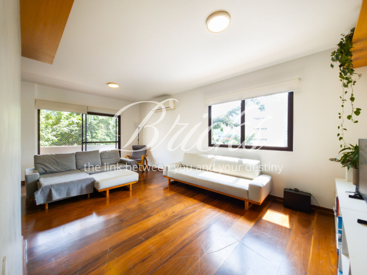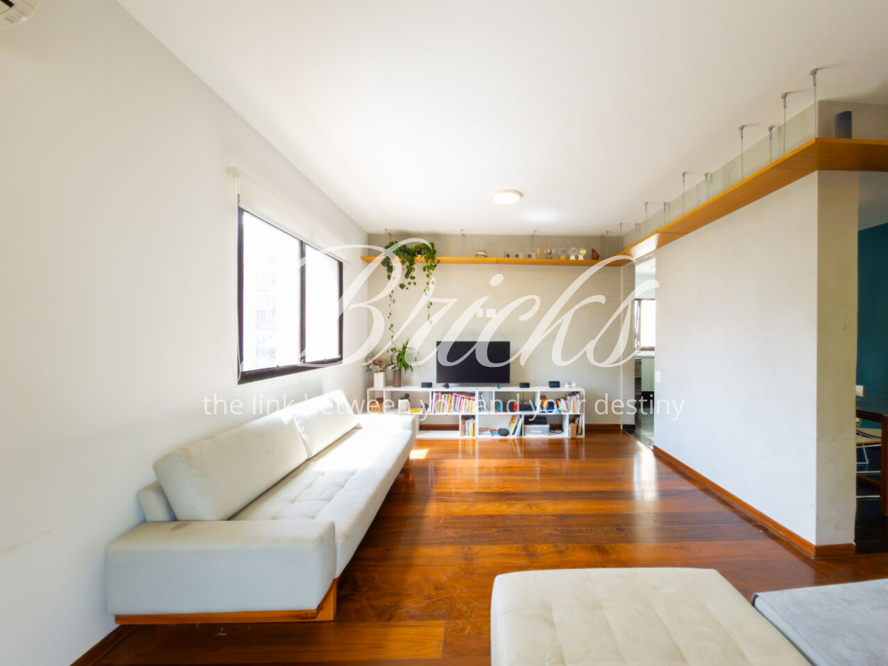 O apartamento é muito generoso em seus cômodos: uma sala com ótima metragem, belo piso de madeira, e com integração para a cozinha..
