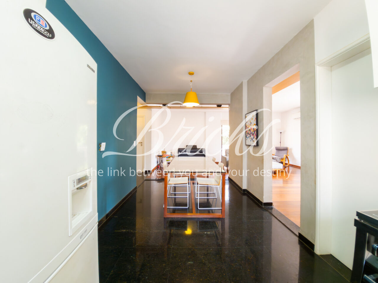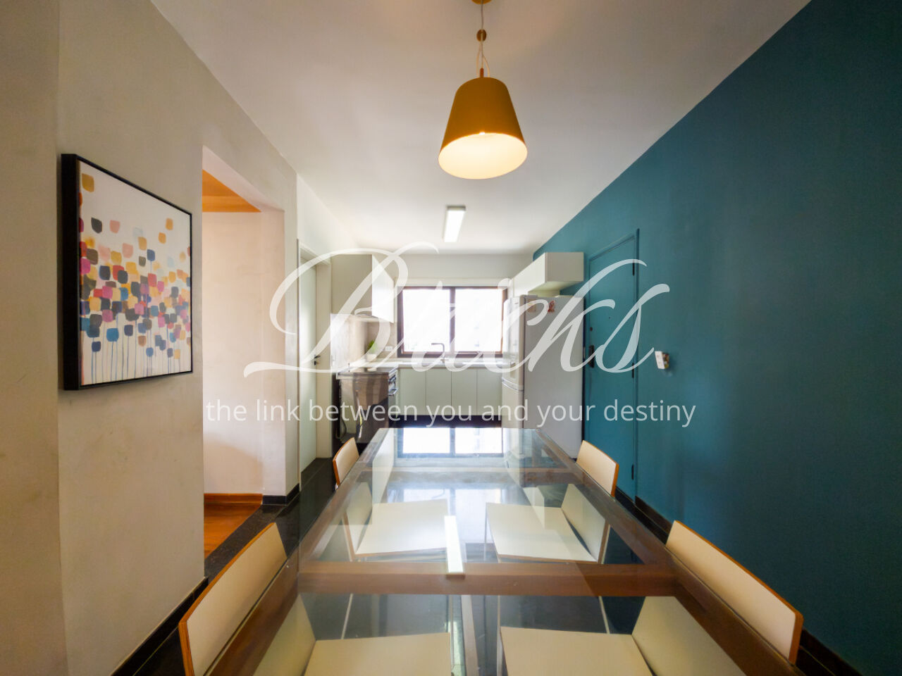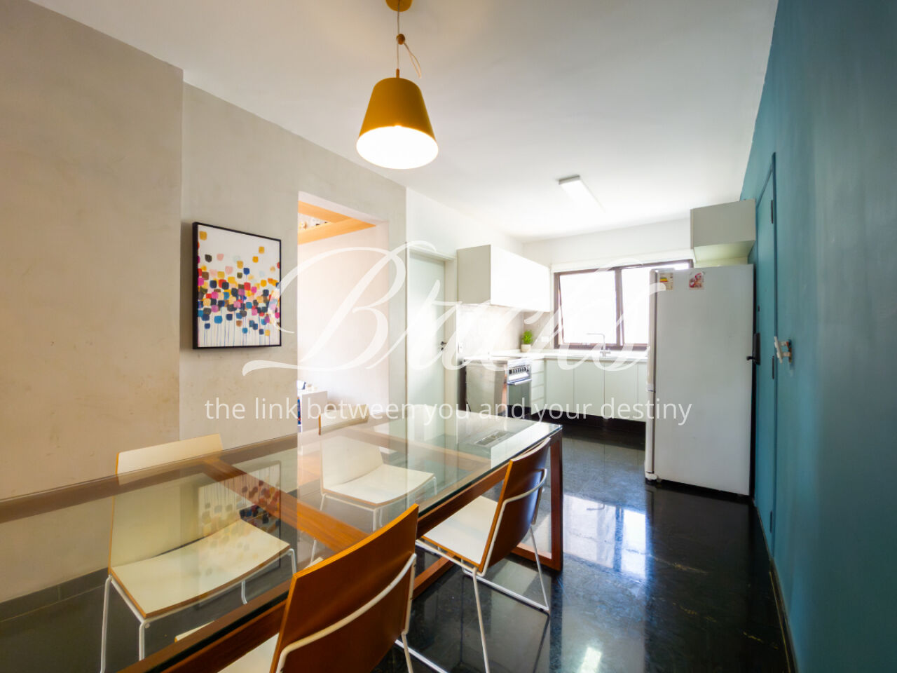 A sala de jantar tem um acesso bem funcional para cozinha.