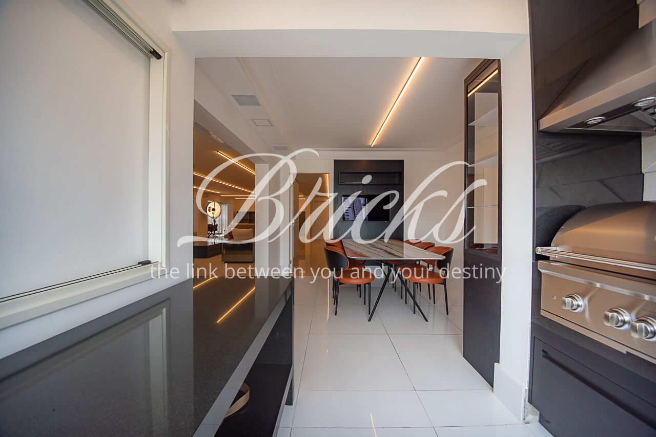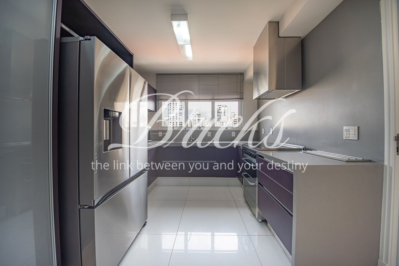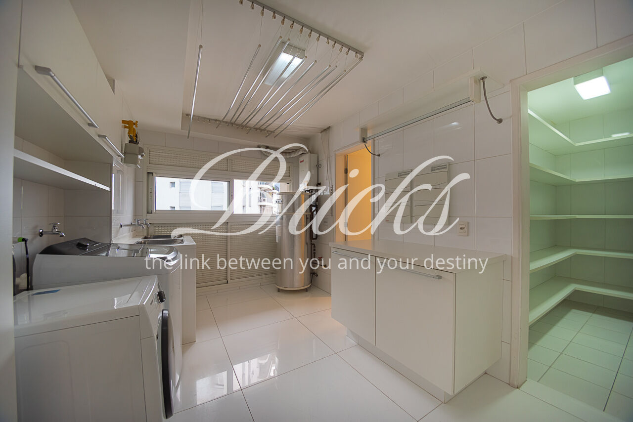 Ampla cozinha Kitchens, bancadas em Corian, rica em iluminação e ventilação natural, 100% pronta e preparada com toda parte de eletrodomésticos, maioria já embutidos, além de oferecer uma boa despensa. A área de serviço possui tamanho generoso e como o restante do imóvel, prontíssima para atender as necessidades de sua família. Há 2 dependências para funcionários com banheiro.