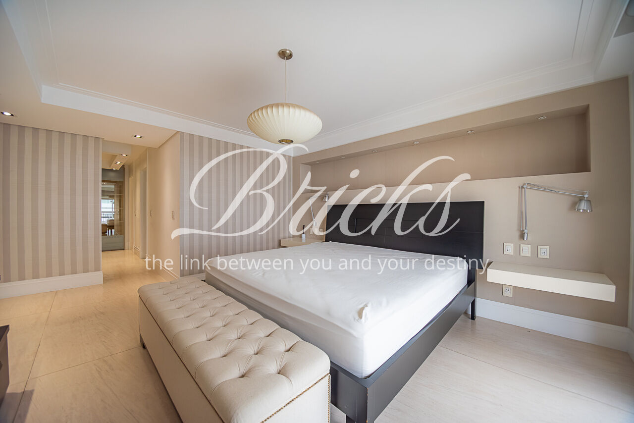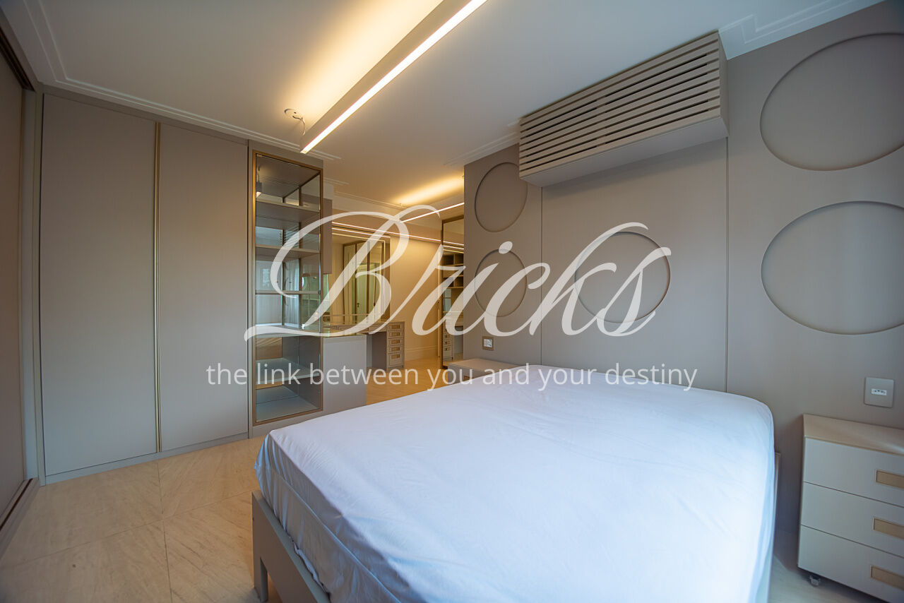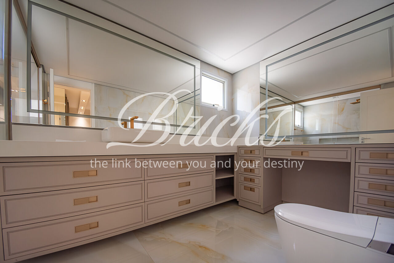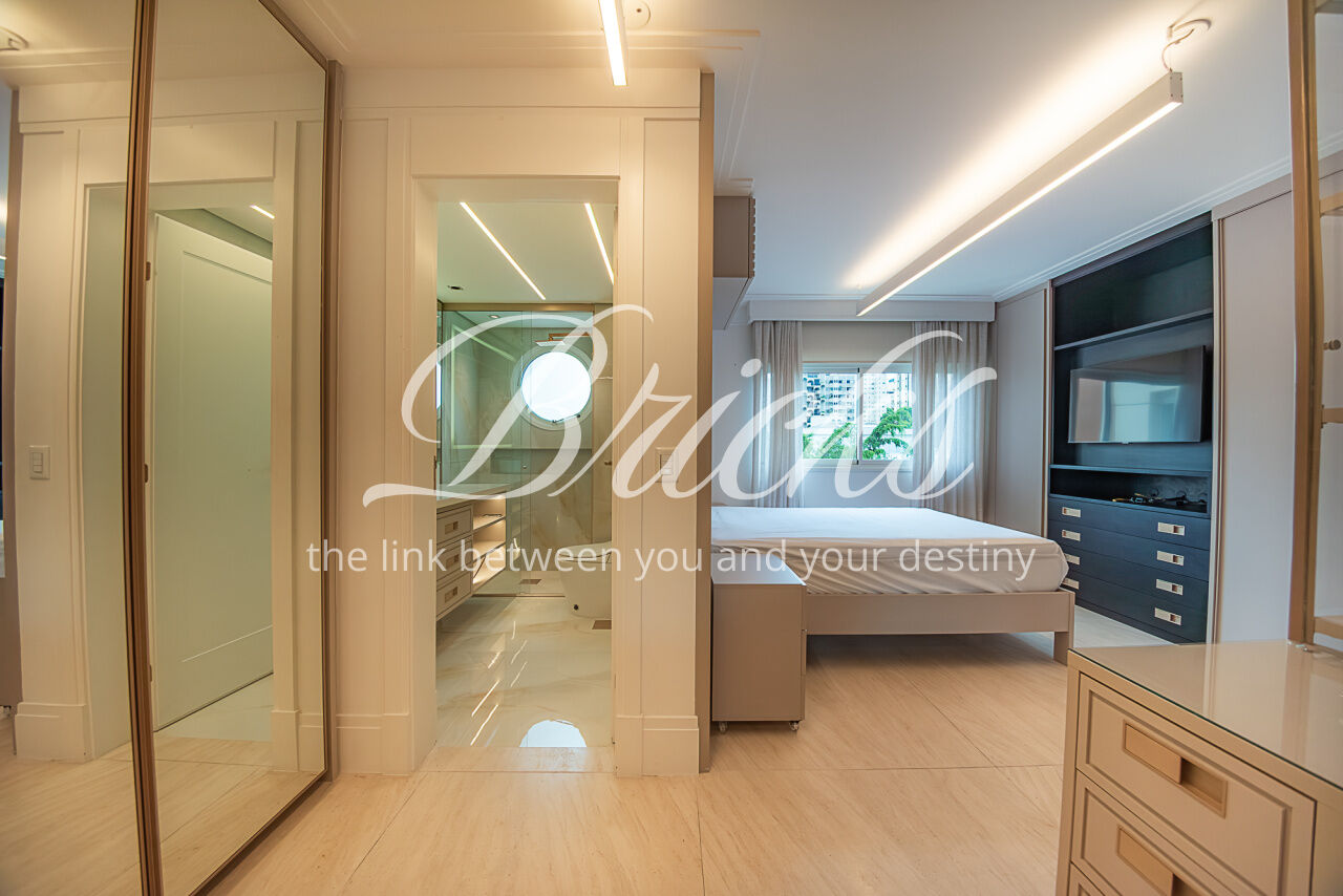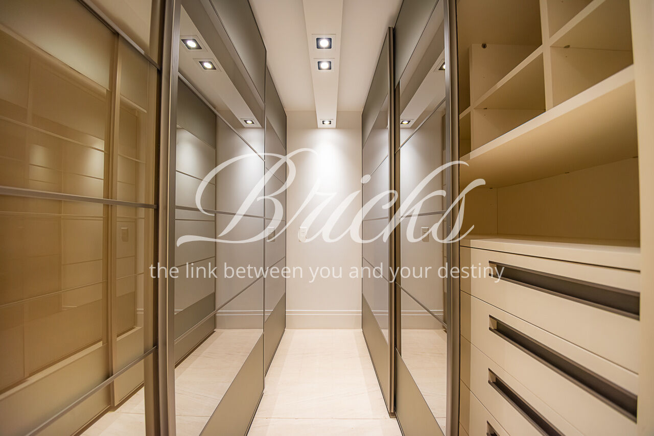 Um largo e amplo corredor privativo, atendido por enorme roupeiro, dá acesso às 4 generosas suítes, todas com ar condicionado, marcenaria Ornare e tudo para lhes receber com o mais elevado rigor estético, harmonia e funcionalidade. A Máster, além de dispor de excelente espaço e varanda, possui closet e banheiro sr. e sra surpreendentes.