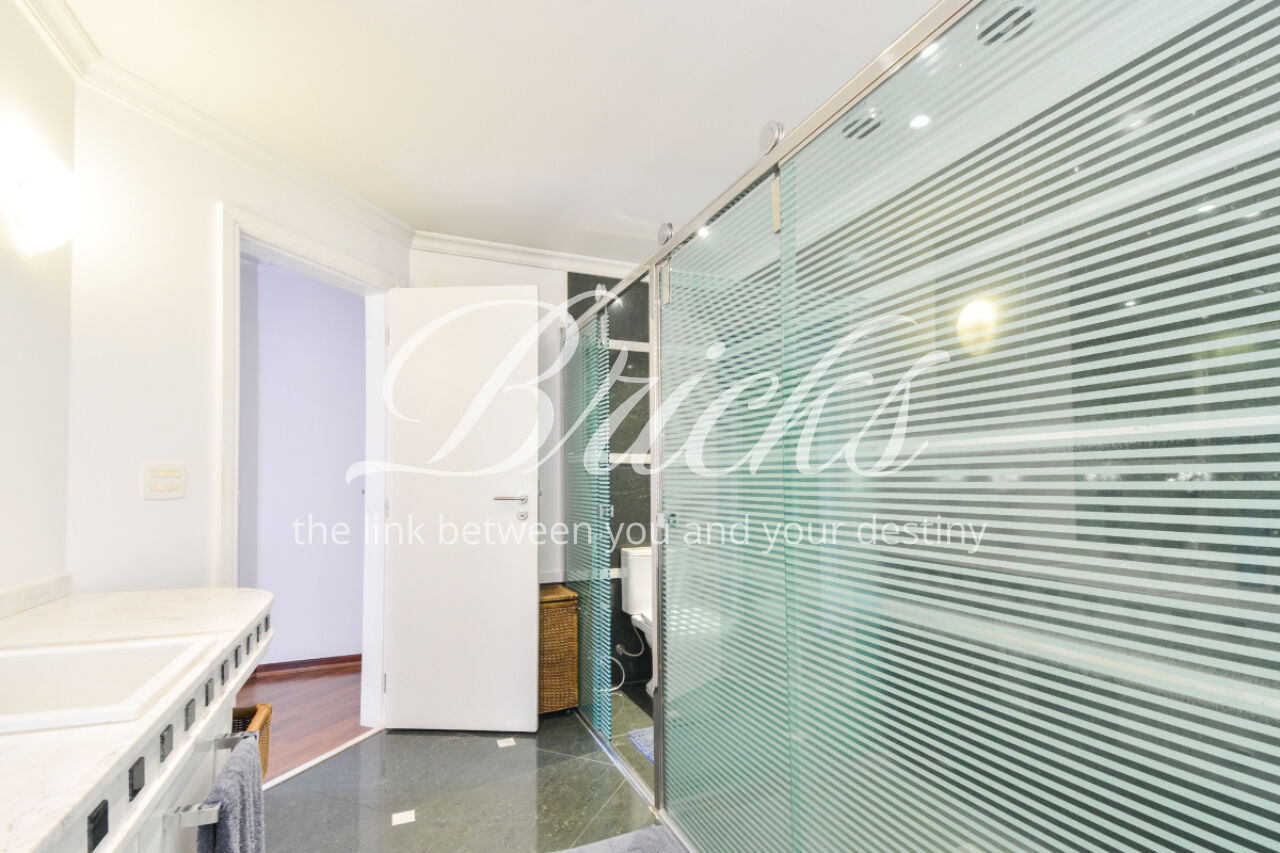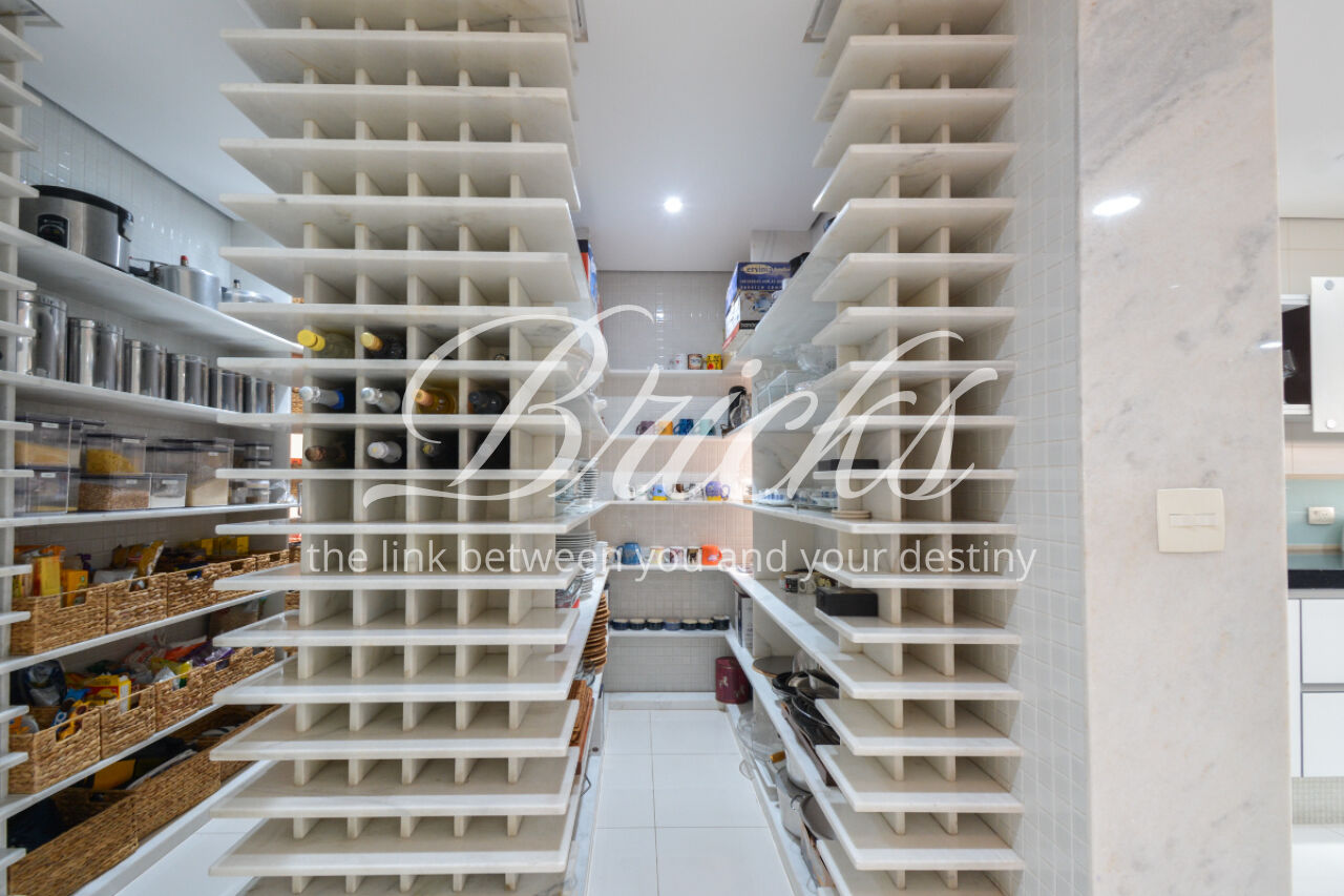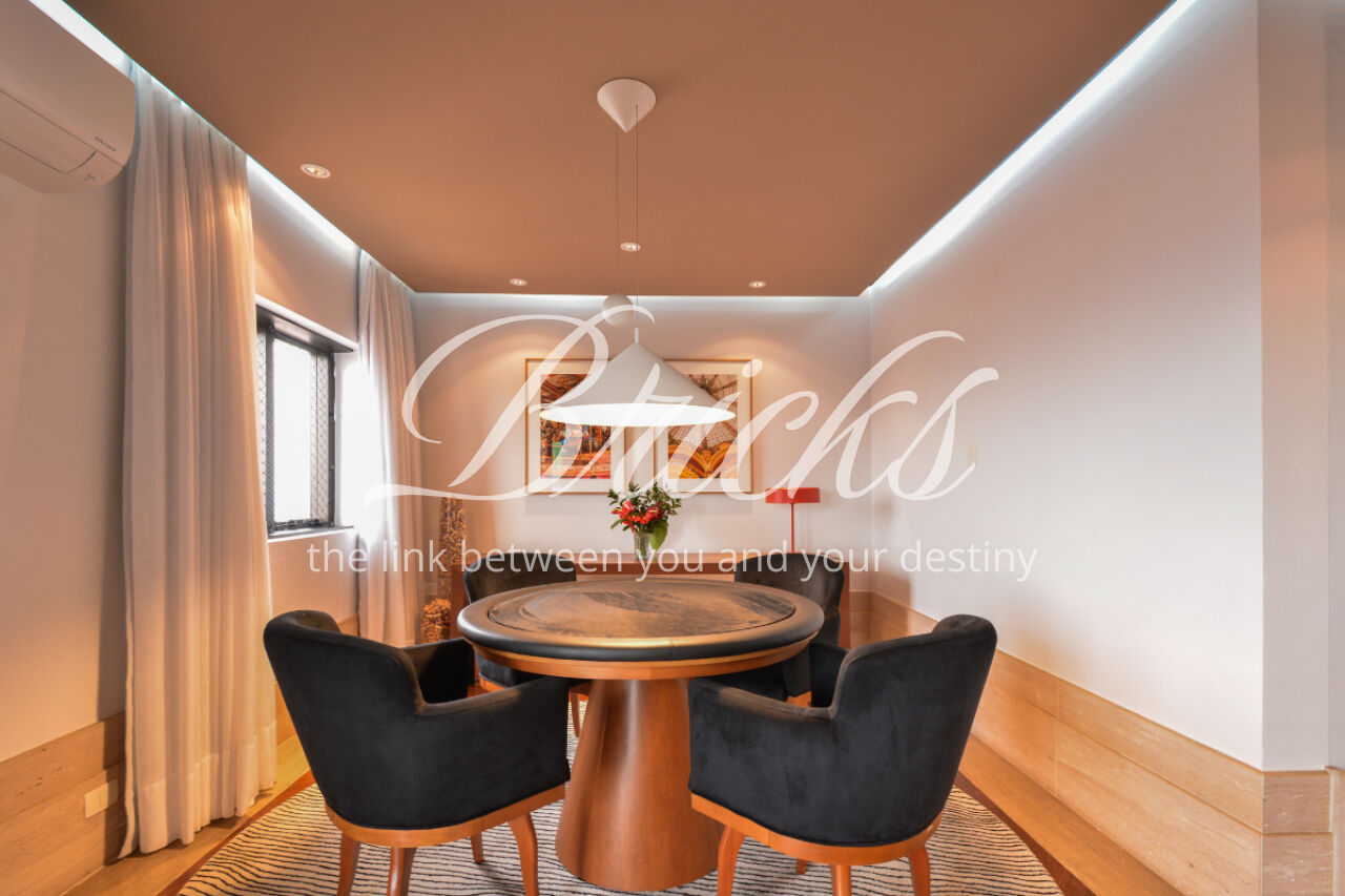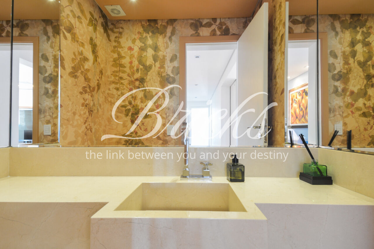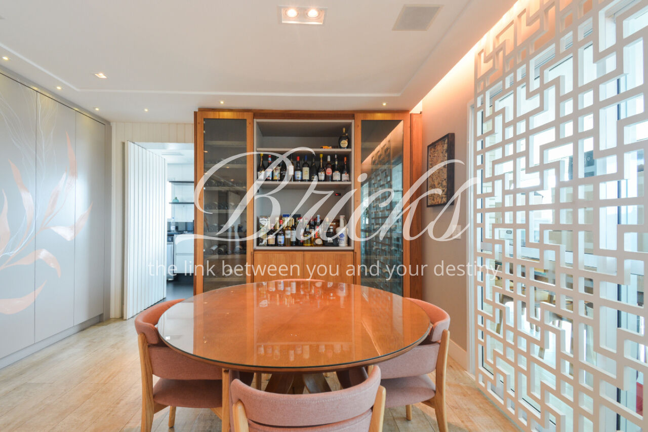 O imóvel está totalmente mobiliado e equipado, pronto para morar, e dispõe de quatro suítes amplas, todas com varanda, ar-condicionado, closet e armários em madeira maciça, sendo que três delas contam com banheira. A sala de estar, com impressionantes 80m², é integrada a três varandas que proporcionam luminosidade em todas as faces do apartamento, enquanto o hall de entrada e os rodapés da sala foram finalizados em mármore Travertino, reforçando o padrão de sofisticação. A cozinha e a área de serviço Kitchens apresentam acabamentos de altíssimo nível e, como diferencial, há uma adega de mármore com capacidade para 220 garrafas, projetada para manter sua coleção de vinhos sempre na temperatura ideal.