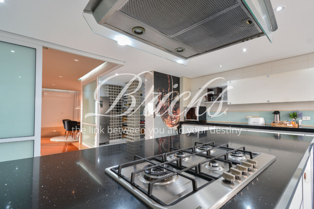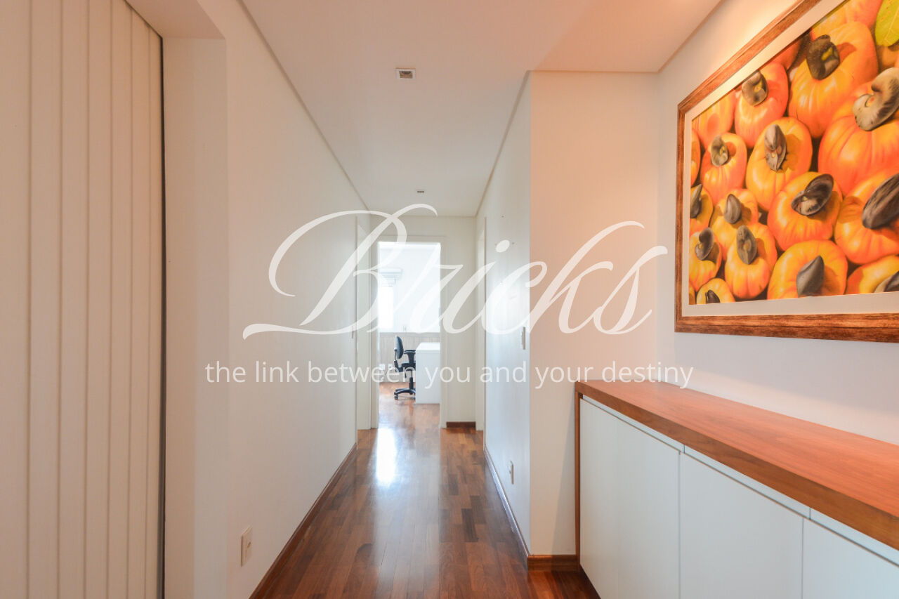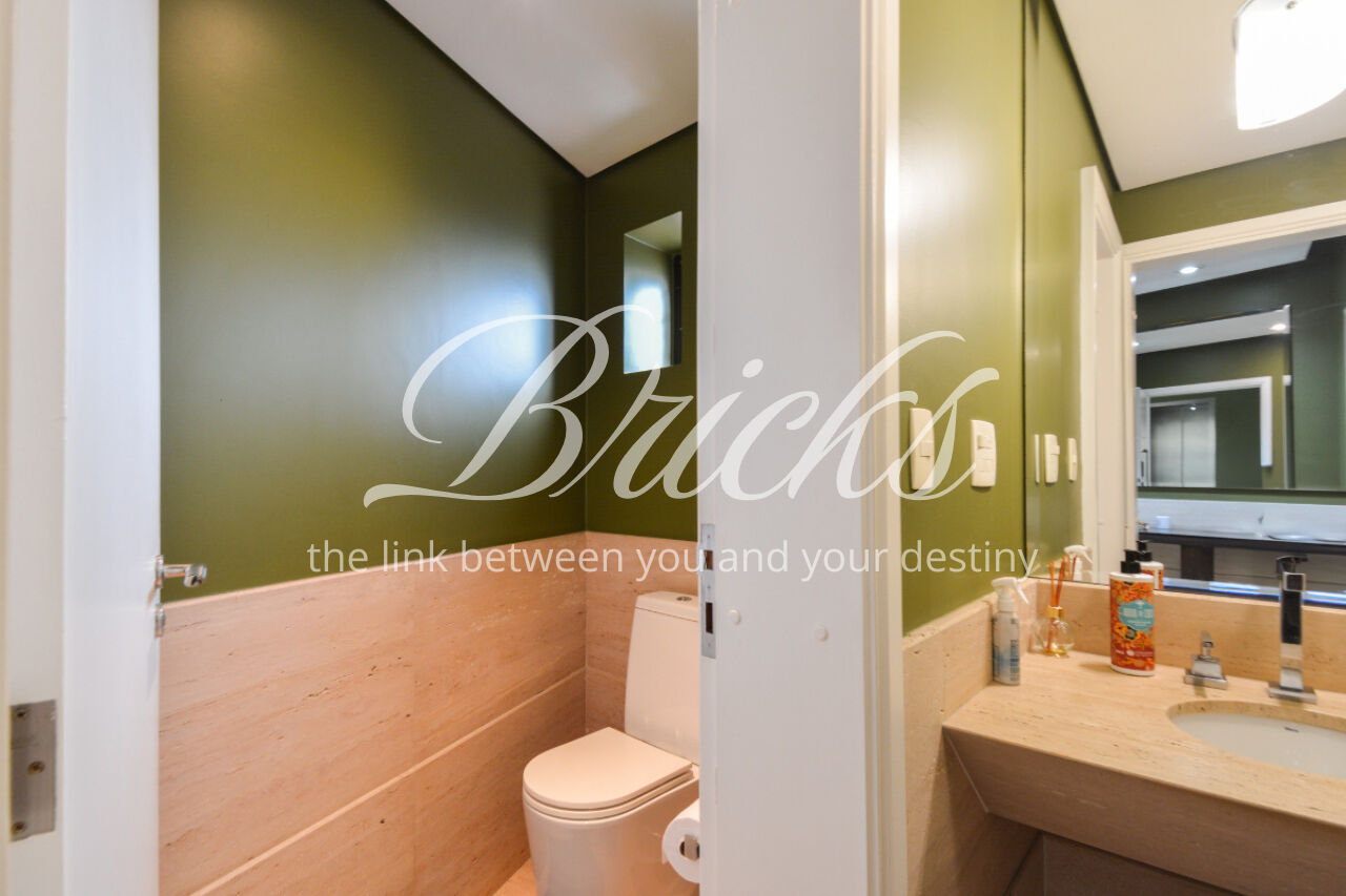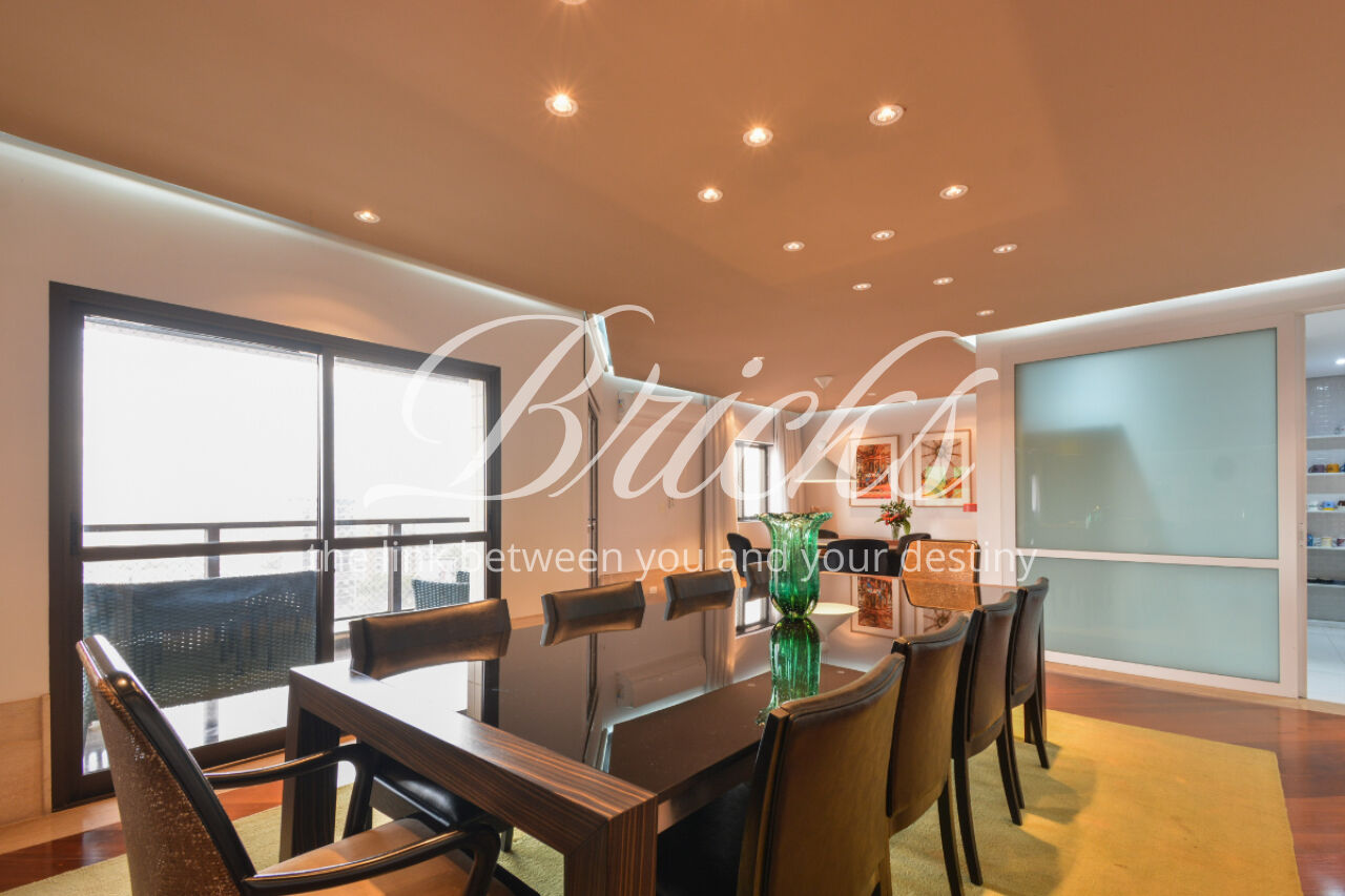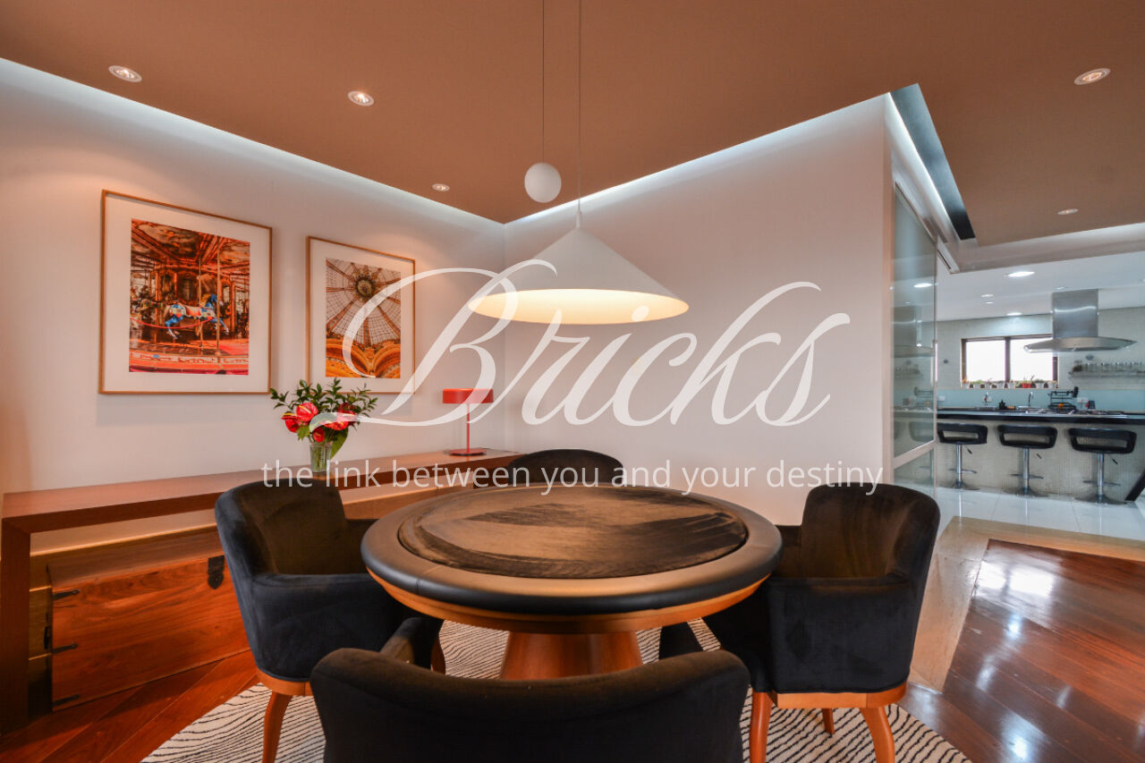 O imóvel está totalmente mobiliado e equipado, pronto para morar, e dispõe de quatro suítes amplas, todas com varanda, ar-condicionado, closet e armários em madeira maciça, sendo que três delas contam com banheira. A sala de estar, com impressionantes 80m², é integrada a três varandas que proporcionam luminosidade em todas as faces do apartamento, enquanto o hall de entrada e os rodapés da sala foram finalizados em mármore Travertino, reforçando o padrão de sofisticação. A cozinha e a área de serviço Kitchens apresentam acabamentos de altíssimo nível e, como diferencial, há uma adega de mármore com capacidade para 220 garrafas, projetada para manter sua coleção de vinhos sempre na temperatura ideal.