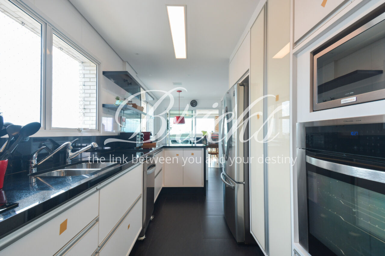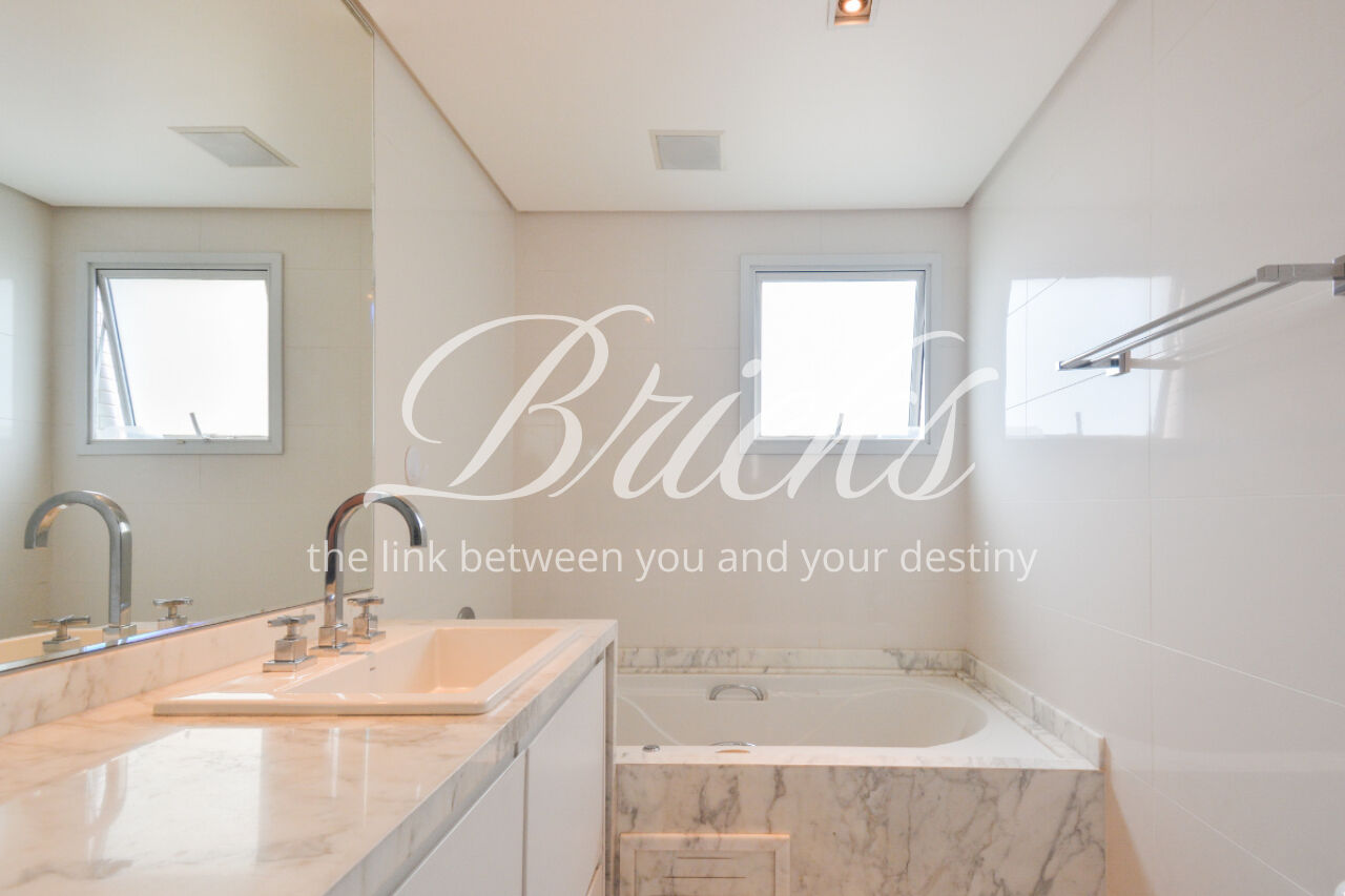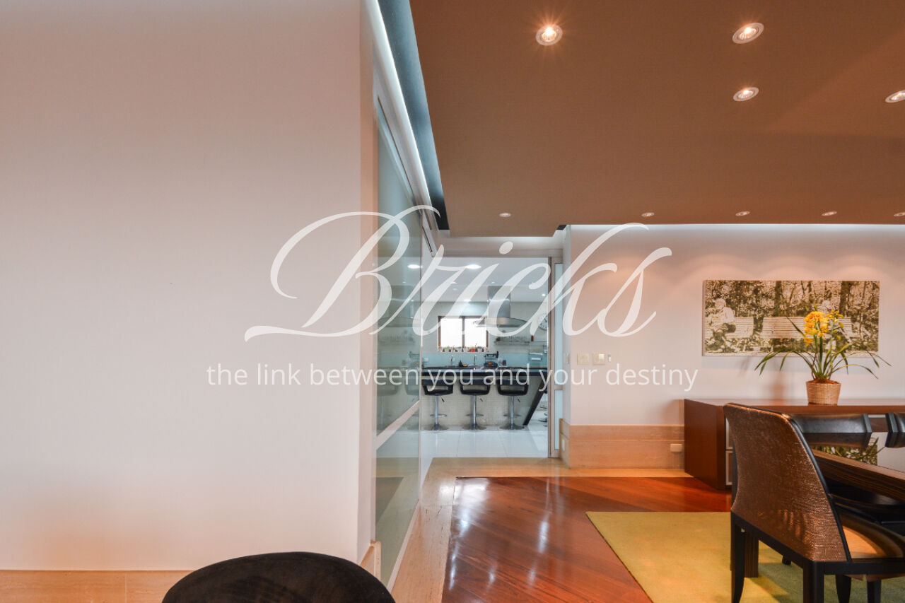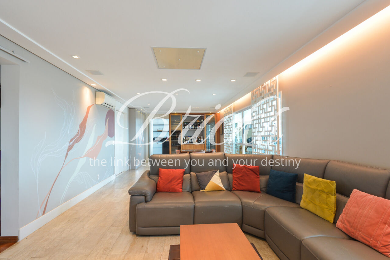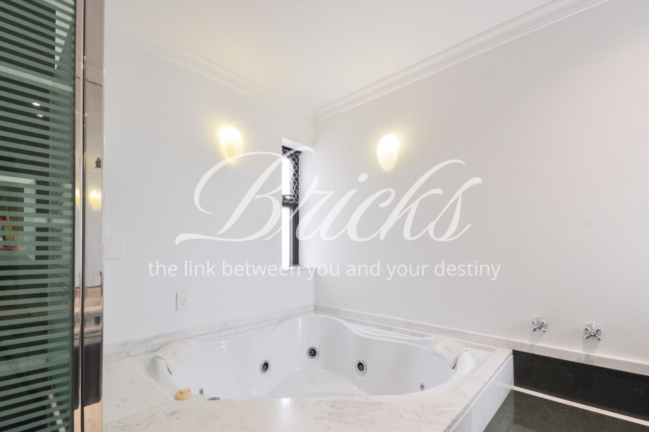 O imóvel está totalmente mobiliado e equipado, pronto para morar, e dispõe de quatro suítes amplas, todas com varanda, ar-condicionado, closet e armários em madeira maciça, sendo que três delas contam com banheira. A sala de estar, com impressionantes 80m², é integrada a três varandas que proporcionam luminosidade em todas as faces do apartamento, enquanto o hall de entrada e os rodapés da sala foram finalizados em mármore Travertino, reforçando o padrão de sofisticação. A cozinha e a área de serviço Kitchens apresentam acabamentos de altíssimo nível e, como diferencial, há uma adega de mármore com capacidade para 220 garrafas, projetada para manter sua coleção de vinhos sempre na temperatura ideal.