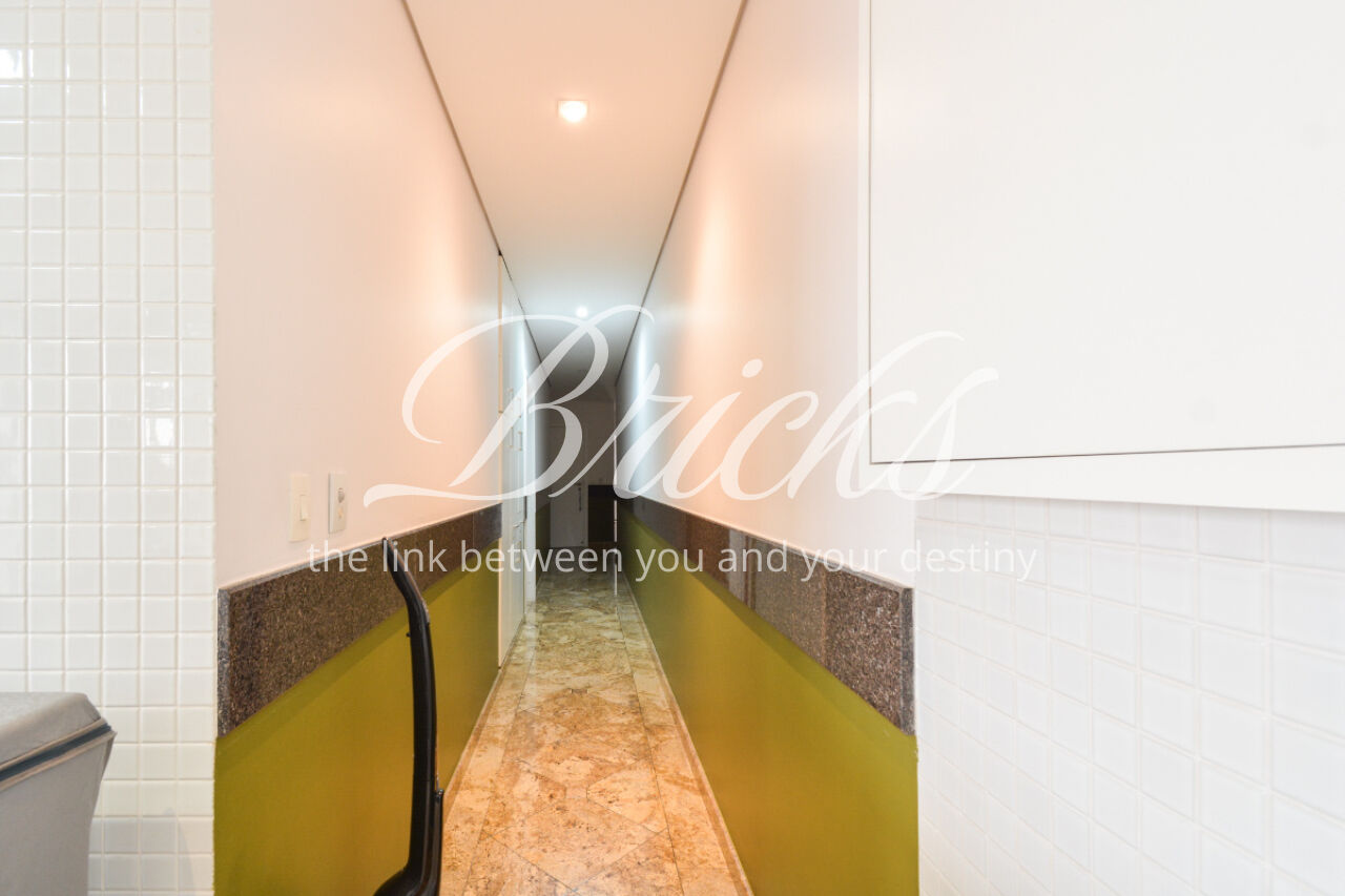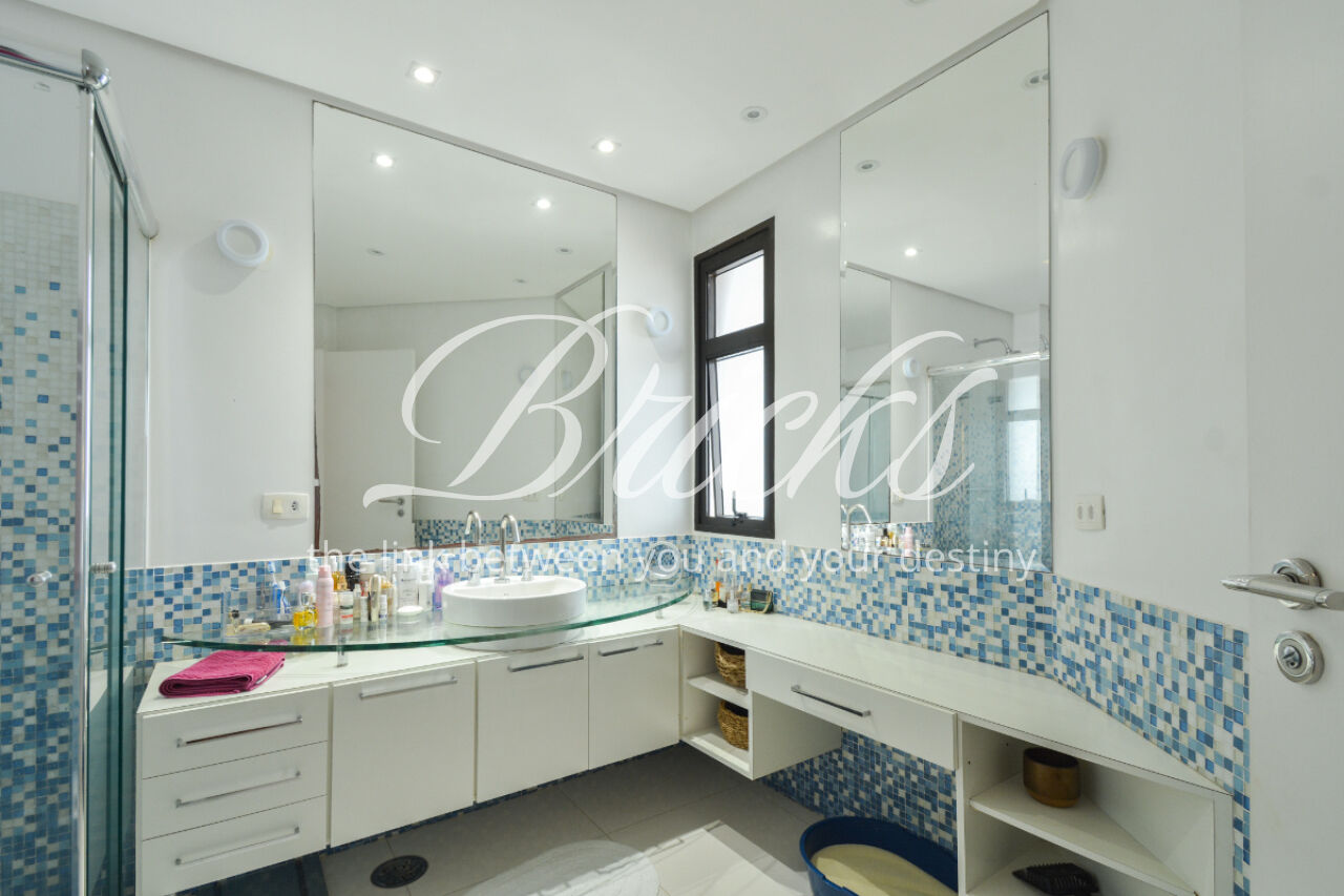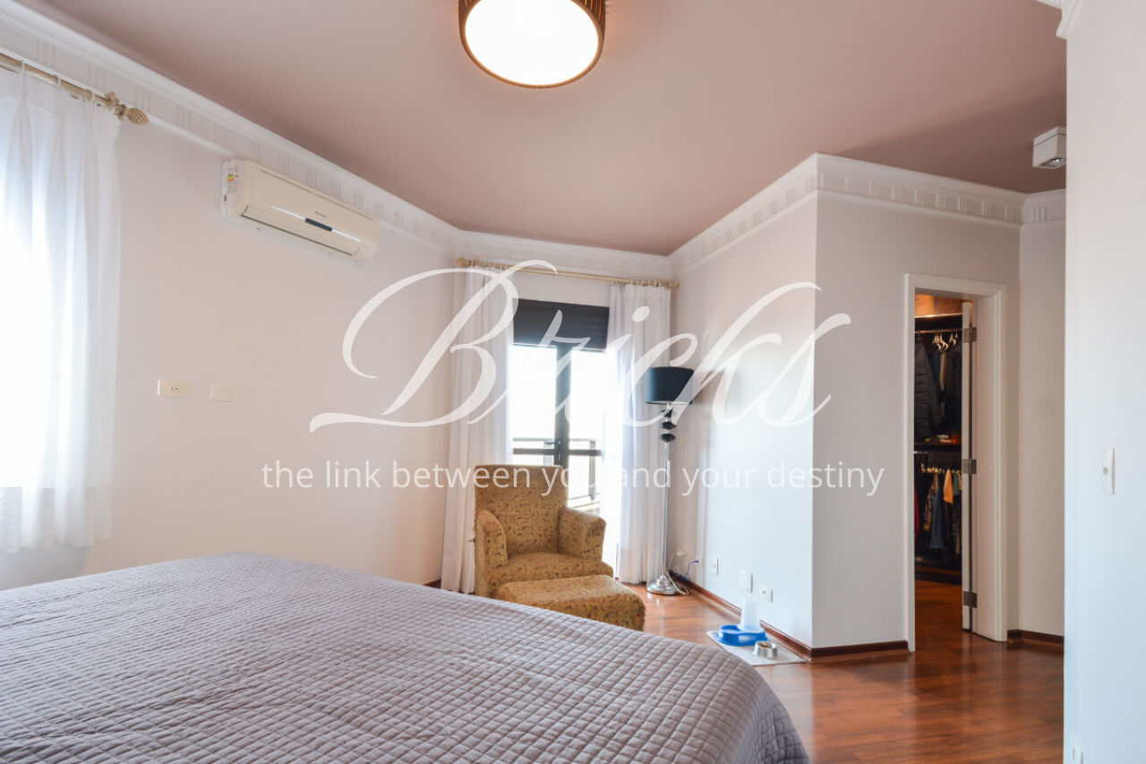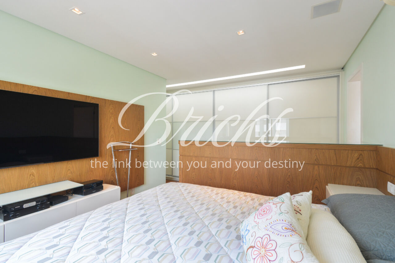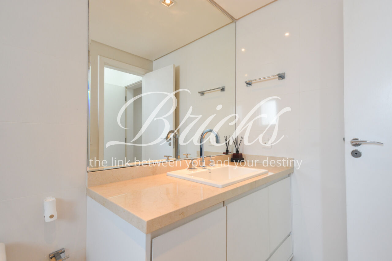 O imóvel está totalmente mobiliado e equipado, pronto para morar, e dispõe de quatro suítes amplas, todas com varanda, ar-condicionado, closet e armários em madeira maciça, sendo que três delas contam com banheira. A sala de estar, com impressionantes 80m², é integrada a três varandas que proporcionam luminosidade em todas as faces do apartamento, enquanto o hall de entrada e os rodapés da sala foram finalizados em mármore Travertino, reforçando o padrão de sofisticação. A cozinha e a área de serviço Kitchens apresentam acabamentos de altíssimo nível e, como diferencial, há uma adega de mármore com capacidade para 220 garrafas, projetada para manter sua coleção de vinhos sempre na temperatura ideal.