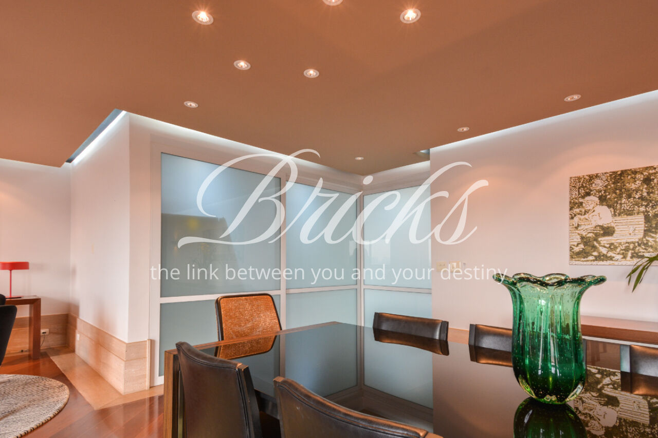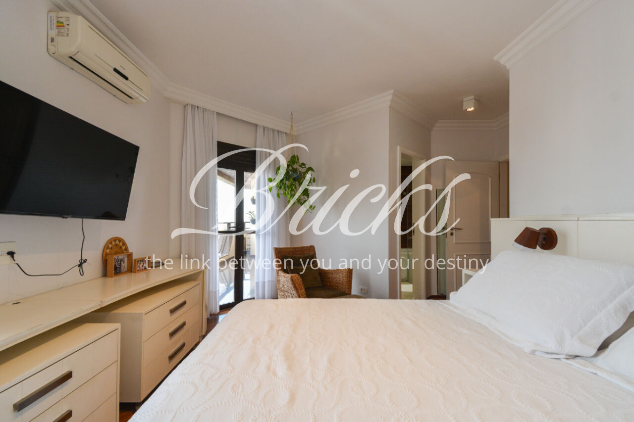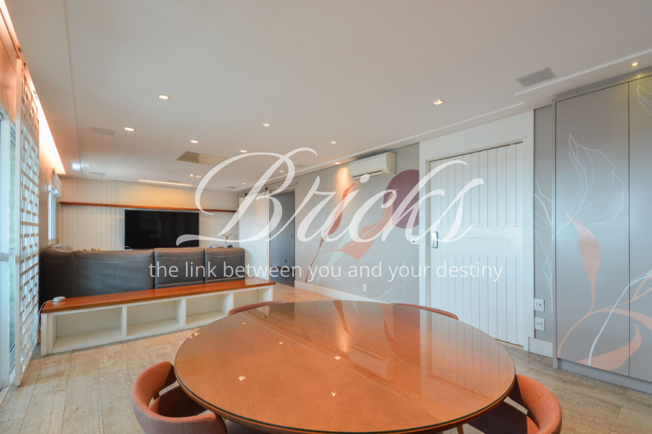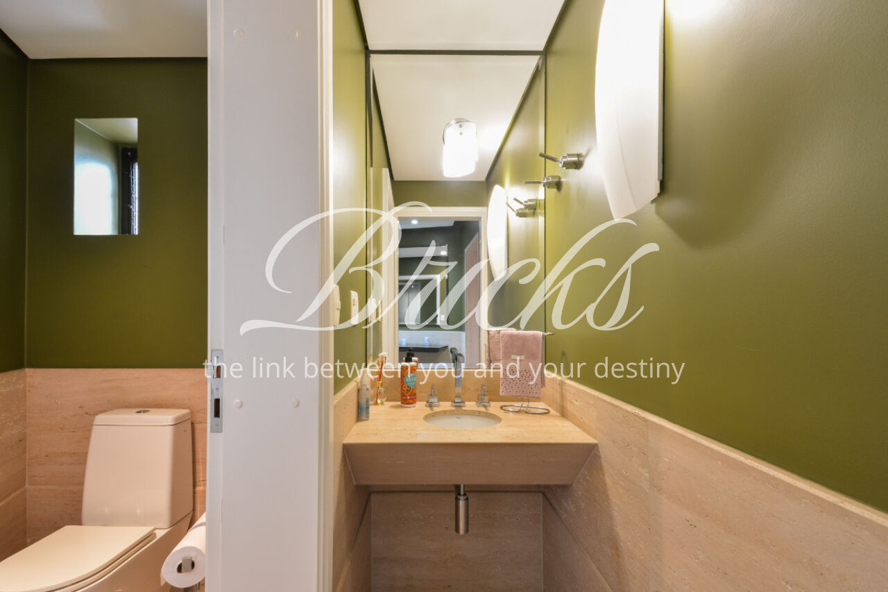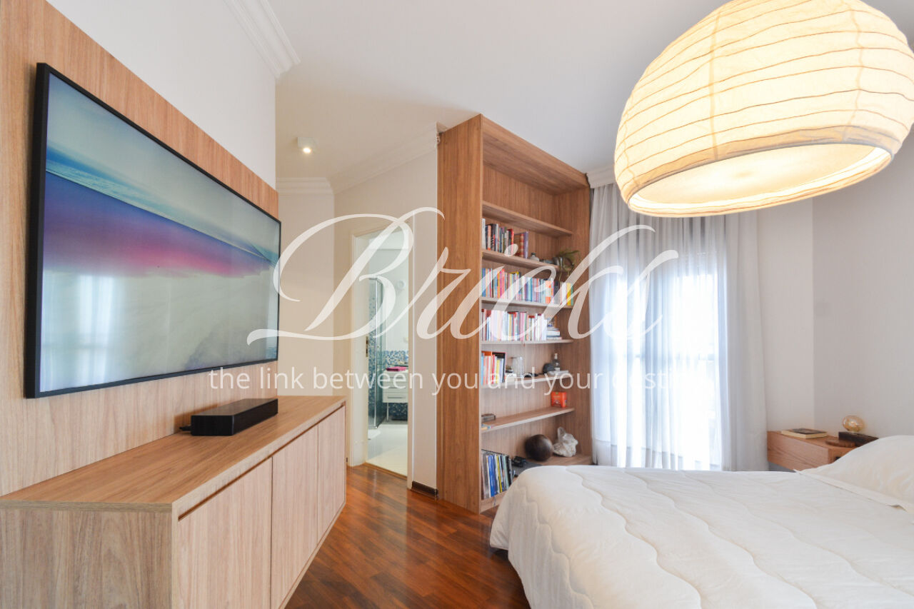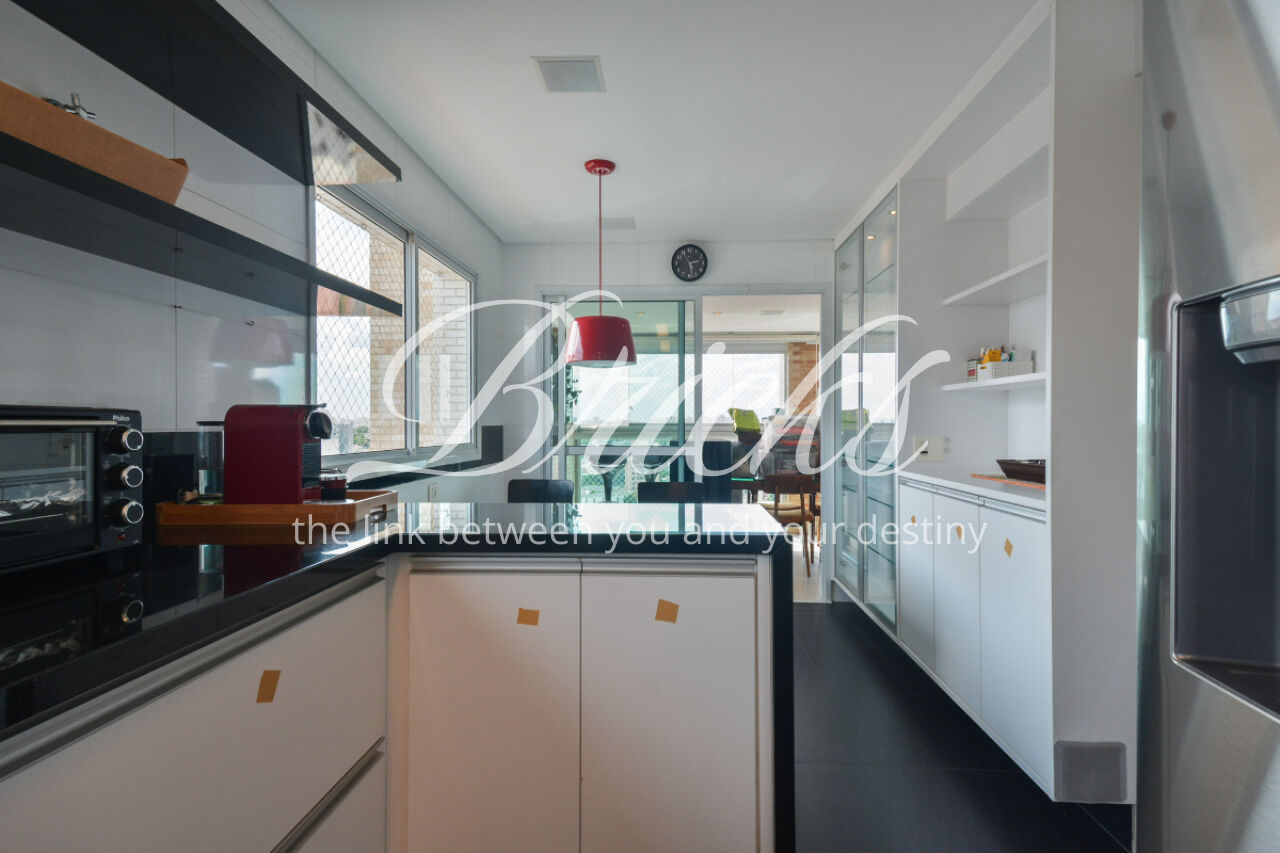 O imóvel está totalmente mobiliado e equipado, pronto para morar, e dispõe de quatro suítes amplas, todas com varanda, ar-condicionado, closet e armários em madeira maciça, sendo que três delas contam com banheira. A sala de estar, com impressionantes 80m², é integrada a três varandas que proporcionam luminosidade em todas as faces do apartamento, enquanto o hall de entrada e os rodapés da sala foram finalizados em mármore Travertino, reforçando o padrão de sofisticação. A cozinha e a área de serviço Kitchens apresentam acabamentos de altíssimo nível e, como diferencial, há uma adega de mármore com capacidade para 220 garrafas, projetada para manter sua coleção de vinhos sempre na temperatura ideal.