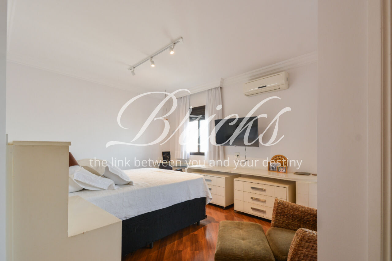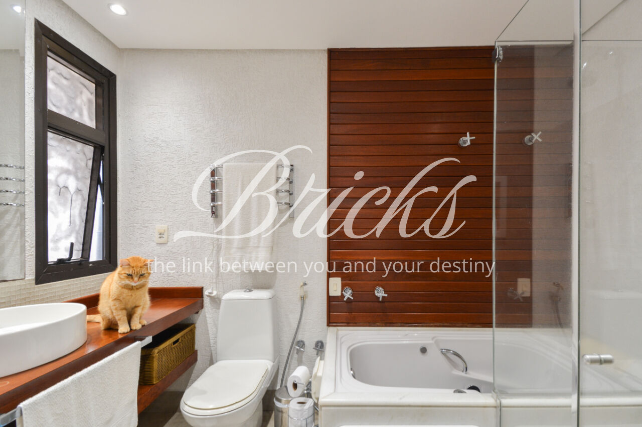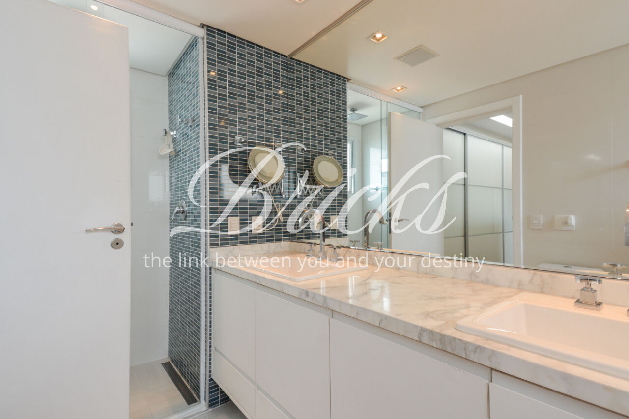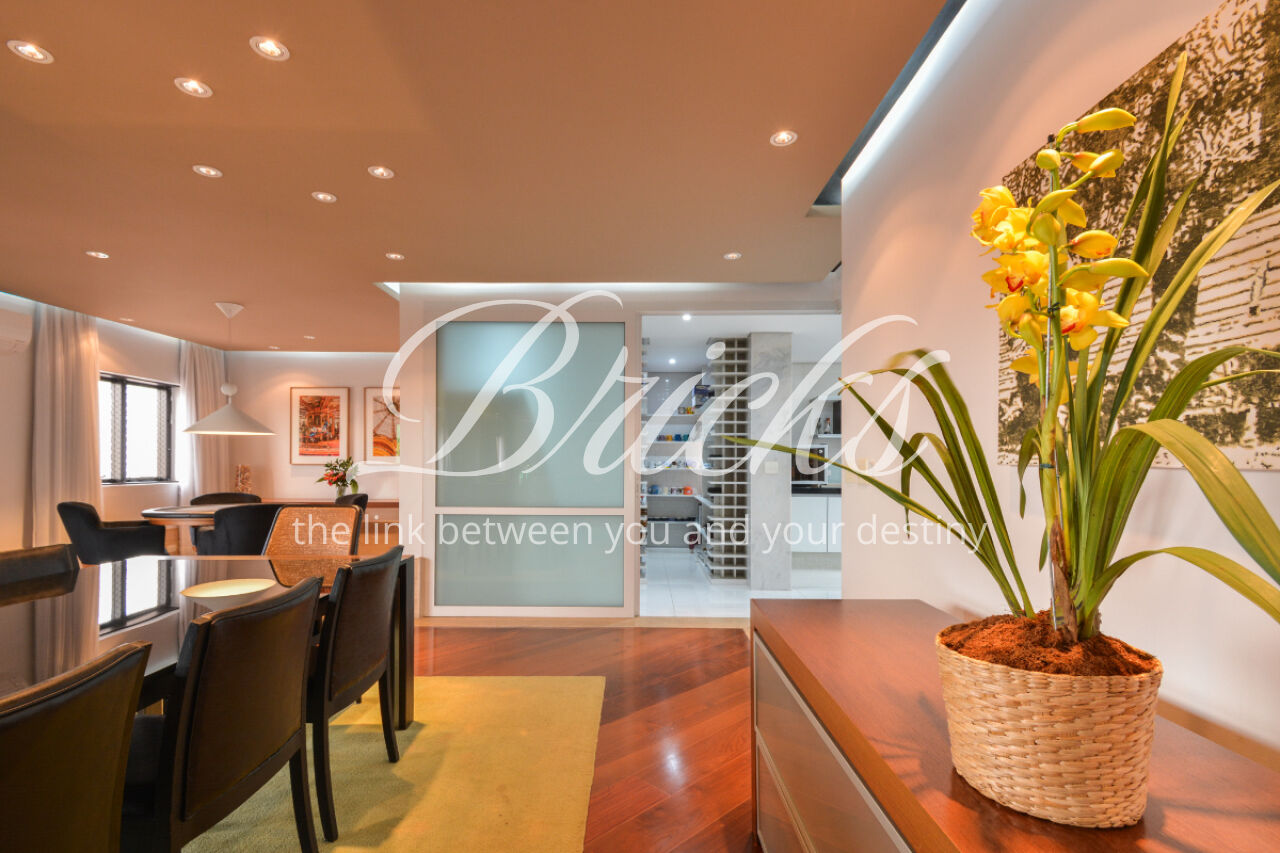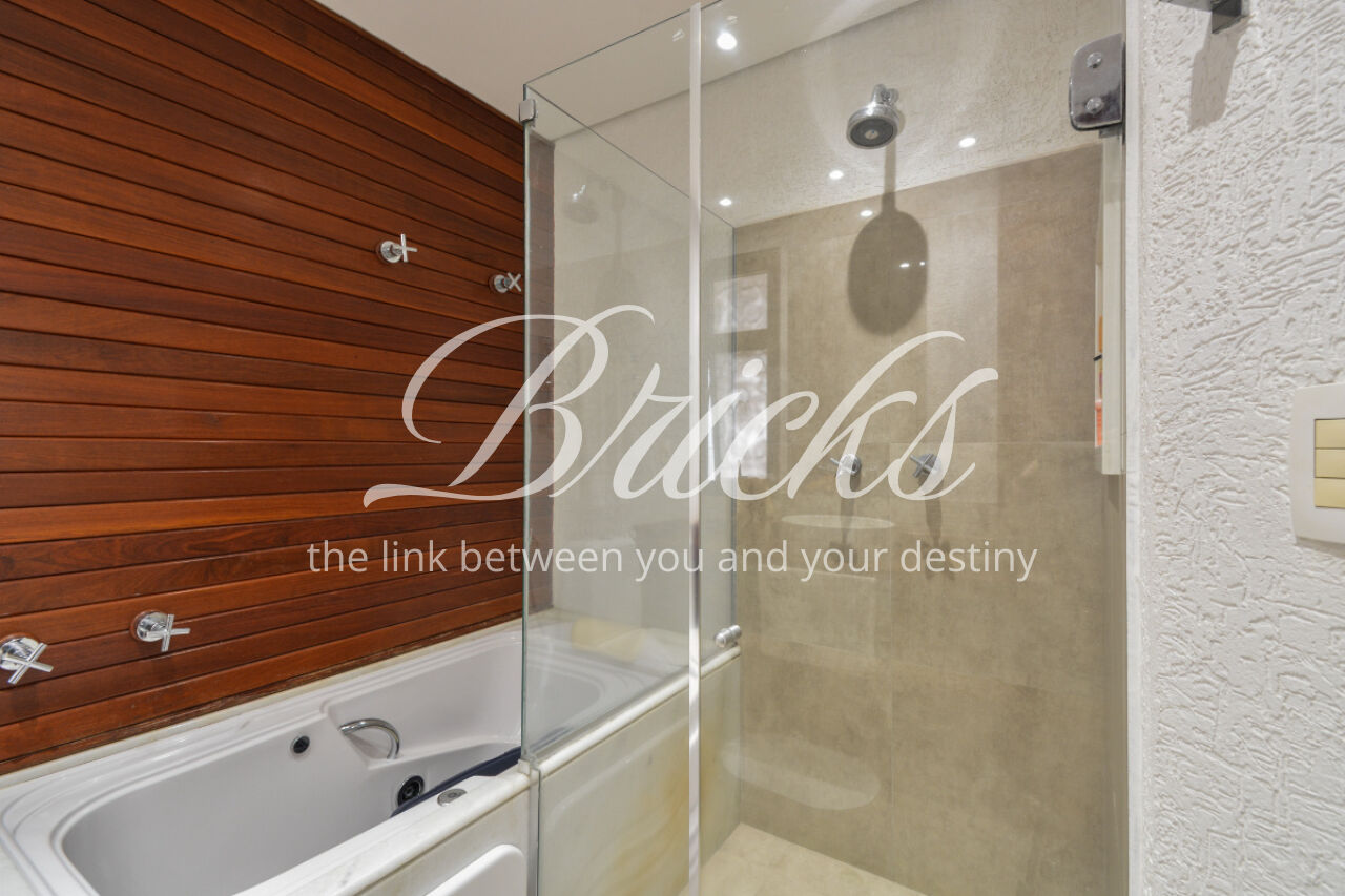 O imóvel está totalmente mobiliado e equipado, pronto para morar, e dispõe de quatro suítes amplas, todas com varanda, ar-condicionado, closet e armários em madeira maciça, sendo que três delas contam com banheira. A sala de estar, com impressionantes 80m², é integrada a três varandas que proporcionam luminosidade em todas as faces do apartamento, enquanto o hall de entrada e os rodapés da sala foram finalizados em mármore Travertino, reforçando o padrão de sofisticação. A cozinha e a área de serviço Kitchens apresentam acabamentos de altíssimo nível e, como diferencial, há uma adega de mármore com capacidade para 220 garrafas, projetada para manter sua coleção de vinhos sempre na temperatura ideal.