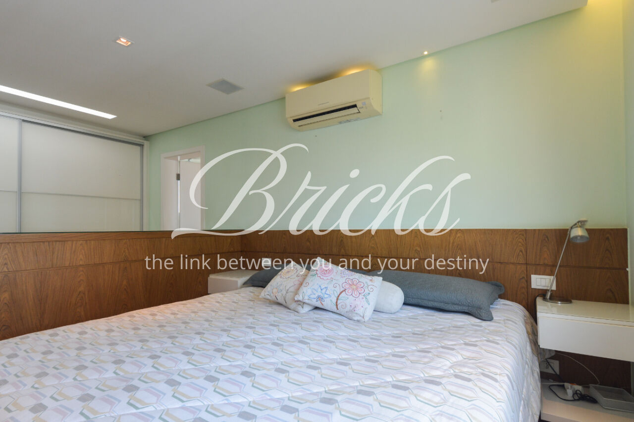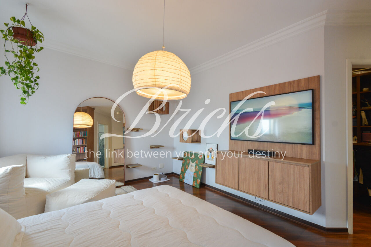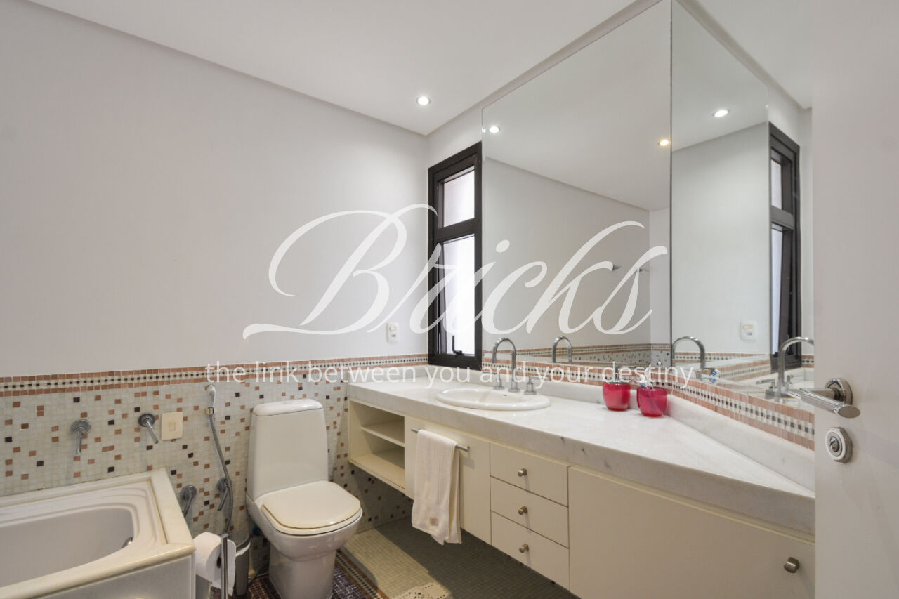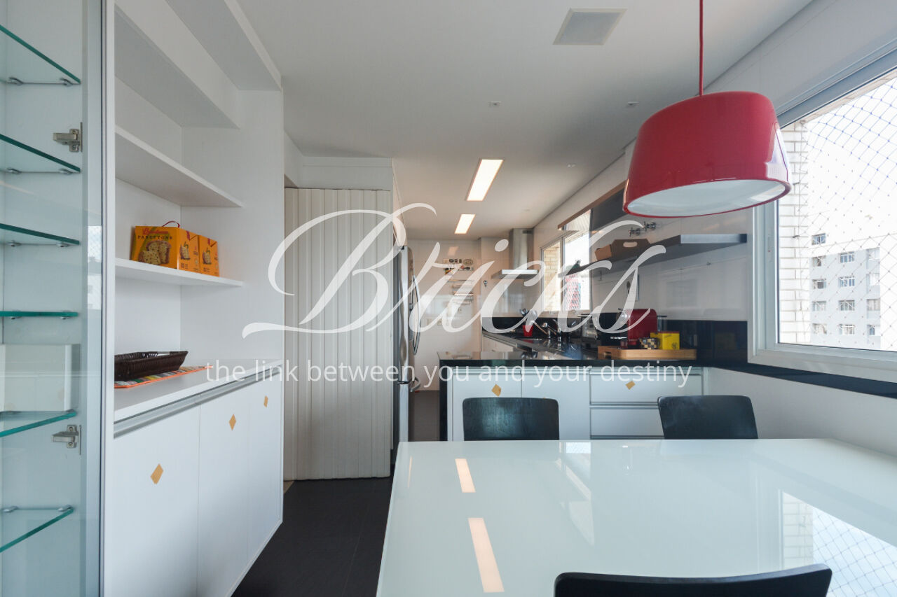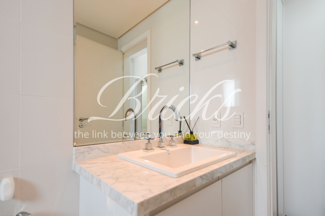 O imóvel está totalmente mobiliado e equipado, pronto para morar, e dispõe de quatro suítes amplas, todas com varanda, ar-condicionado, closet e armários em madeira maciça, sendo que três delas contam com banheira. A sala de estar, com impressionantes 80m², é integrada a três varandas que proporcionam luminosidade em todas as faces do apartamento, enquanto o hall de entrada e os rodapés da sala foram finalizados em mármore Travertino, reforçando o padrão de sofisticação. A cozinha e a área de serviço Kitchens apresentam acabamentos de altíssimo nível e, como diferencial, há uma adega de mármore com capacidade para 220 garrafas, projetada para manter sua coleção de vinhos sempre na temperatura ideal.