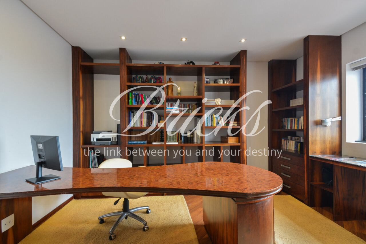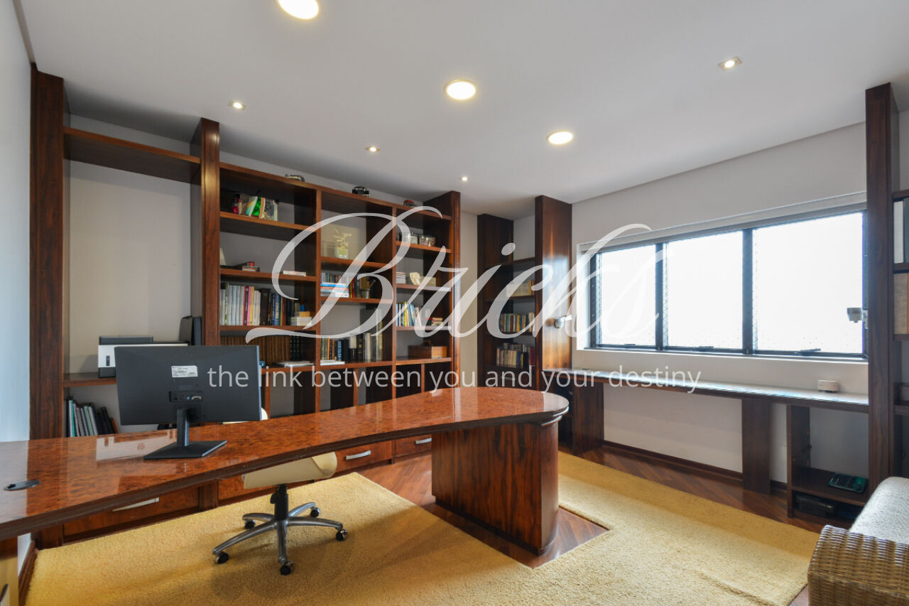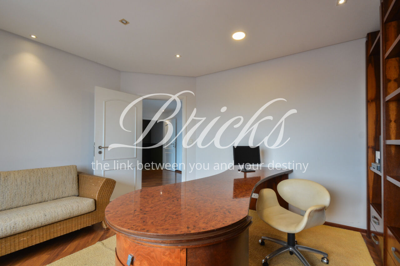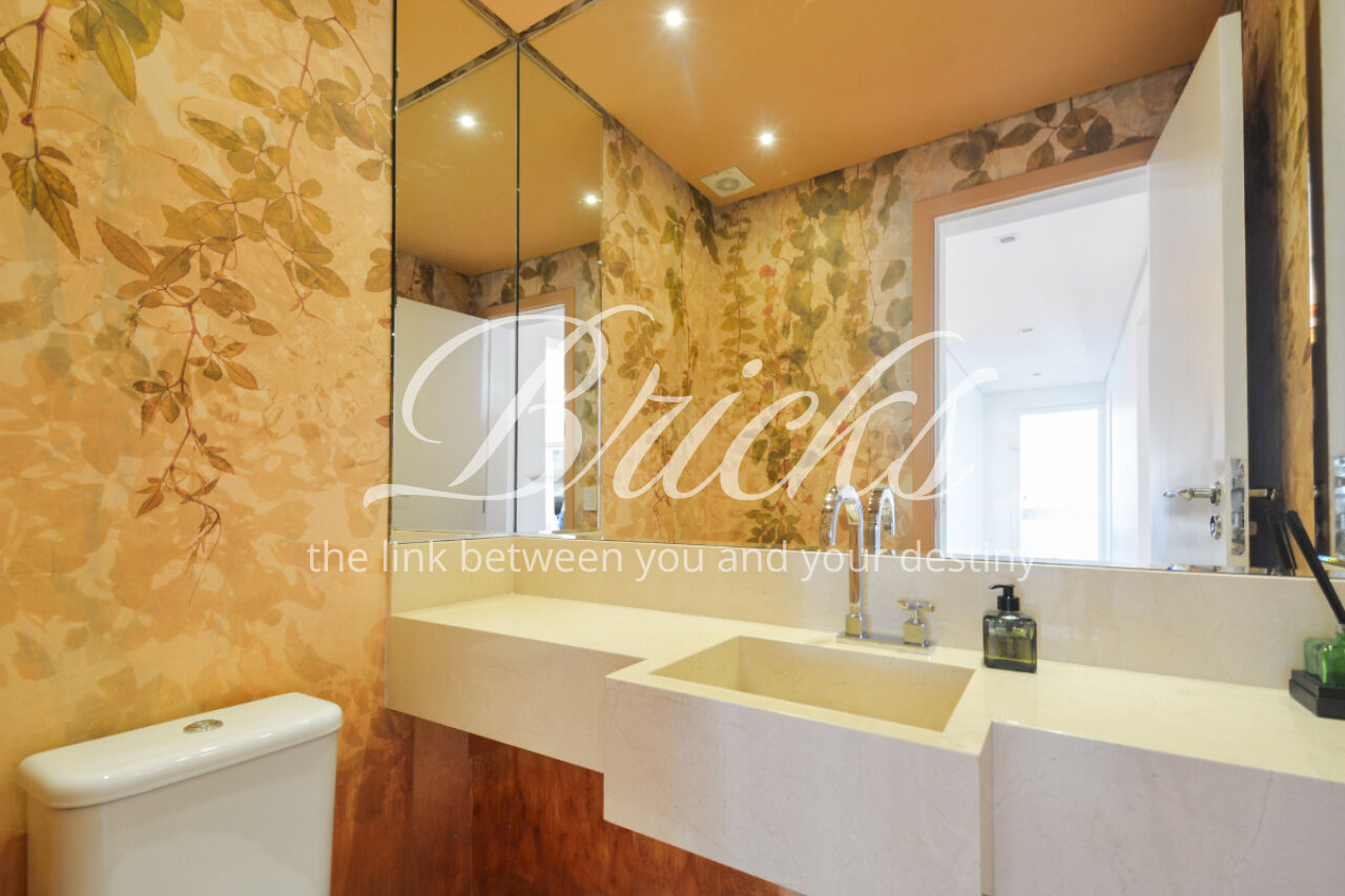 O espaço também oferece escritório, sala de TV íntima e um home Theather totalmente equipado com estrutura para telão, além de um aconchegante jardim de inverno e uma cozinha gourmet com ilha central. A dependência de serviço é completa, com dois quartos, sala e banheiro, garantindo funcionalidade no dia a dia. Para maior comodidade, o apartamento possui quatro vagas de garagem, além de um box fechado com o tamanho de uma vaga.