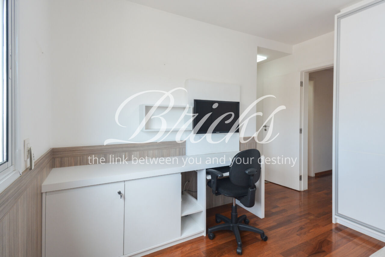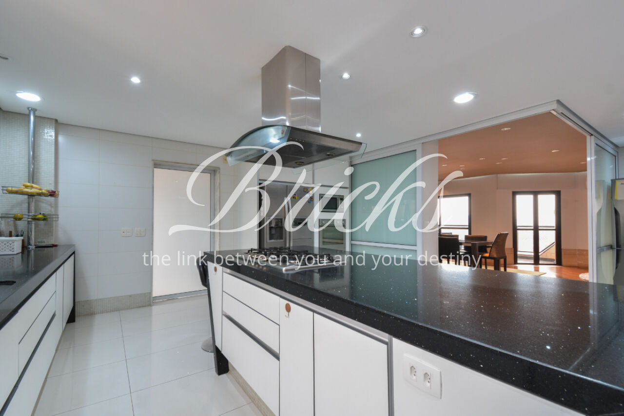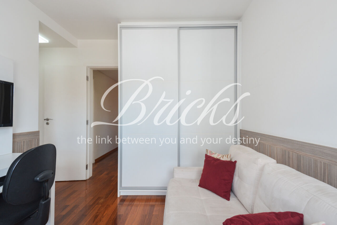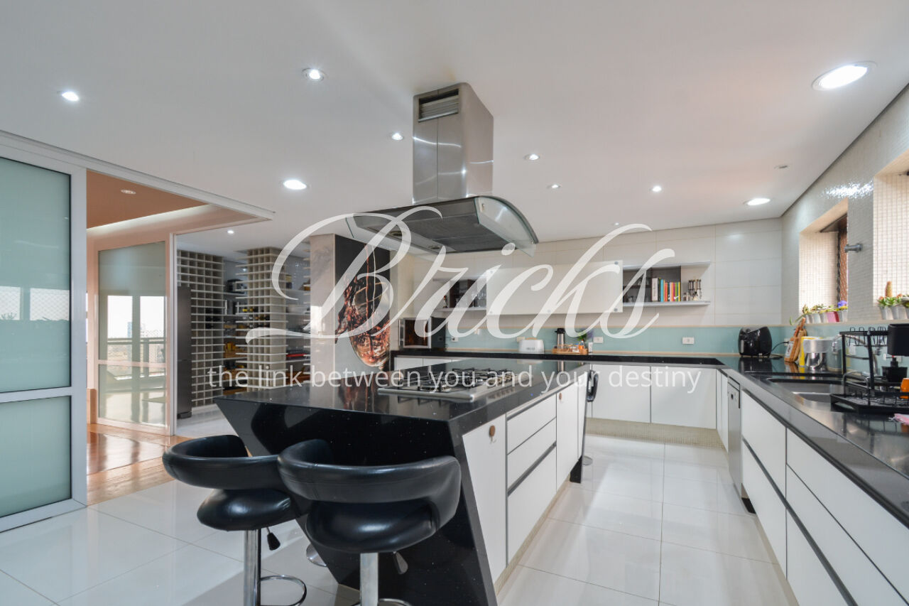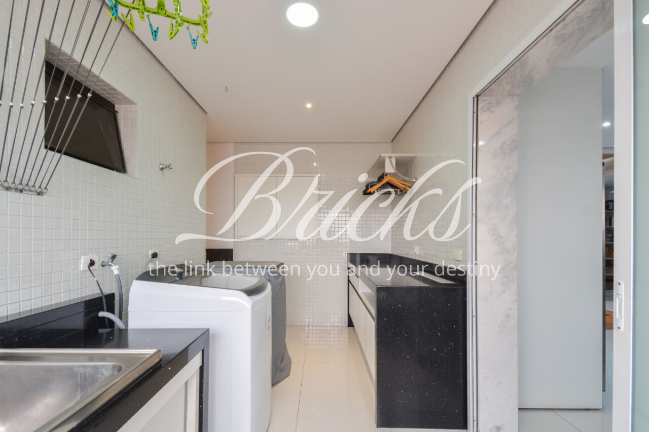 O espaço também oferece escritório, sala de TV íntima e um home Theather totalmente equipado com estrutura para telão, além de um aconchegante jardim de inverno e uma cozinha gourmet com ilha central. A dependência de serviço é completa, com dois quartos, sala e banheiro, garantindo funcionalidade no dia a dia. Para maior comodidade, o apartamento possui quatro vagas de garagem, além de um box fechado com o tamanho de uma vaga.