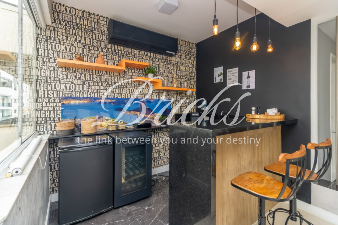 No andar superior, a cobertura se destaca por um espaço amplo e versátil, ideal para receber amigos e familiares. O ambiente conta com bar, sala de TV e está fechada com vidro, dando mais conforto aos moradores sem abrir mão da iluminação natural. Um espaço que oferece inúmeras possibilidades de personalização e criação de novos ambientes.
