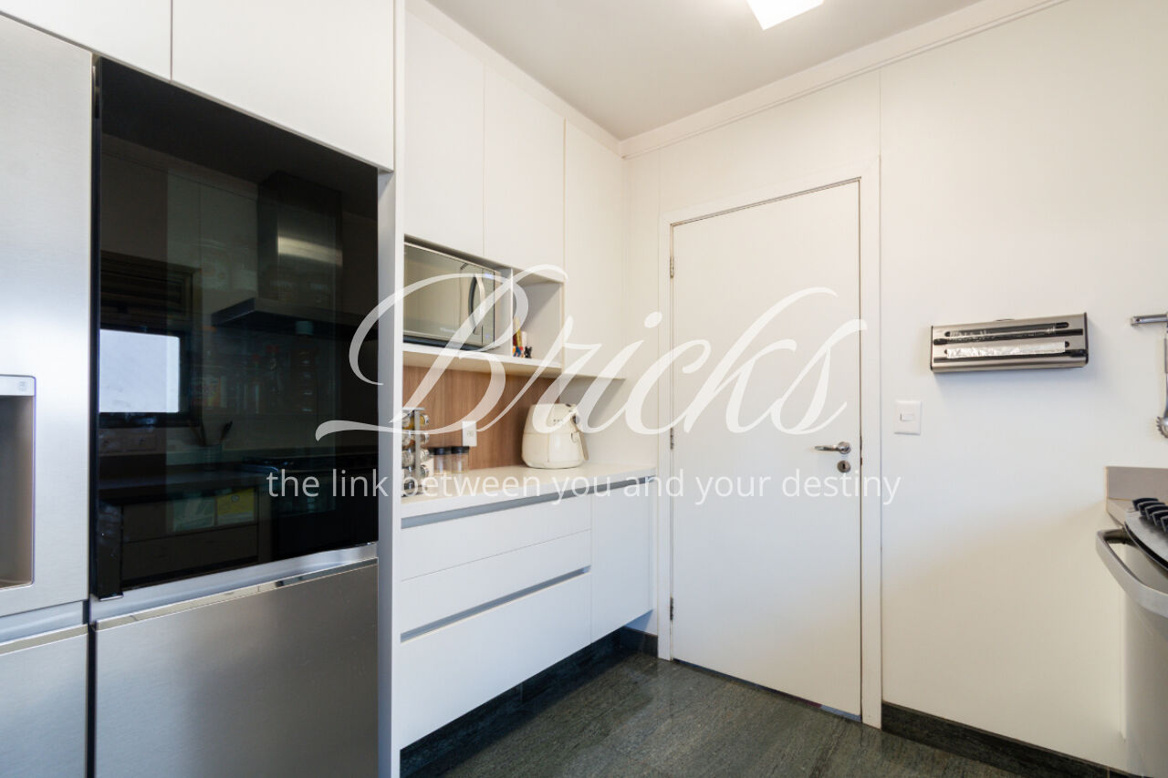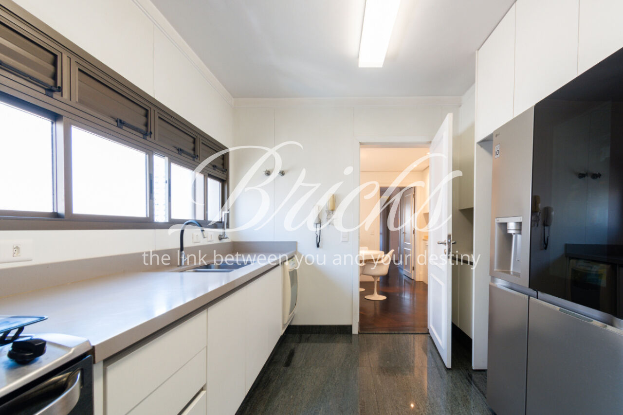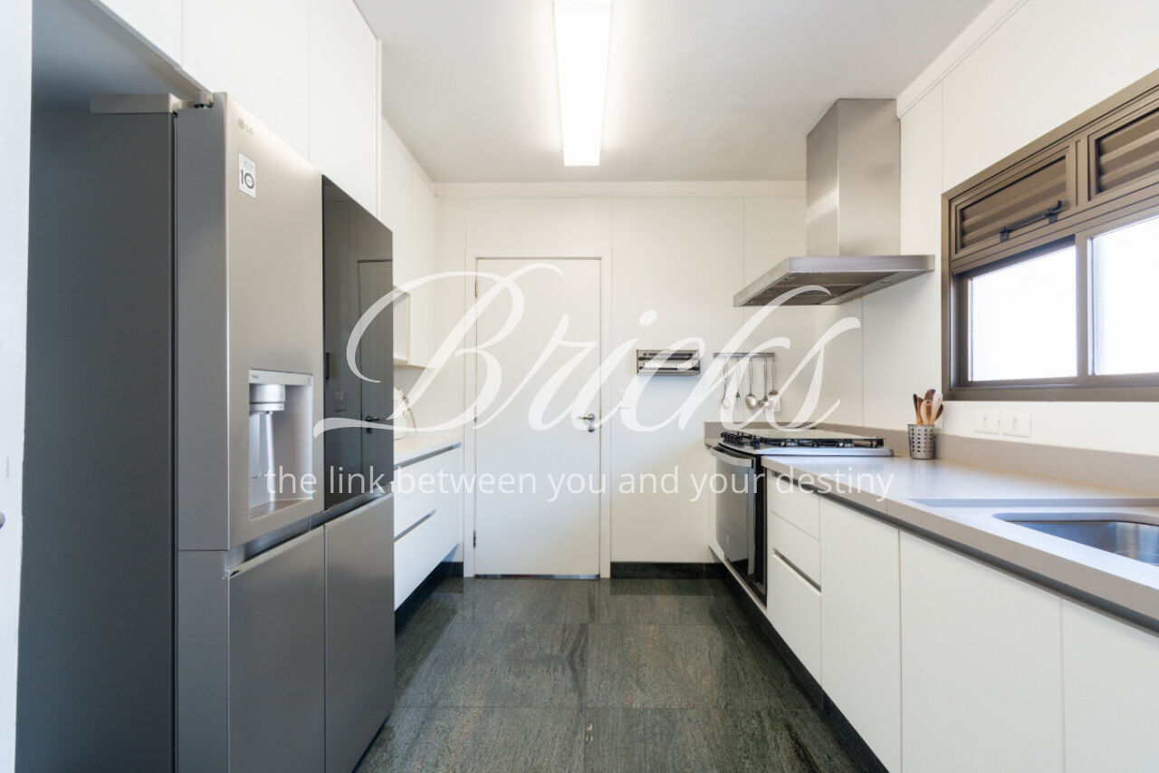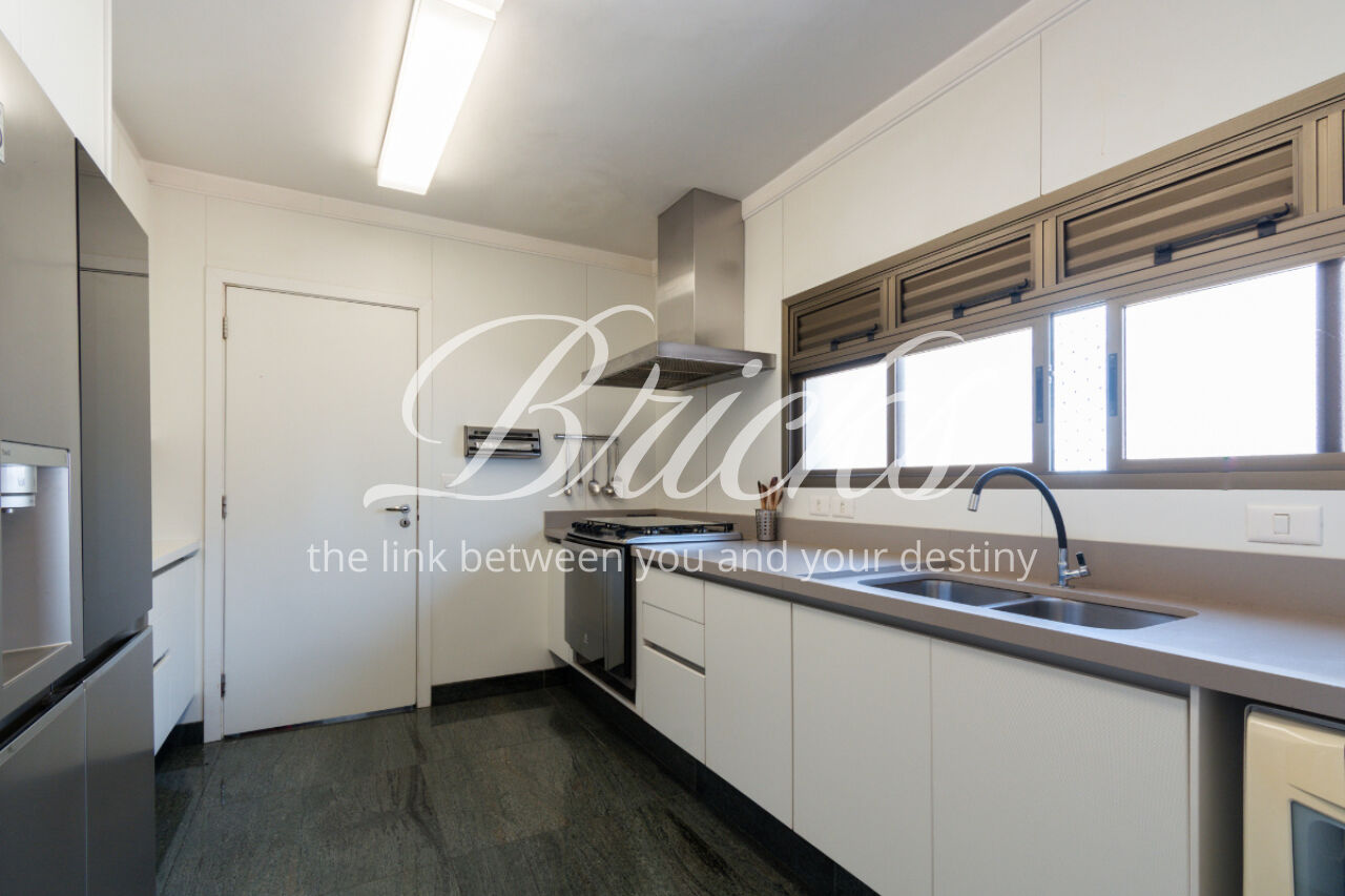 A cozinha é grande, equipada com armários Kitchens. A área de serviço é espaçosa e bem resolvida, com dormitório de empregada.