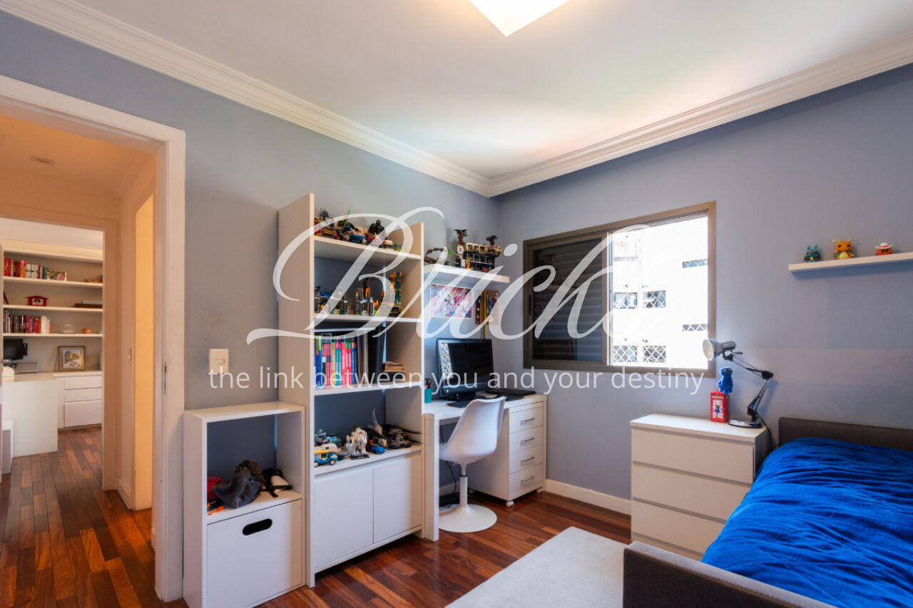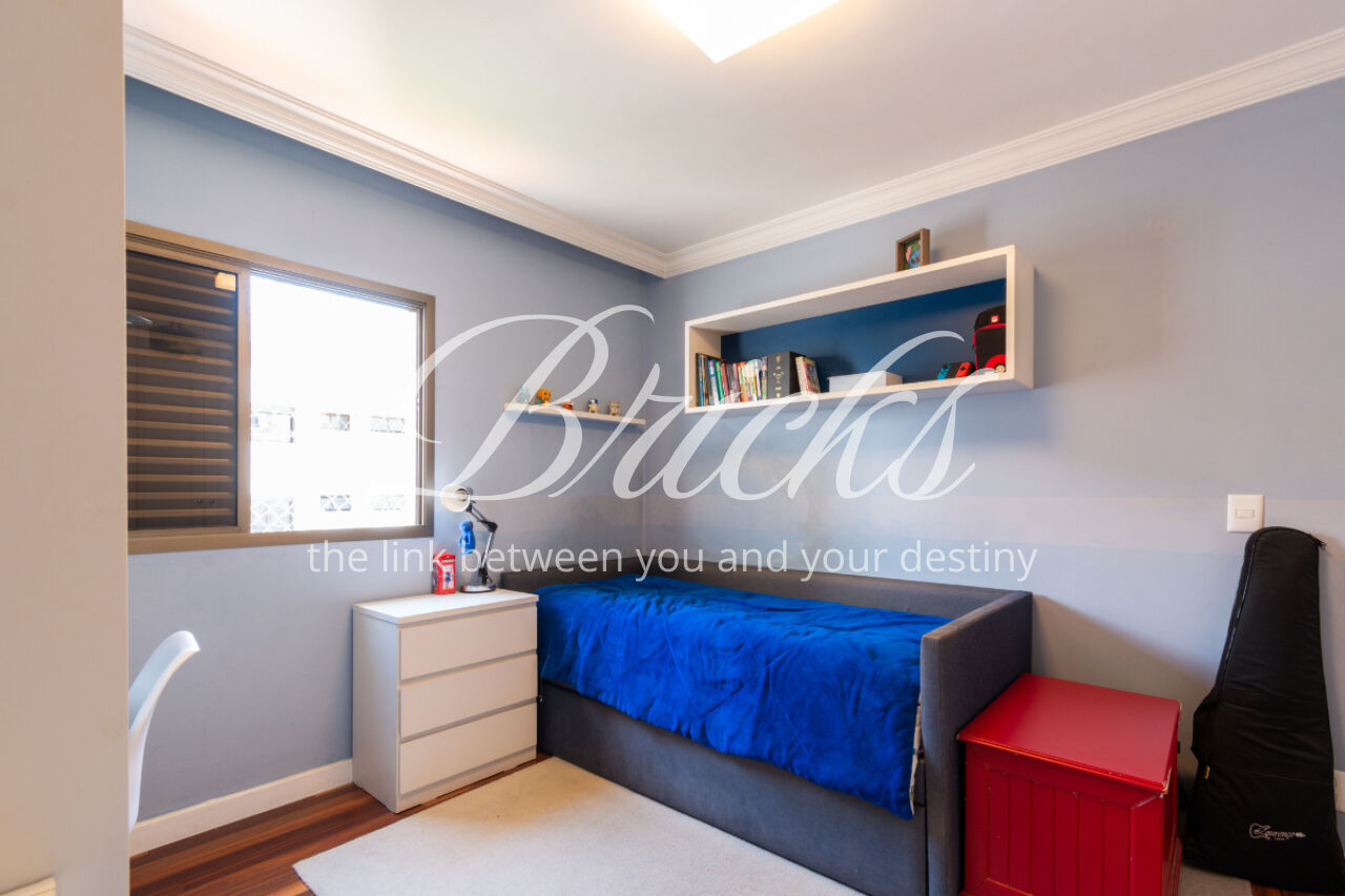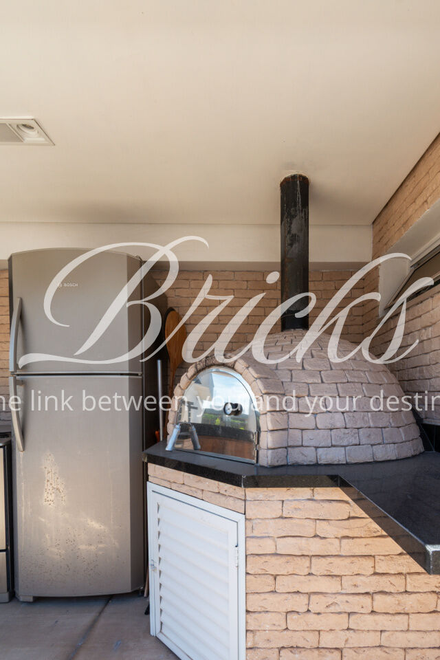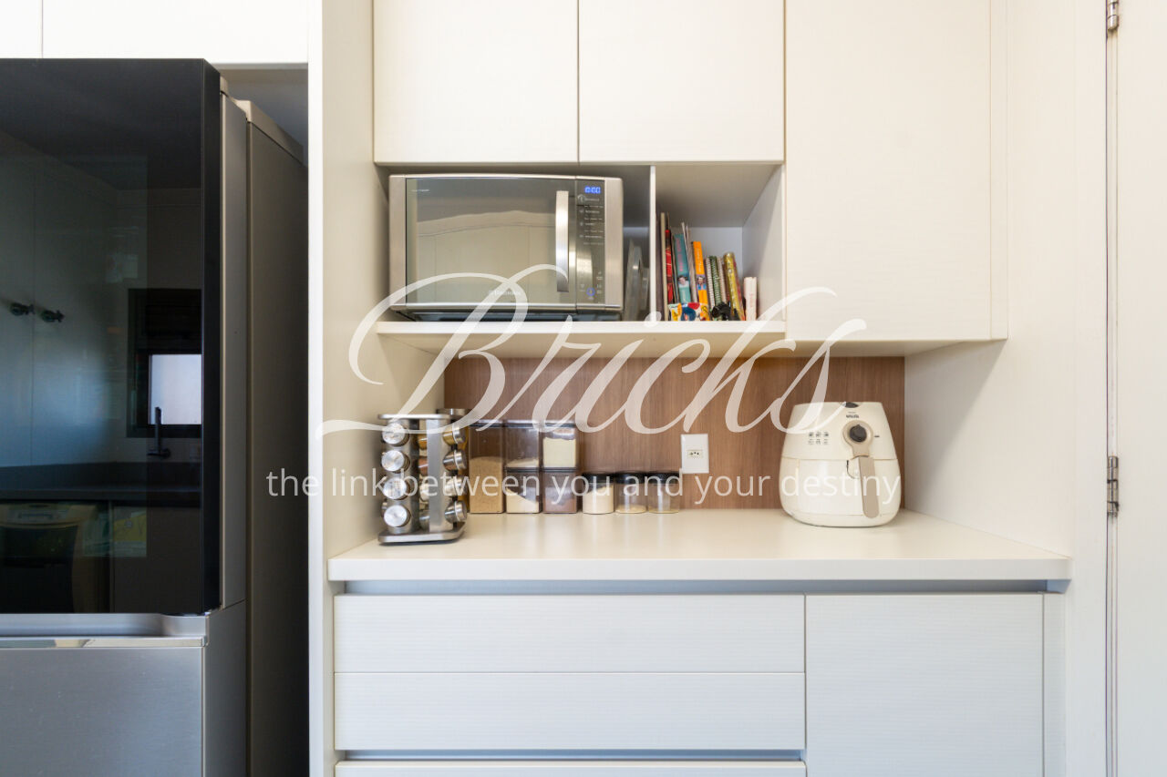 A cozinha é grande, equipada com armários Kitchens. A área de serviço é espaçosa e bem resolvida, com dormitório de empregada.